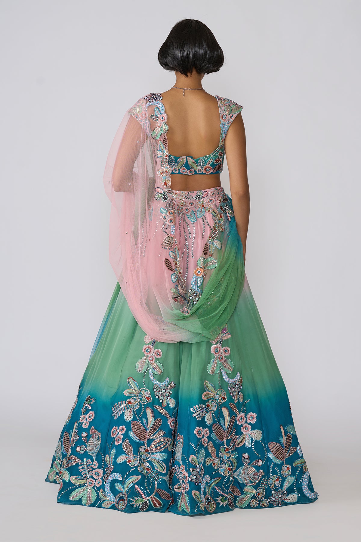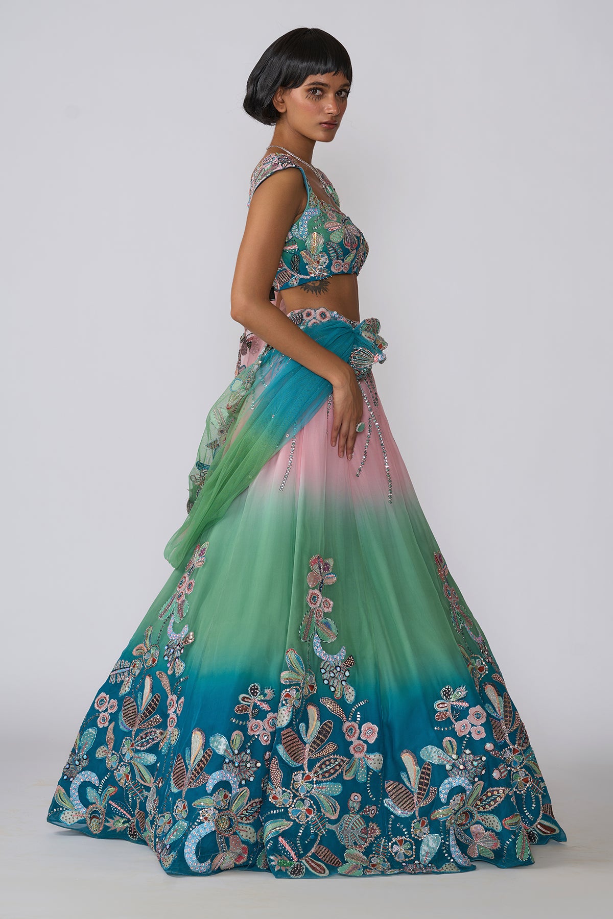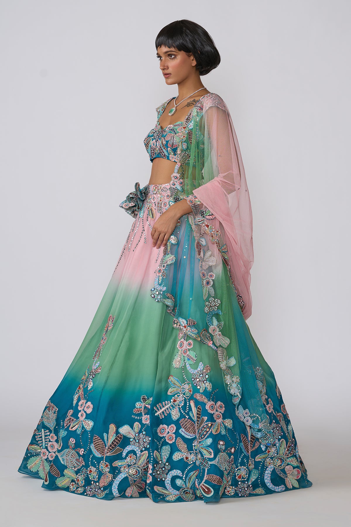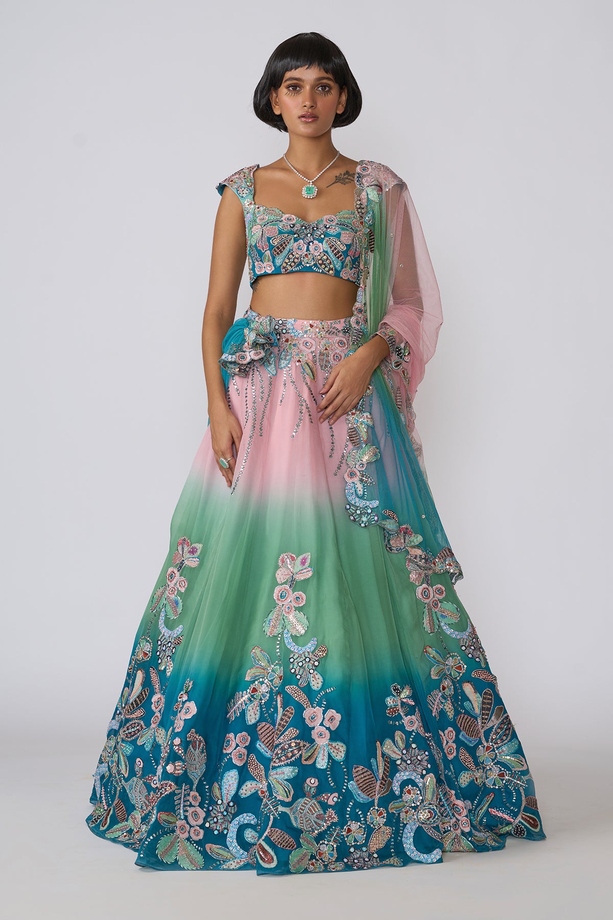 Kinfolk aurora ombre applique embellished organza lehenga, blouse & tulle dupatta.