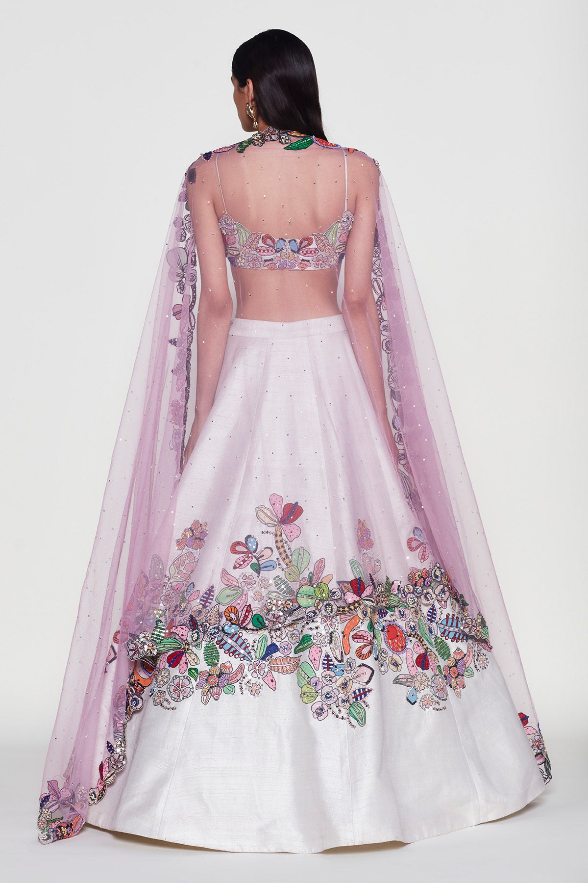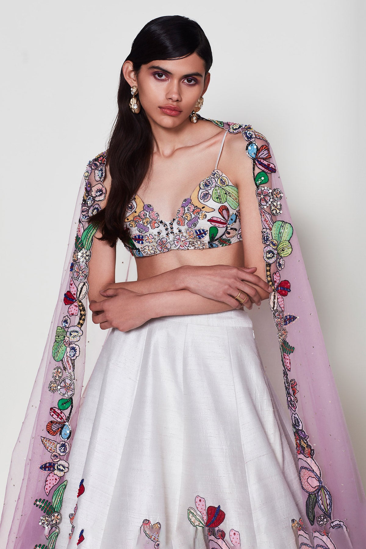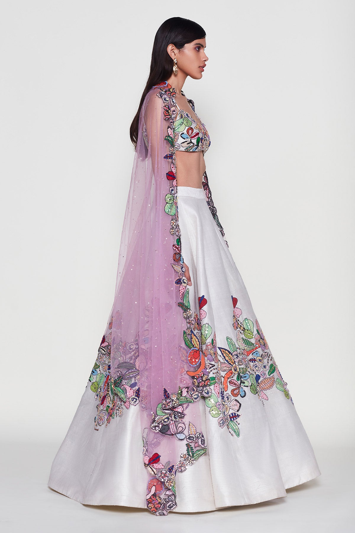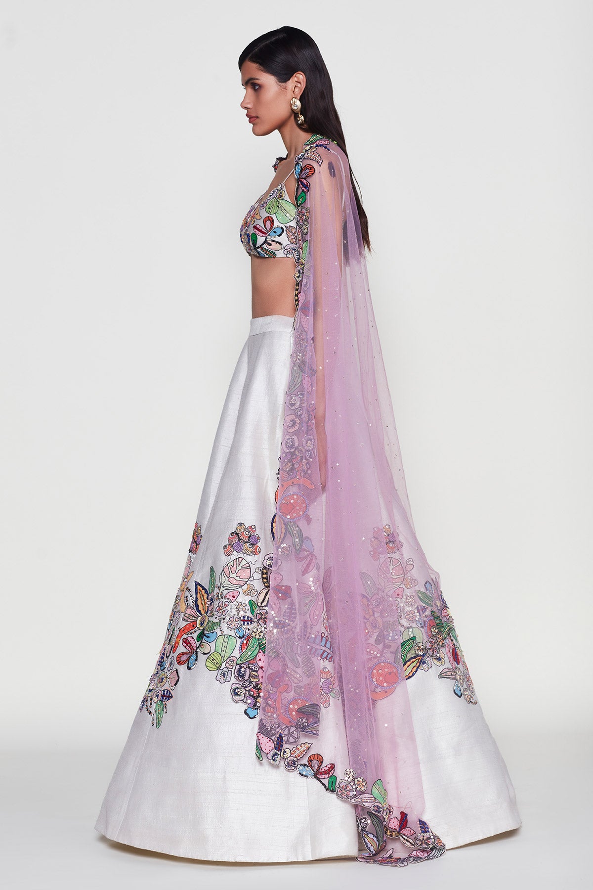 Kinfolk Ivory applique embellished raw silk MK lehenga, blouse & tulle dupatta