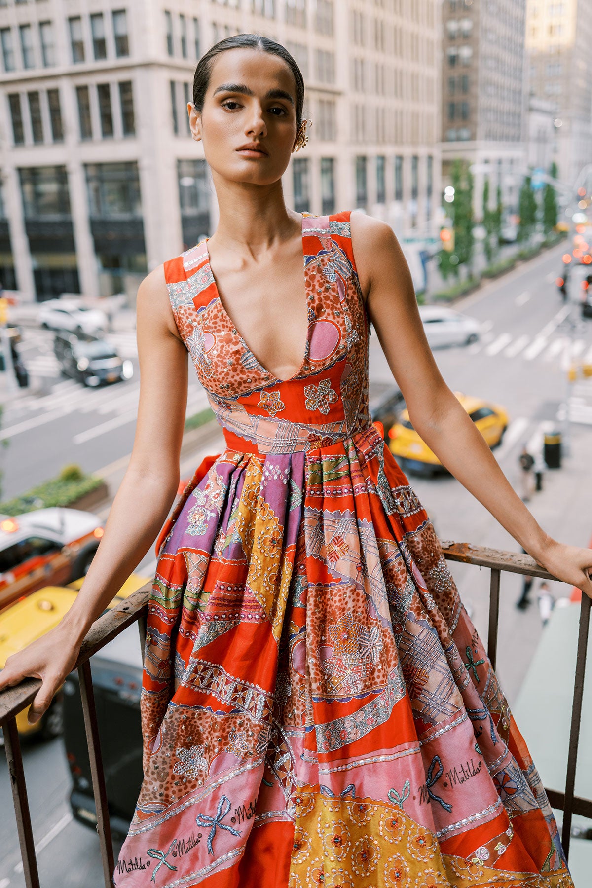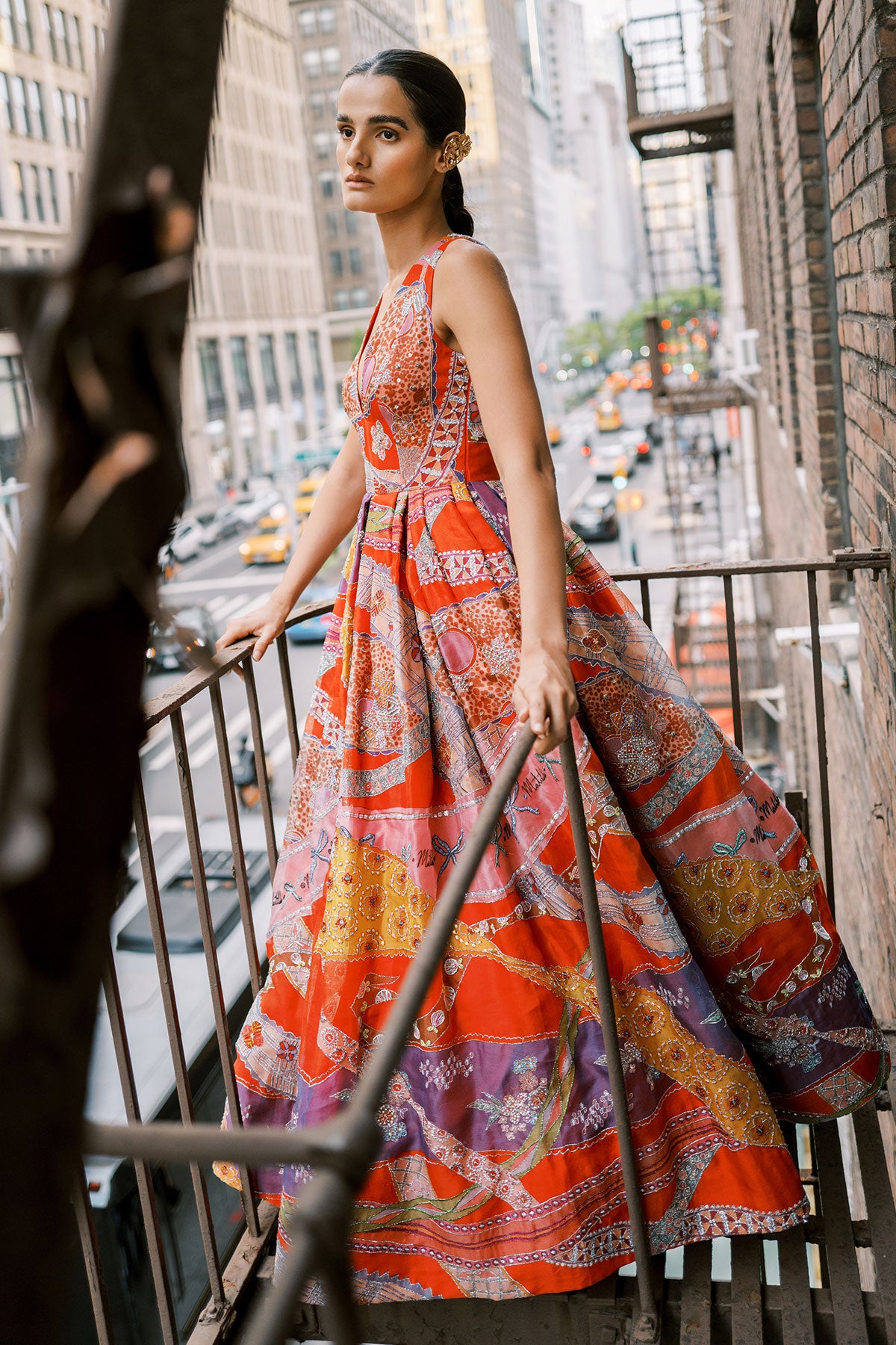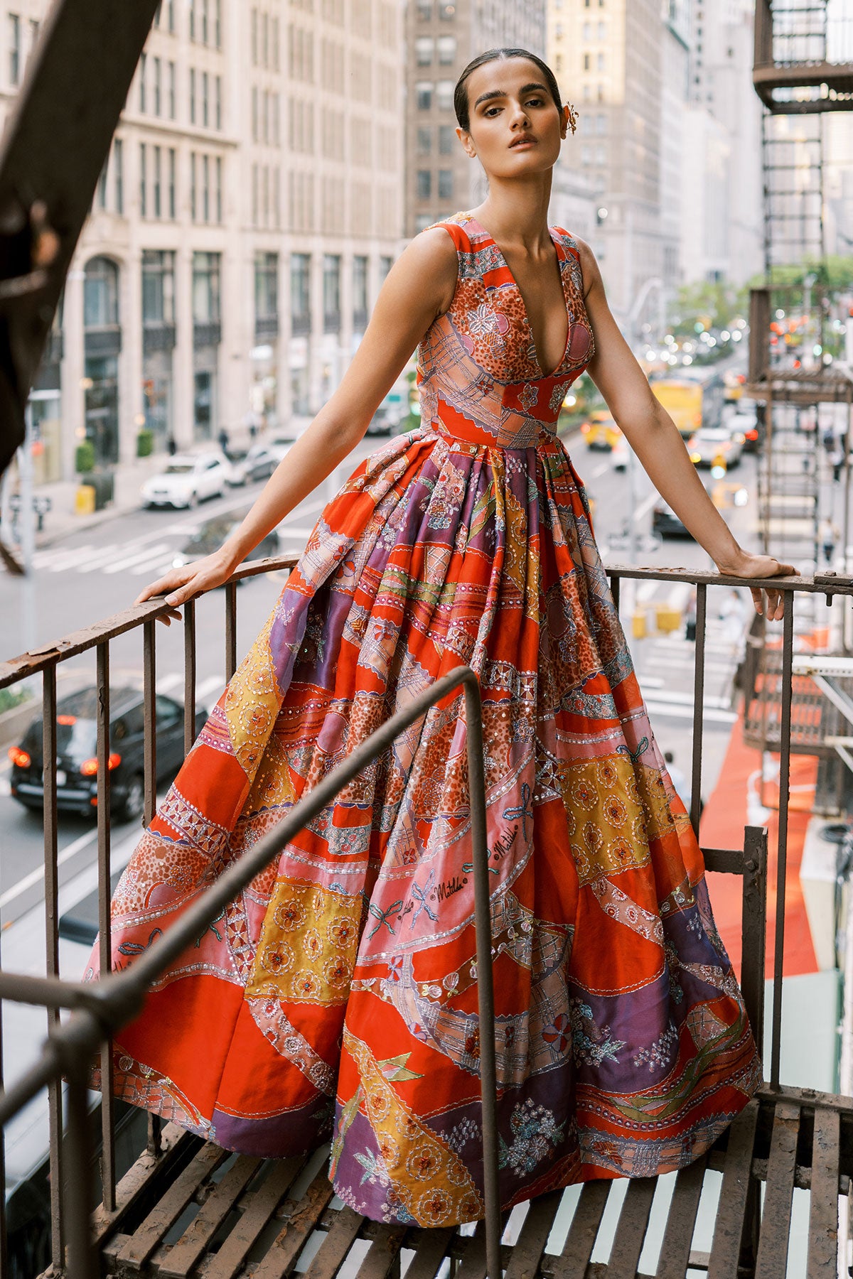Matilda Red Printed Embellished Organza Ruched Waist V Neckline Box Pleat Gown