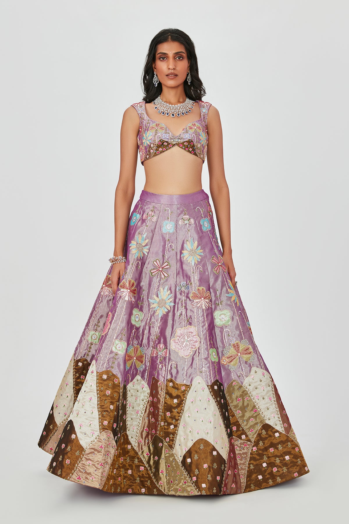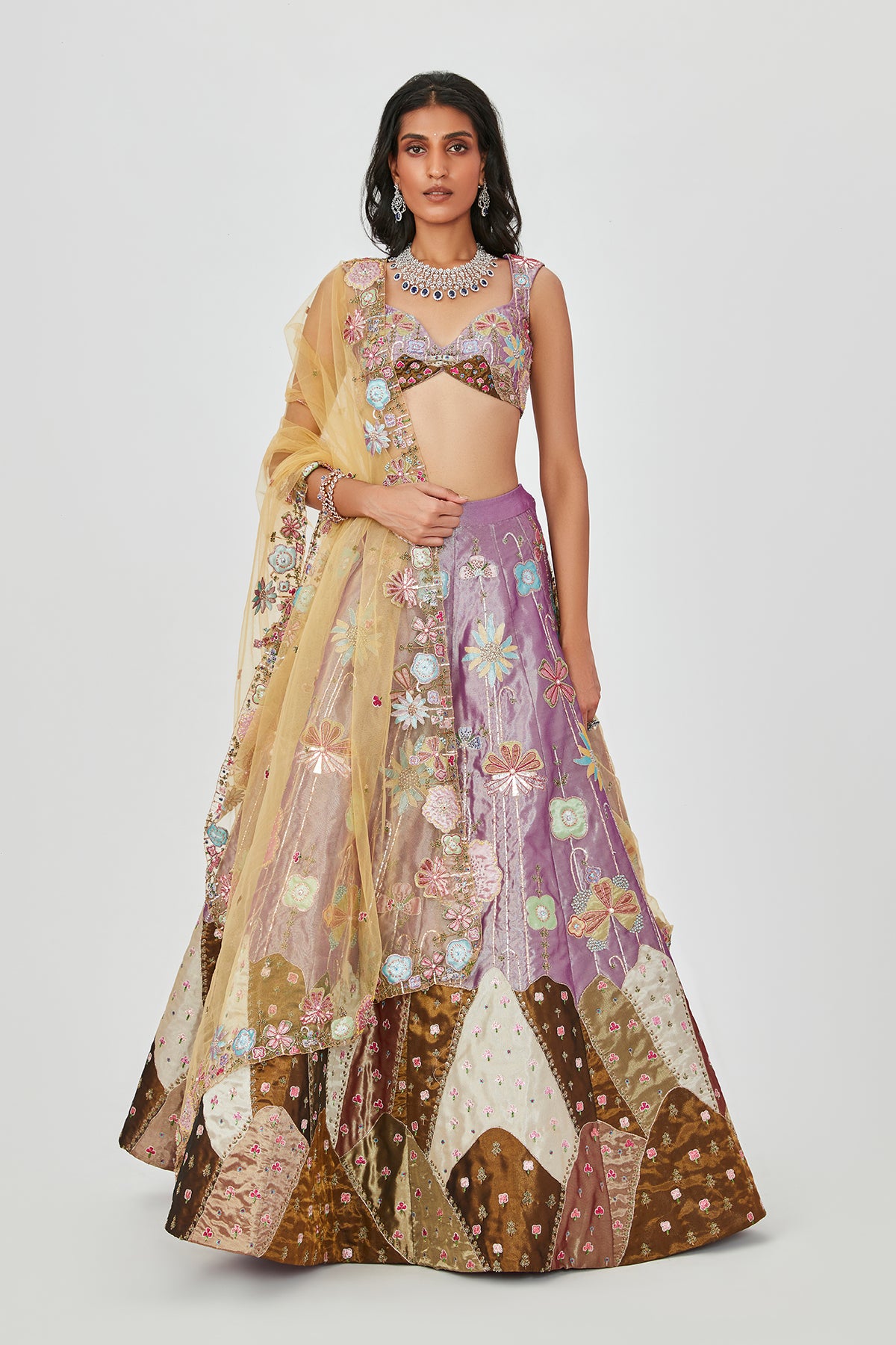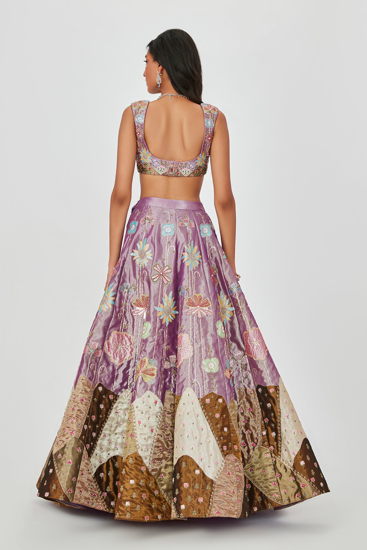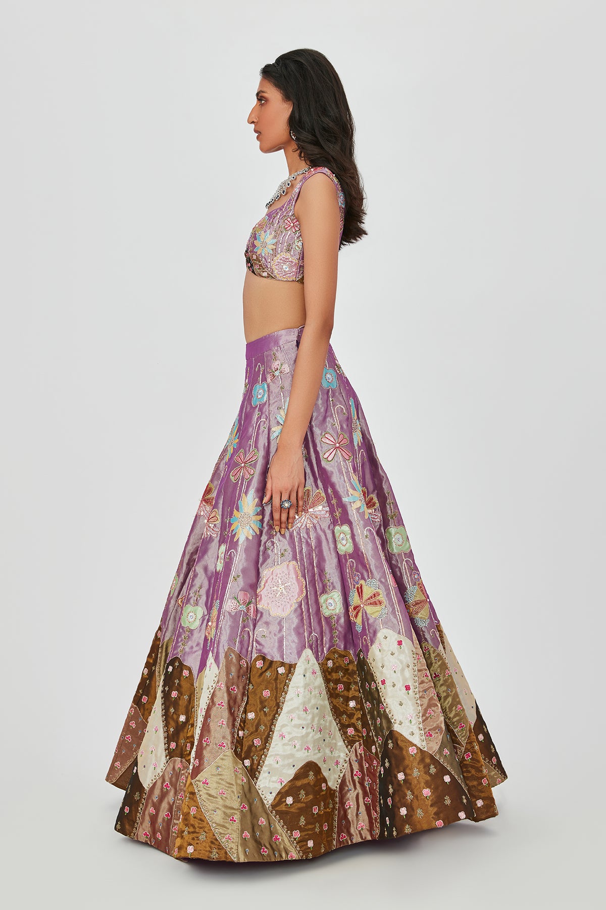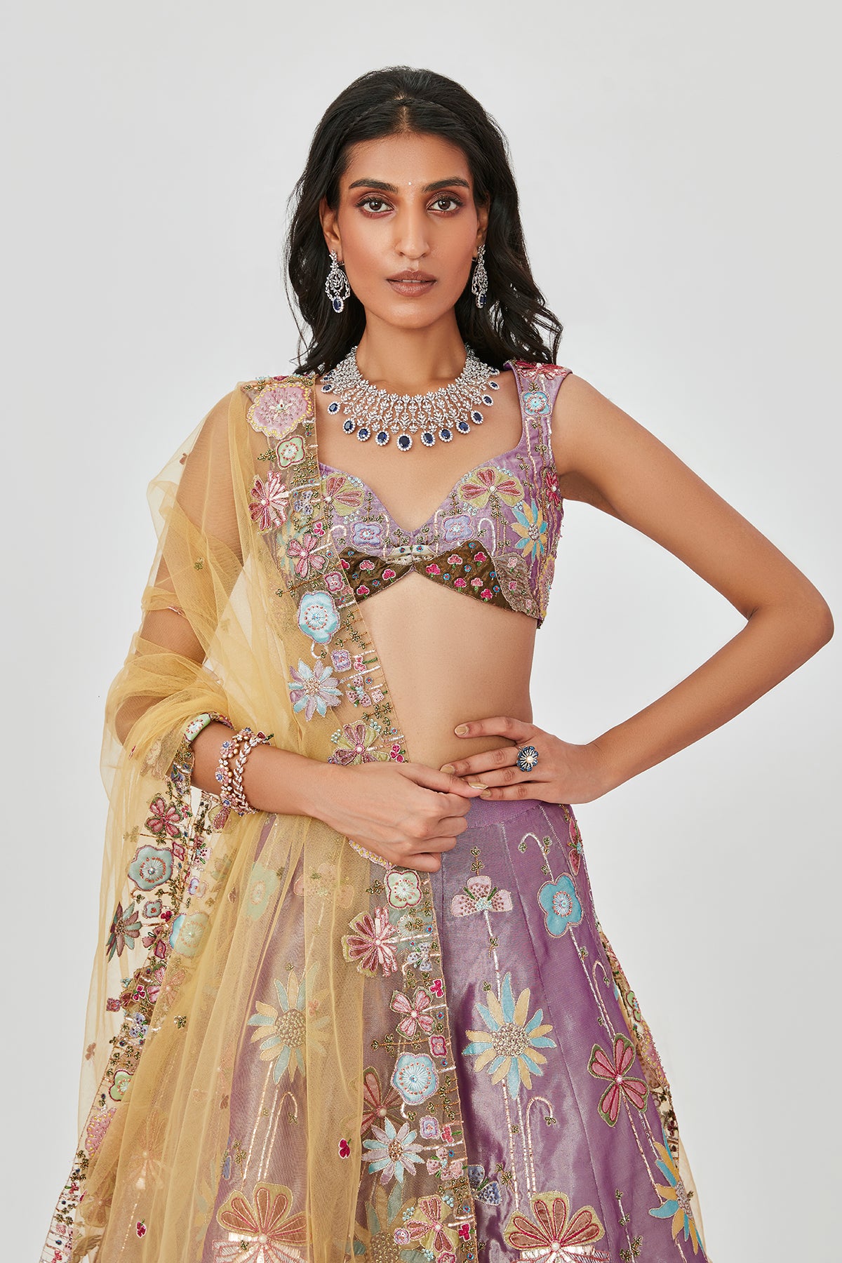 Purple embellished Tissue lehenga with sleeveless blouse and dupatta.