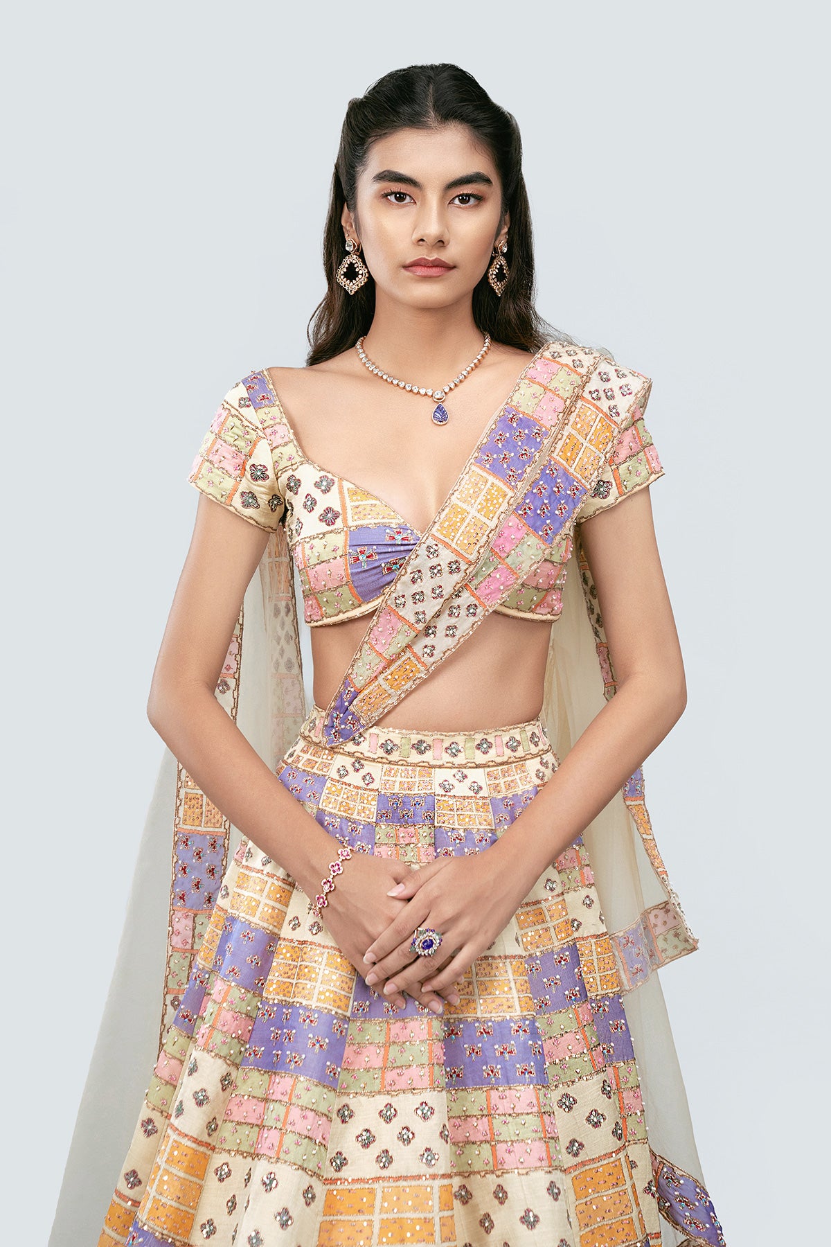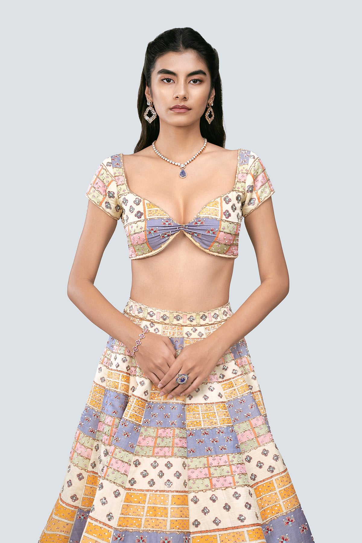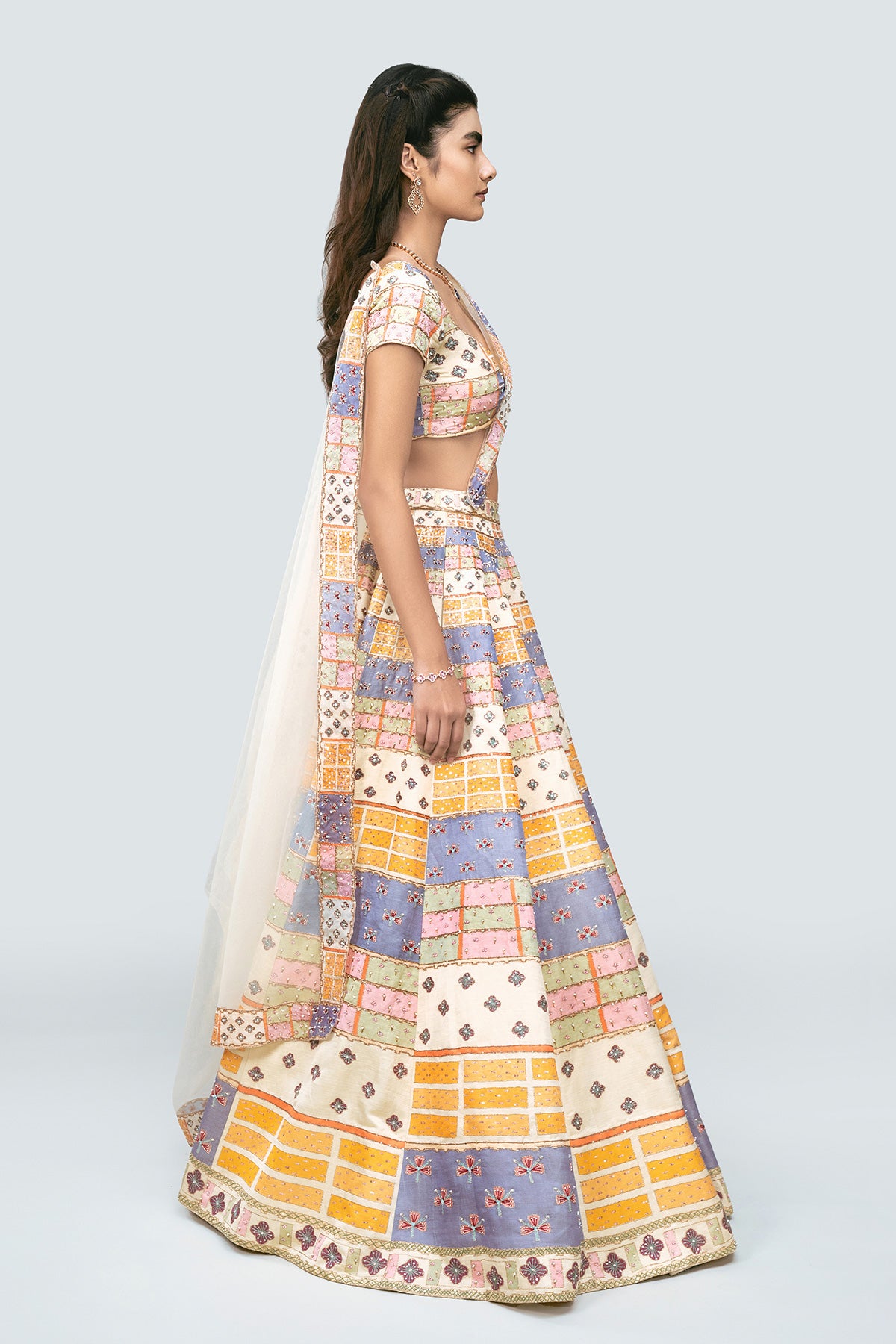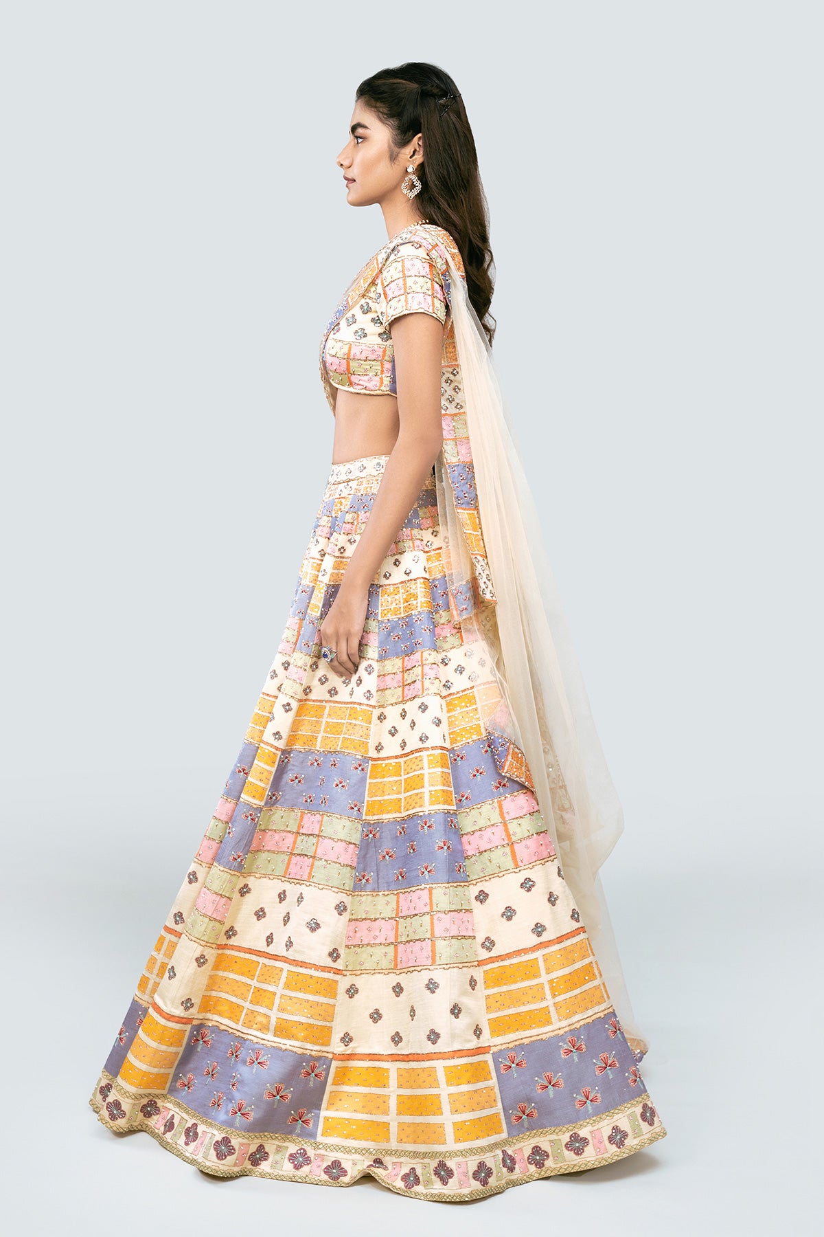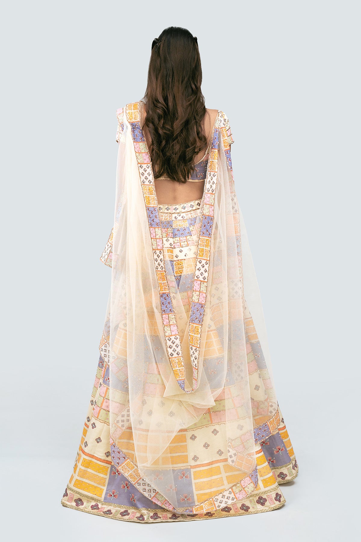Multicolored printed, embellished Kasab satin lehenga with blouse and net dupatta with border.