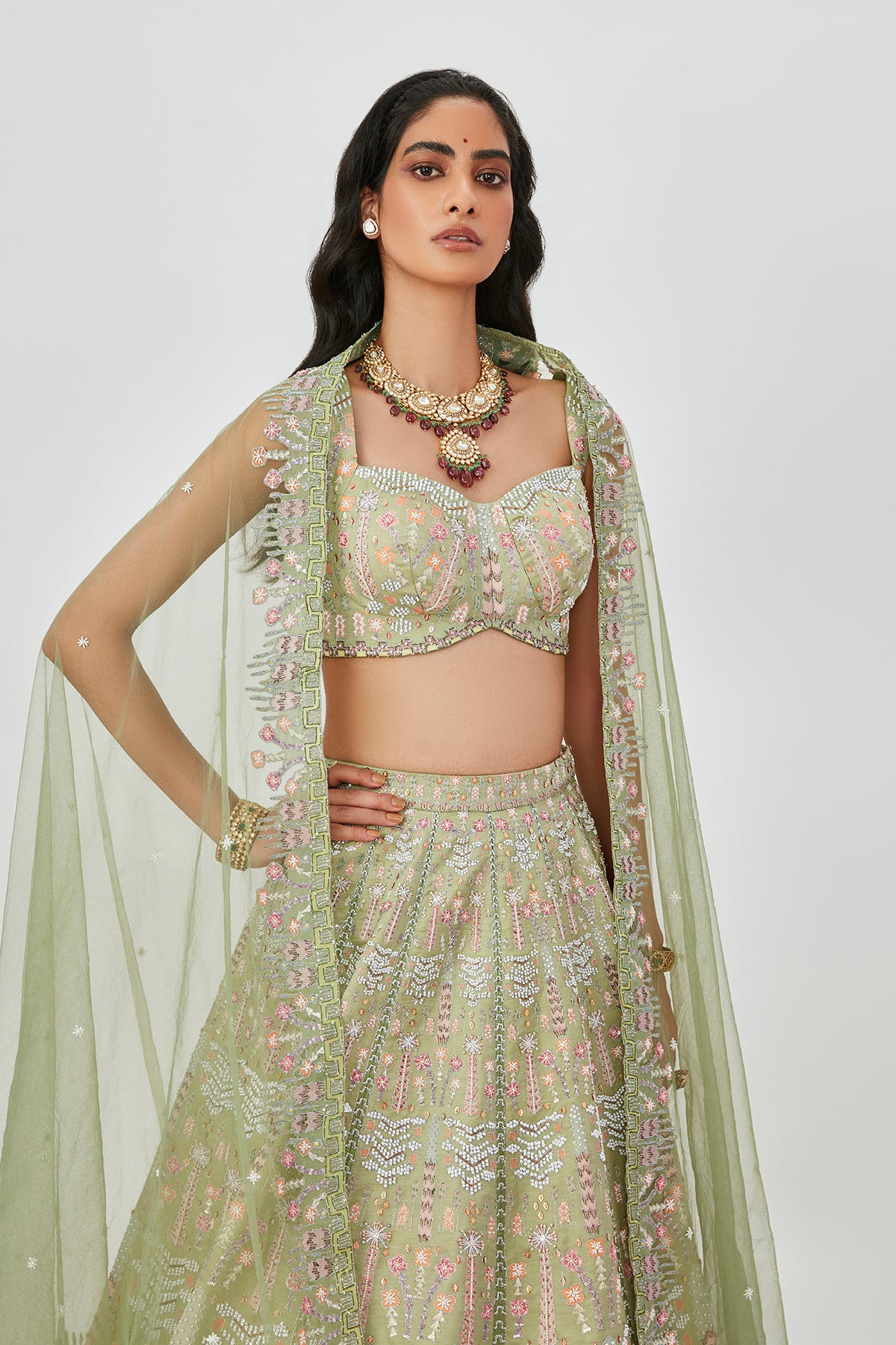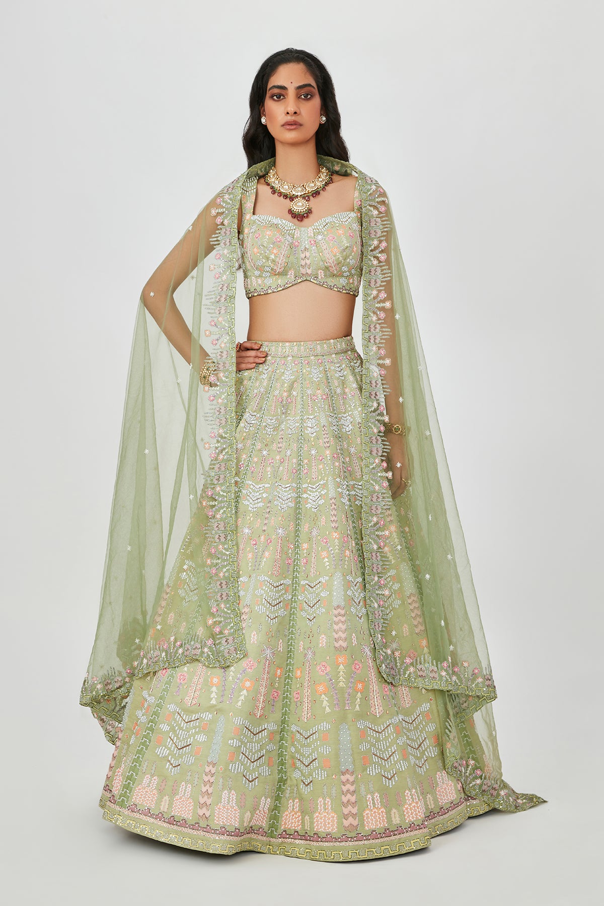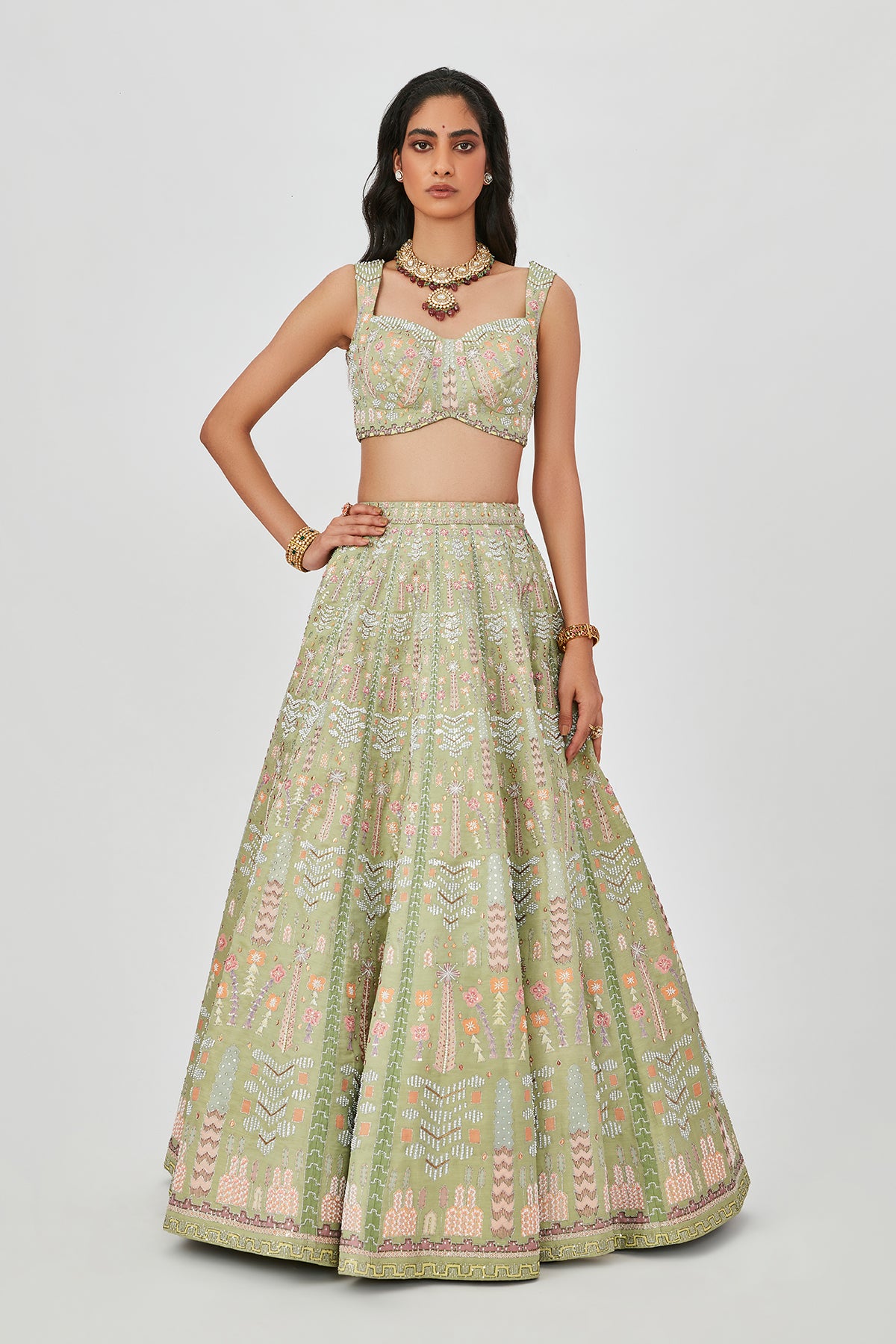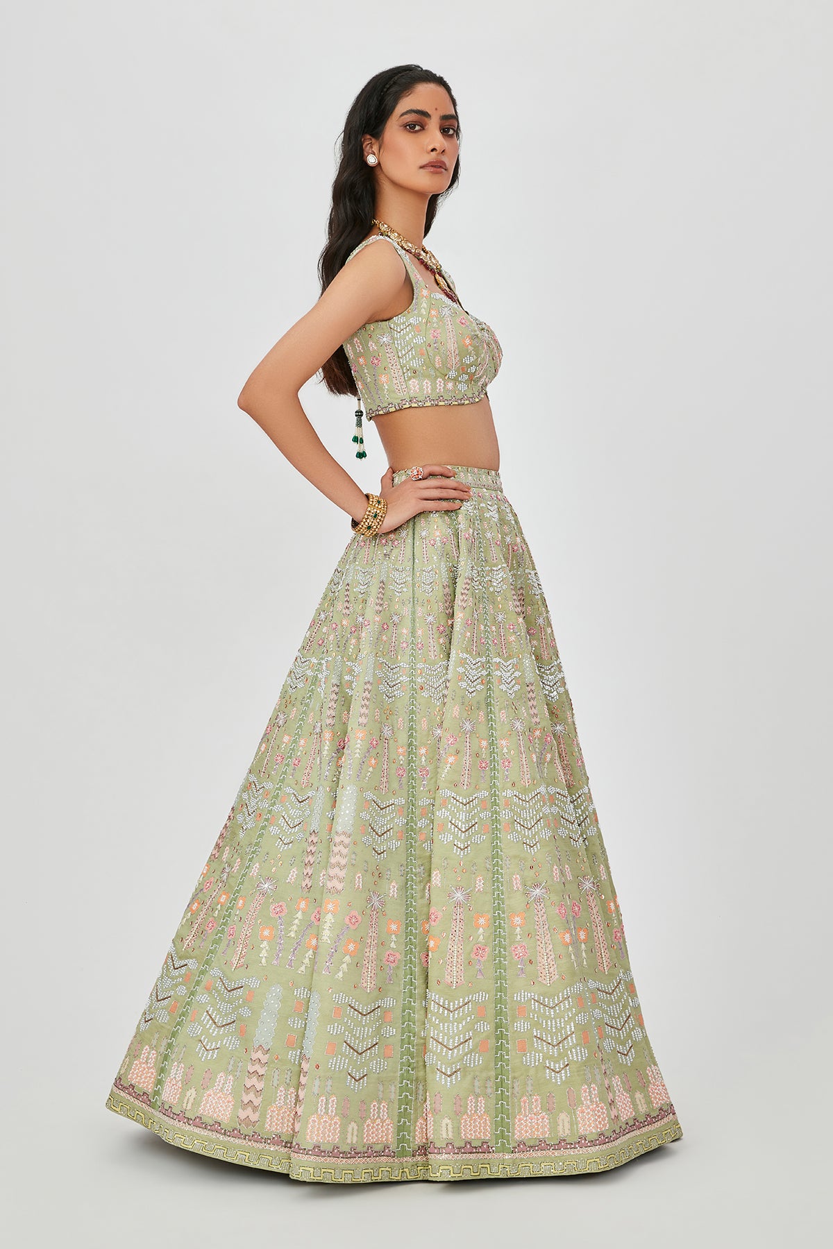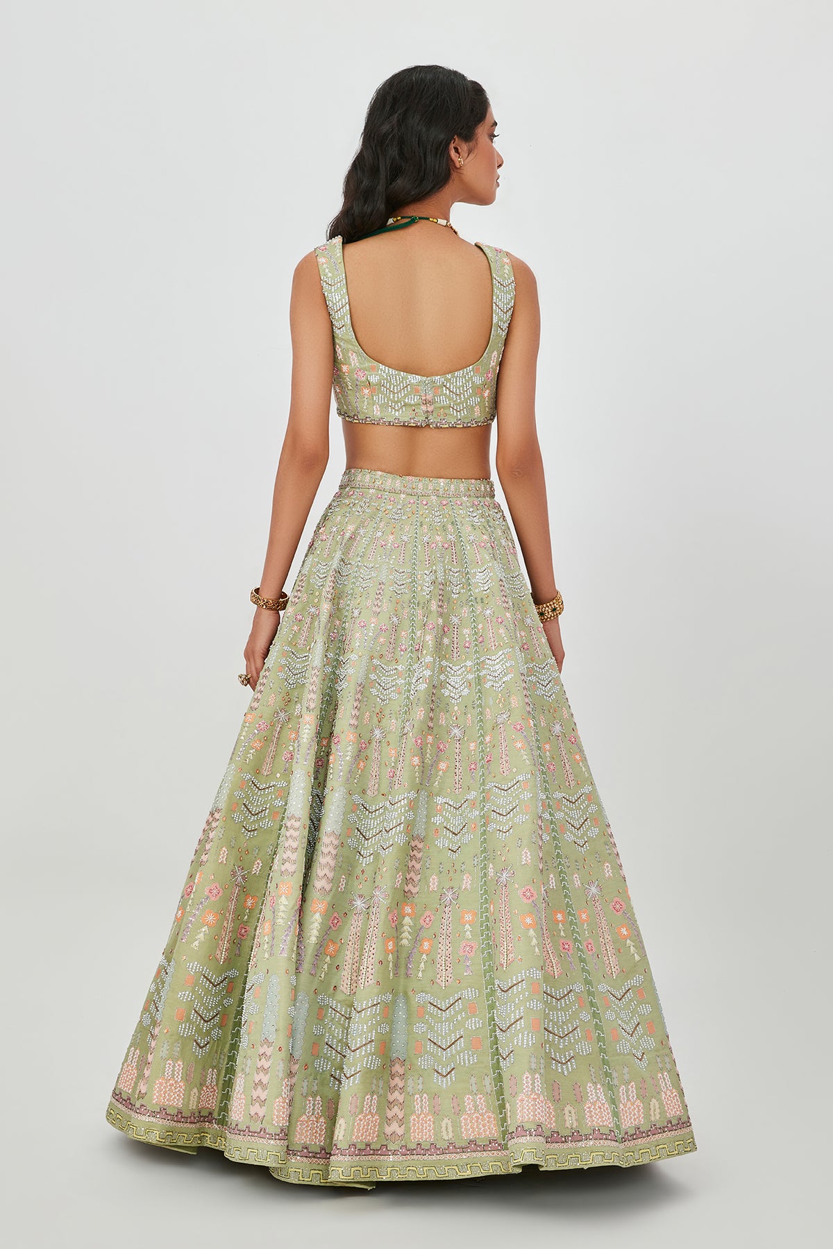 Moss green kasab satin lehenga with heavy embellised & appliqued with sleeveless blouse.