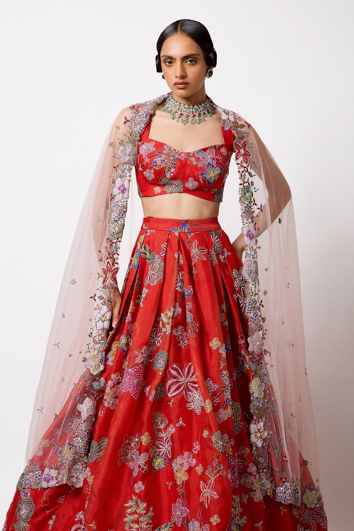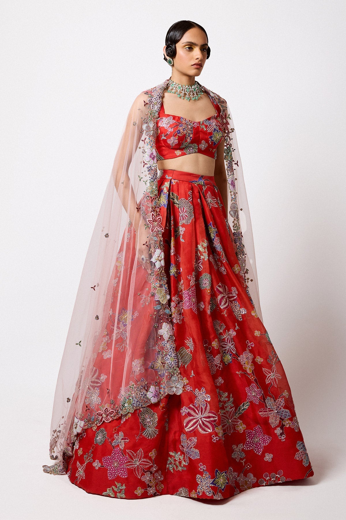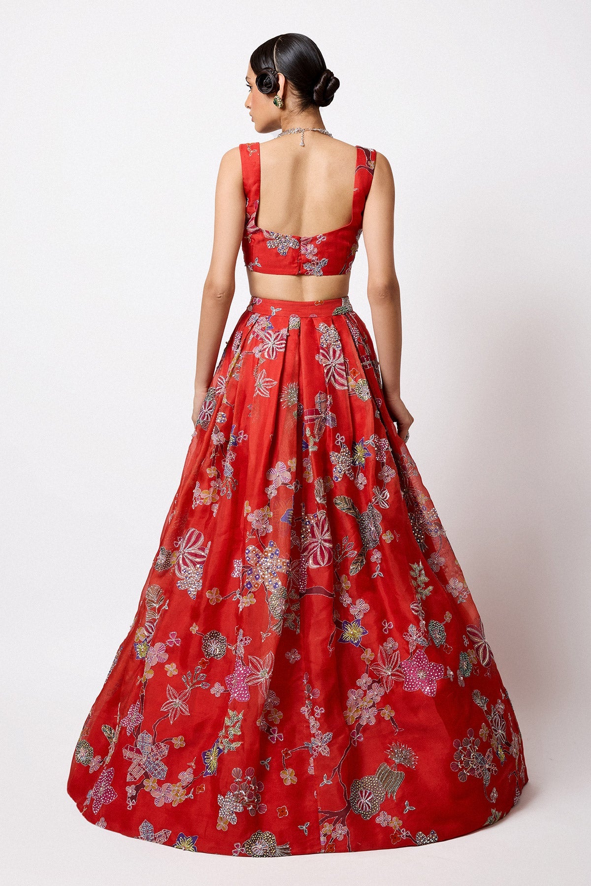 Matilda Red Printed Embellished Organza Pleated Lehenga With Blouse And Tulle Net Dupatta