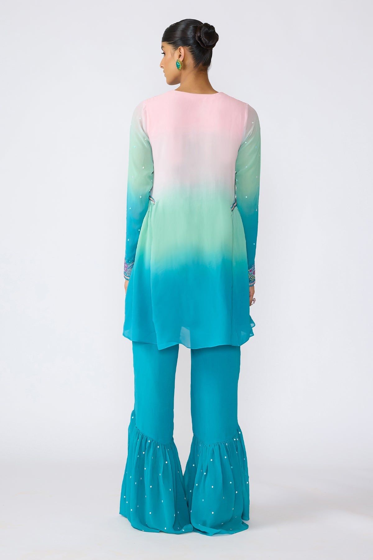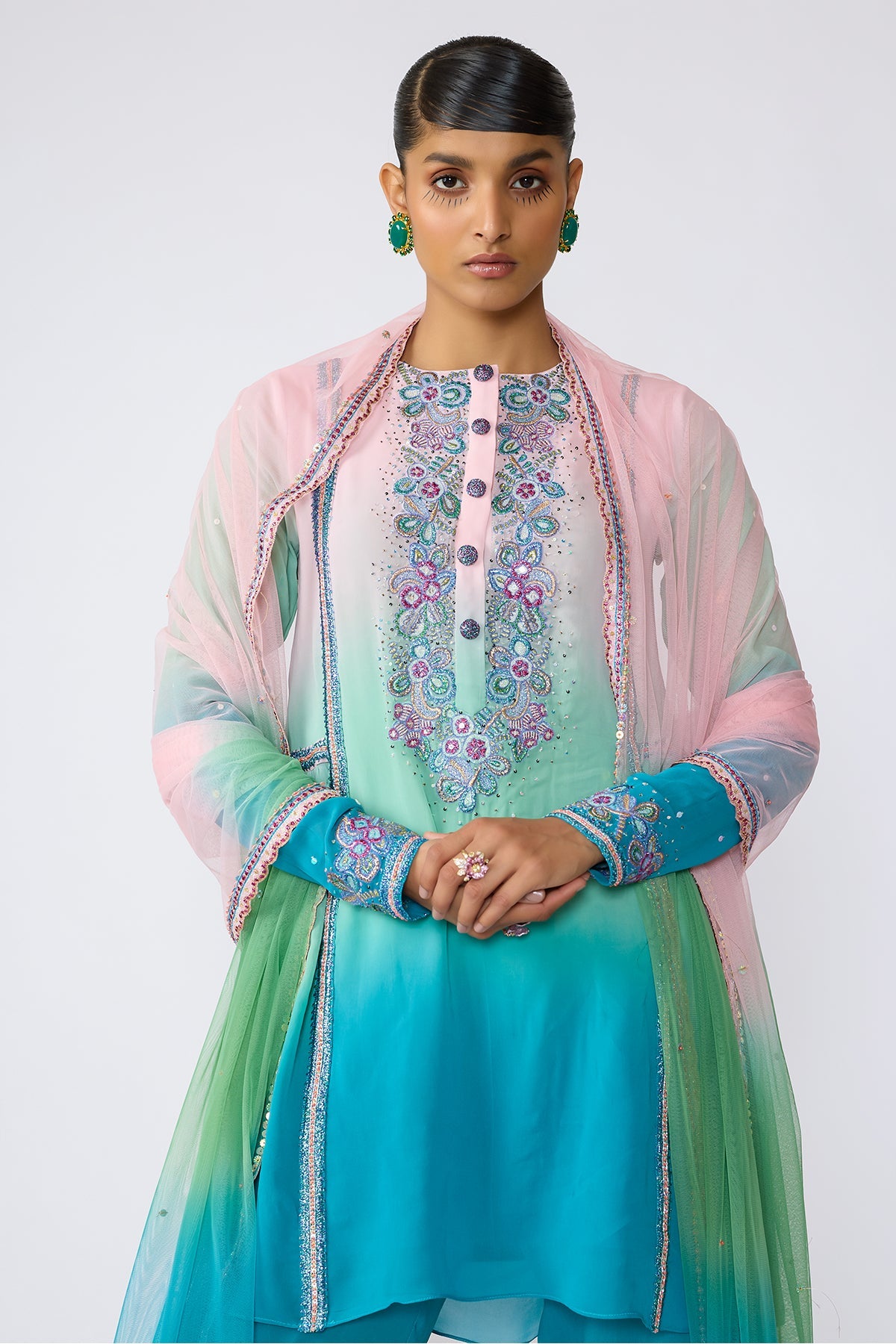 Kinfolk aurora ombre embellished viscose georgette short kurta with pants & tulle dupatta.