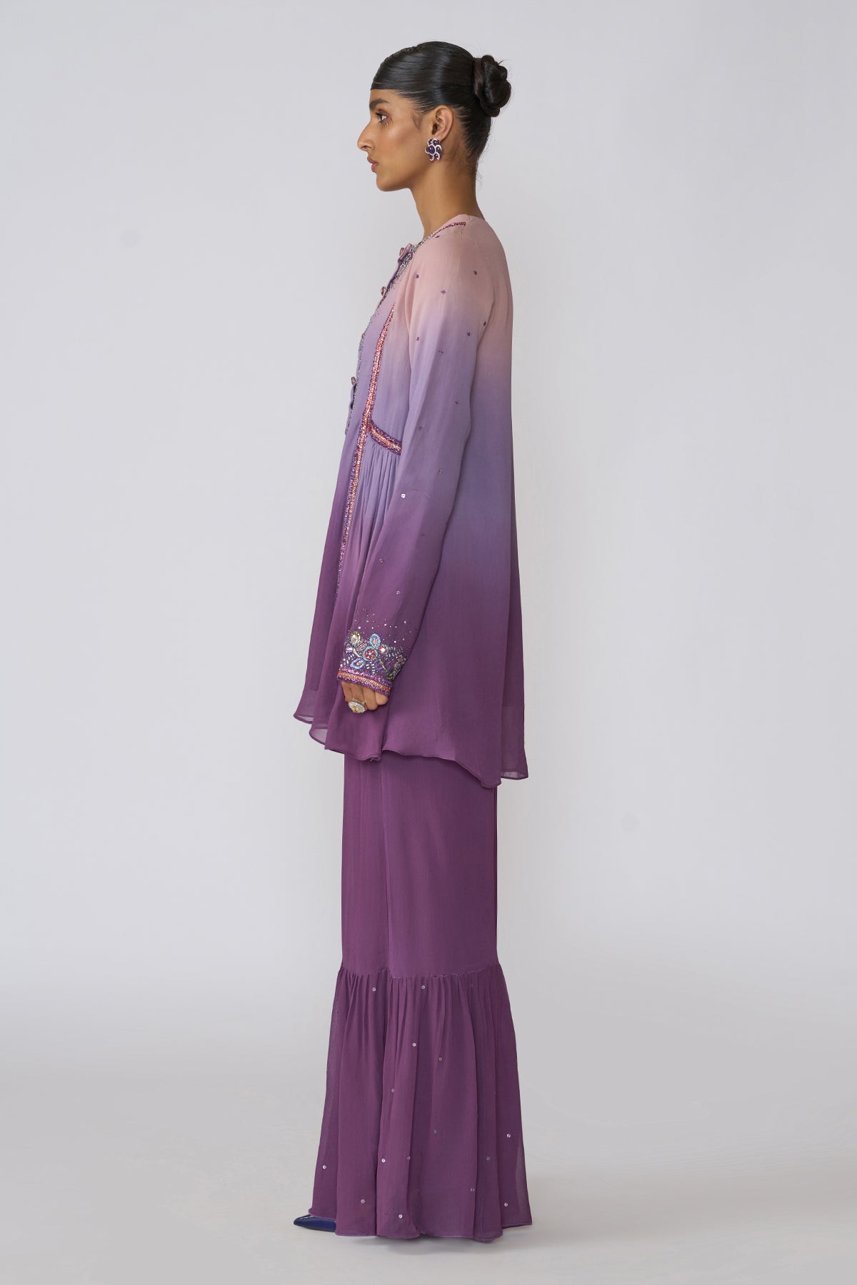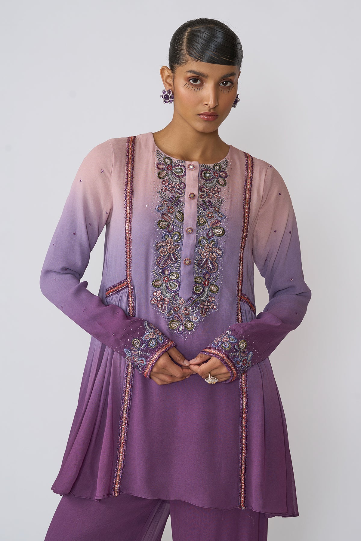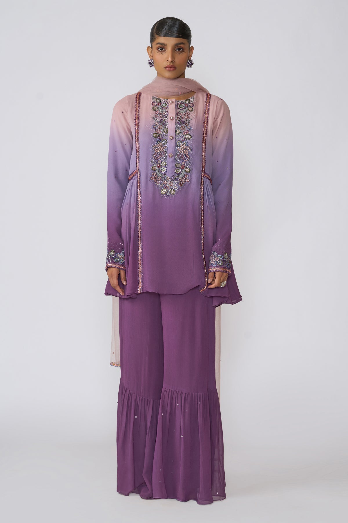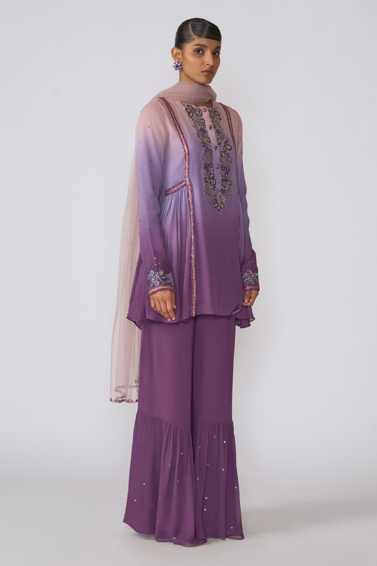 Kinfolk pink- amethyst ombre embellished viscose georgette short kurta with pants & tulle dupatta.