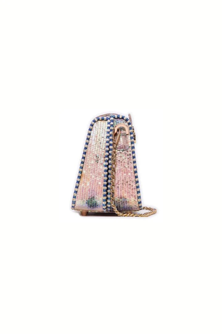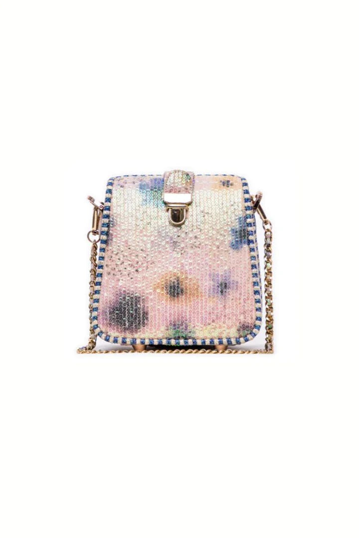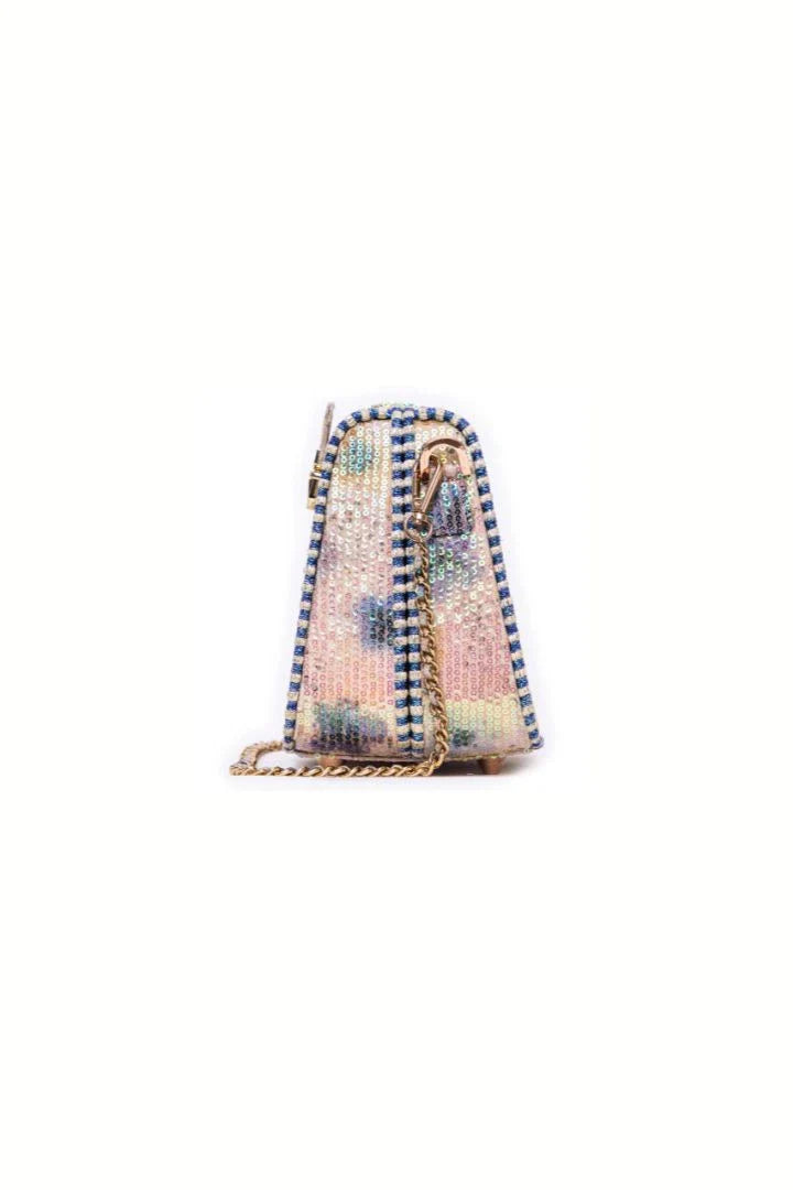 Kinfolk ivory printed sequin tulle box frame bag with strap lock detail & chain handle
