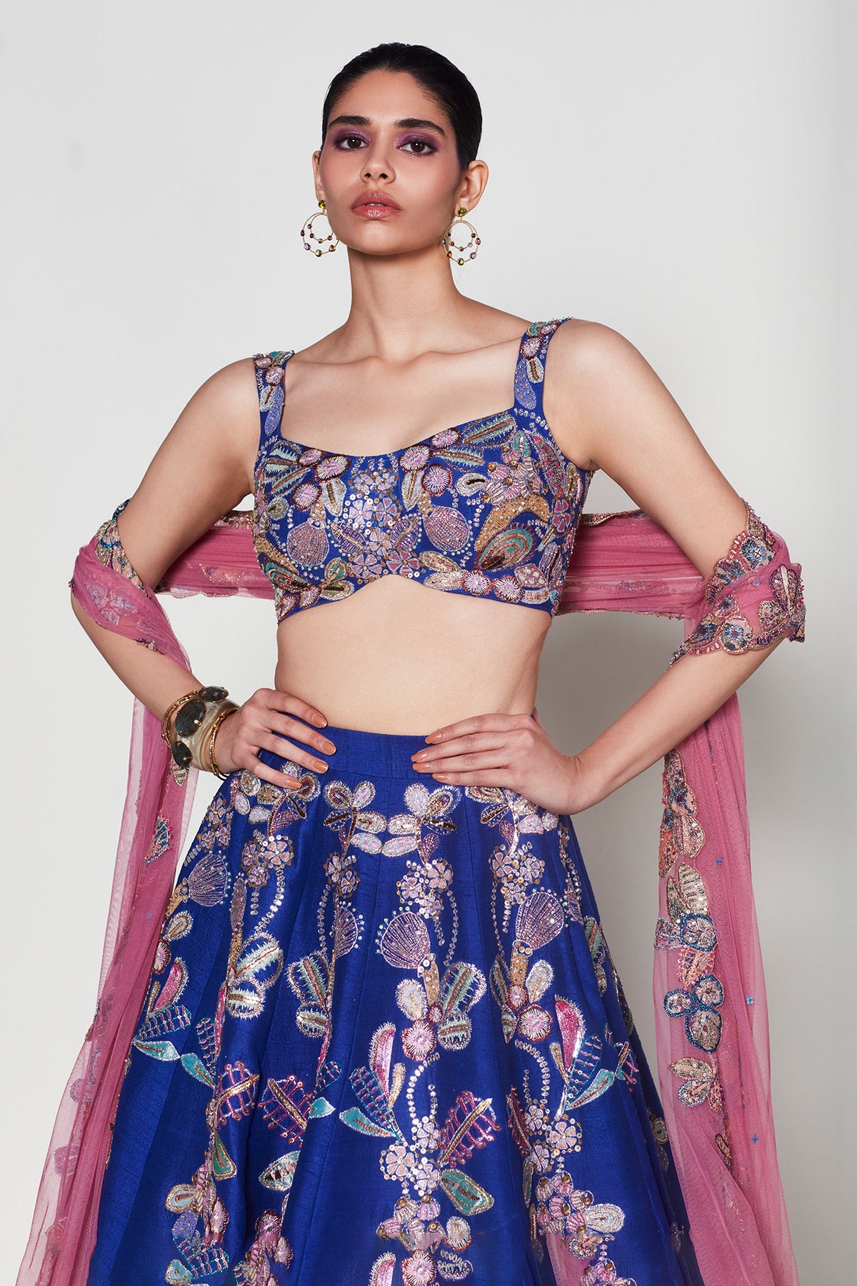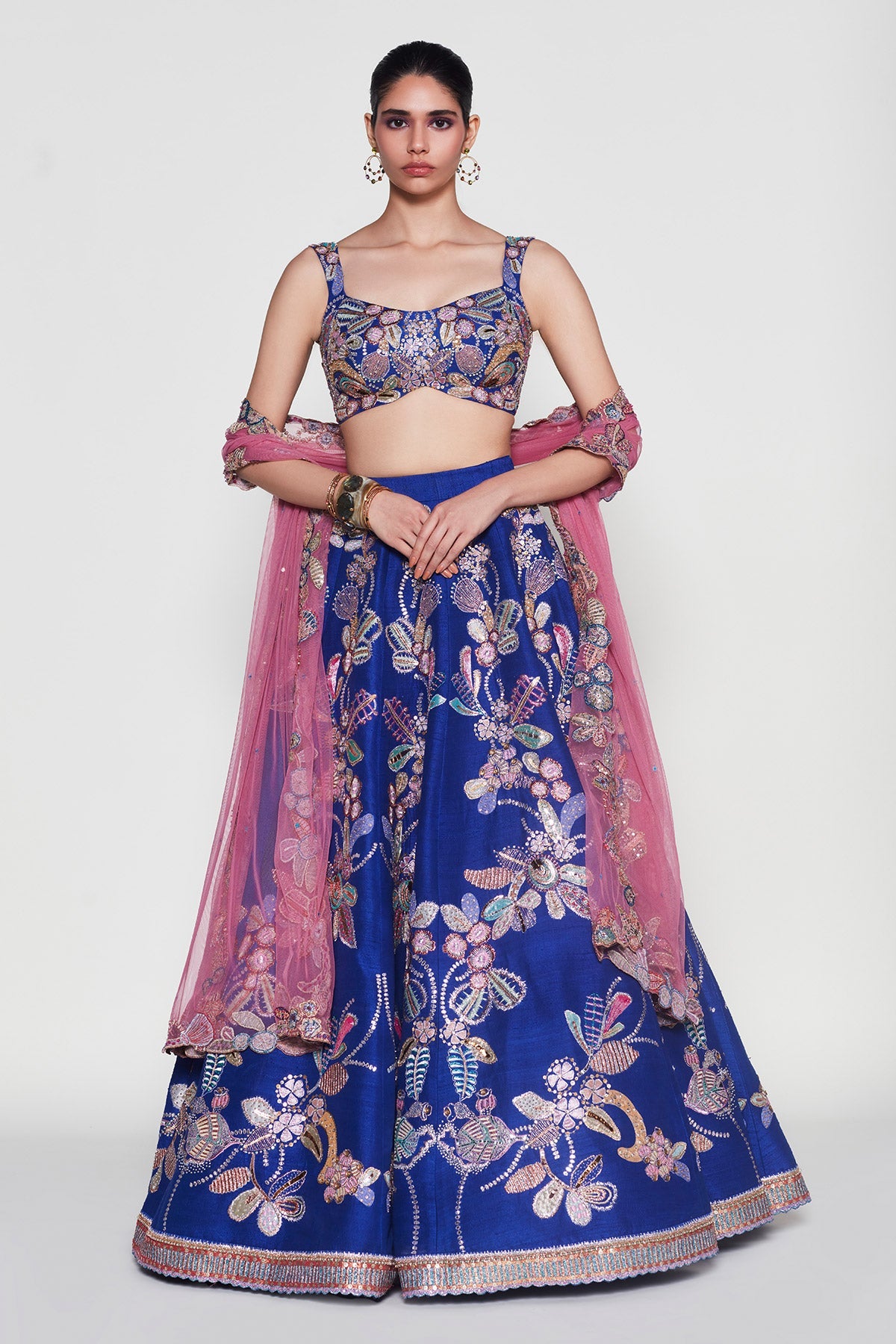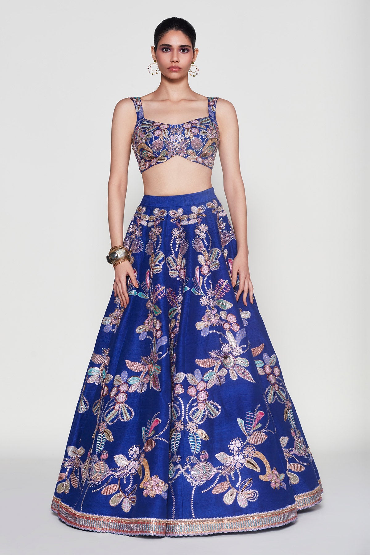 Front pose in Kinfolk VB electric blue applique embellished lehenga