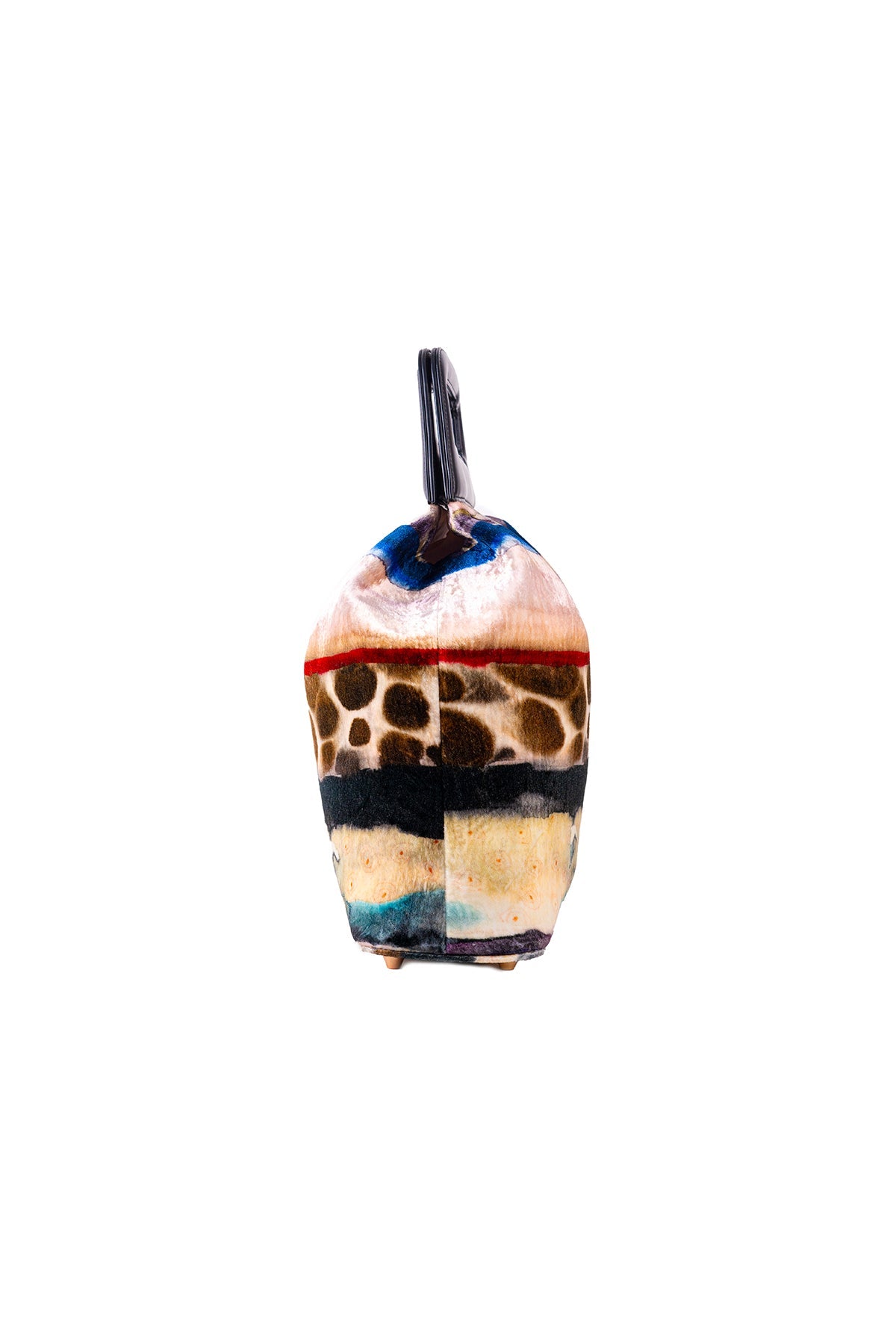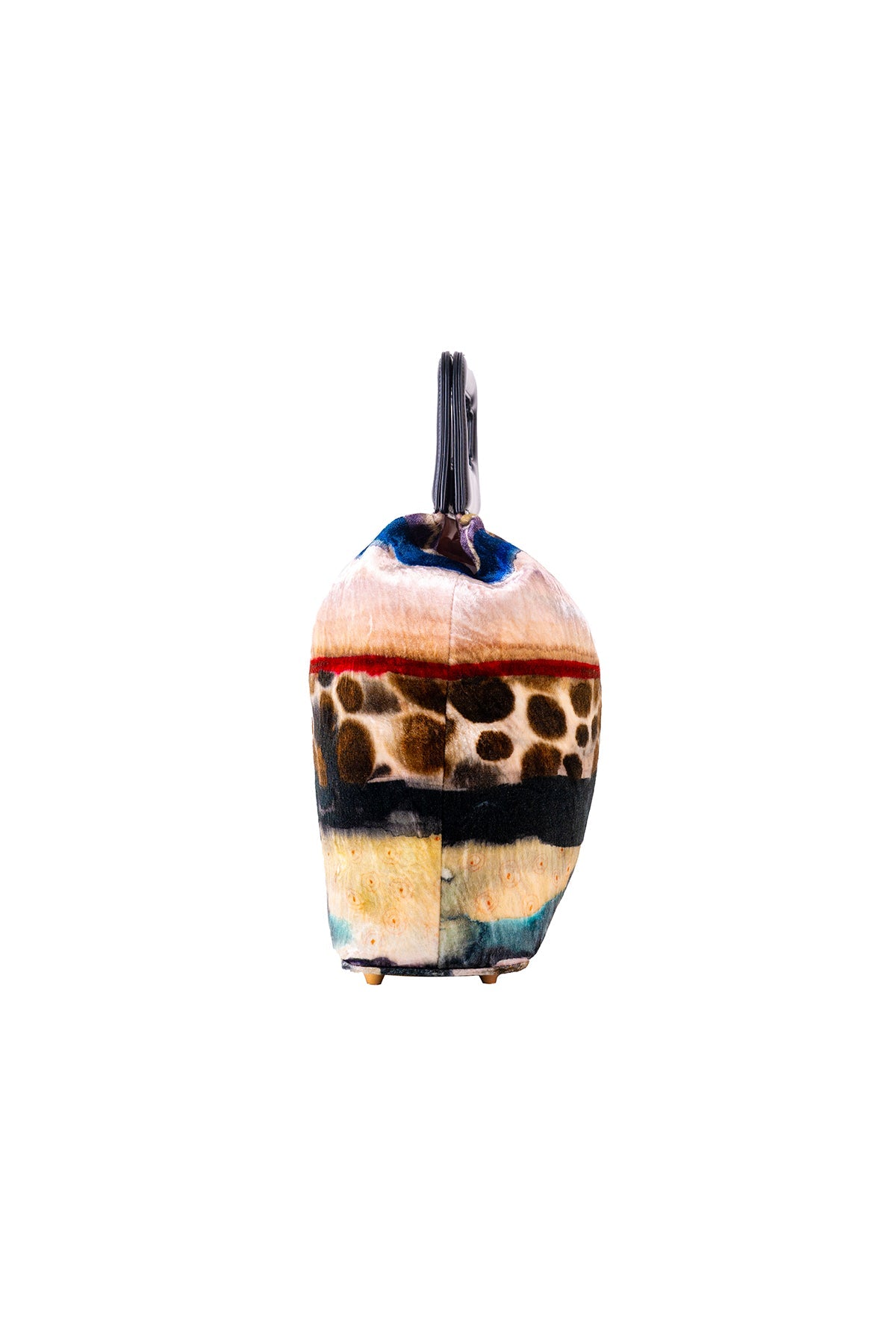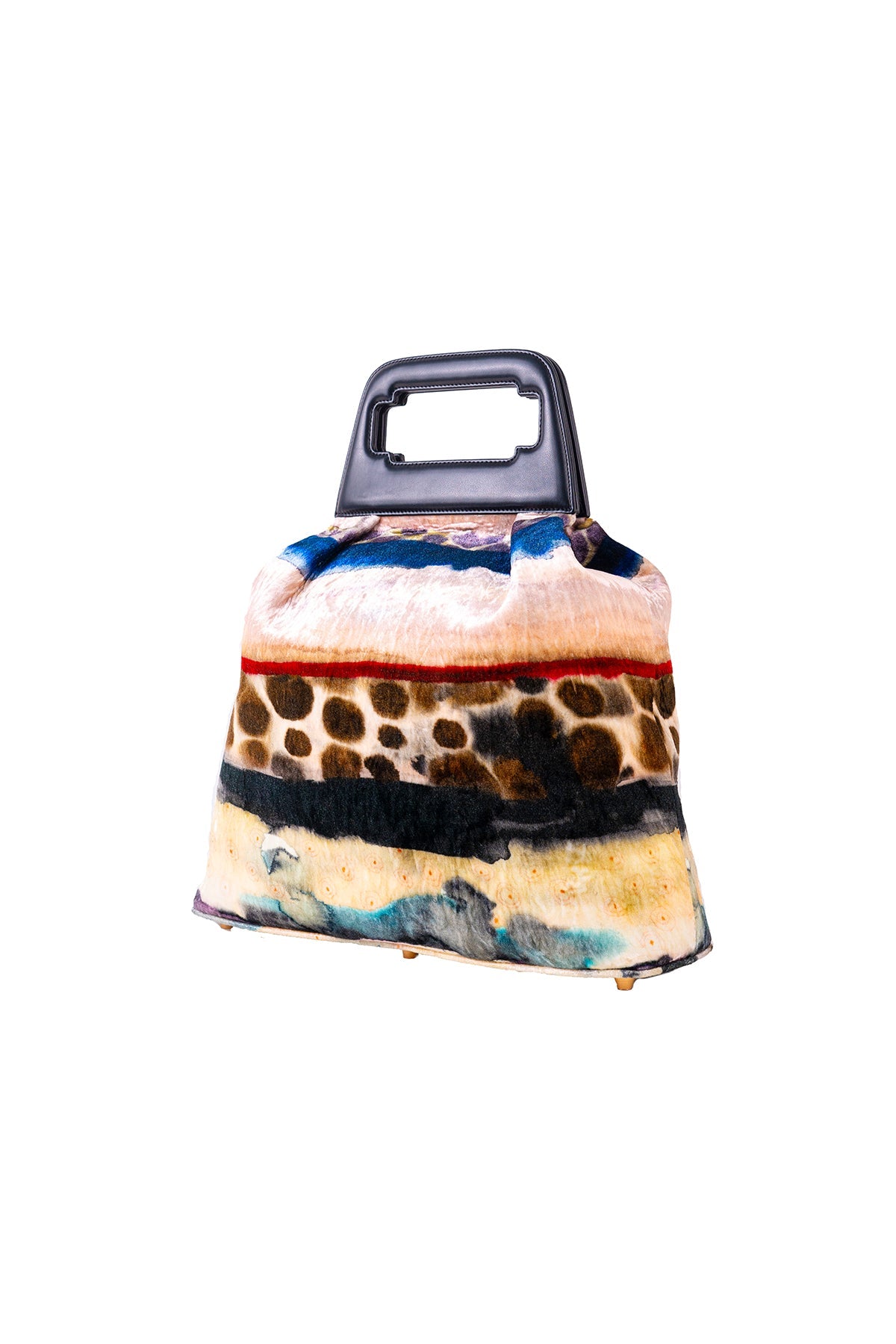 Kinfolk mist purple printed velvet gathered duffel bag with black rexin handle loop