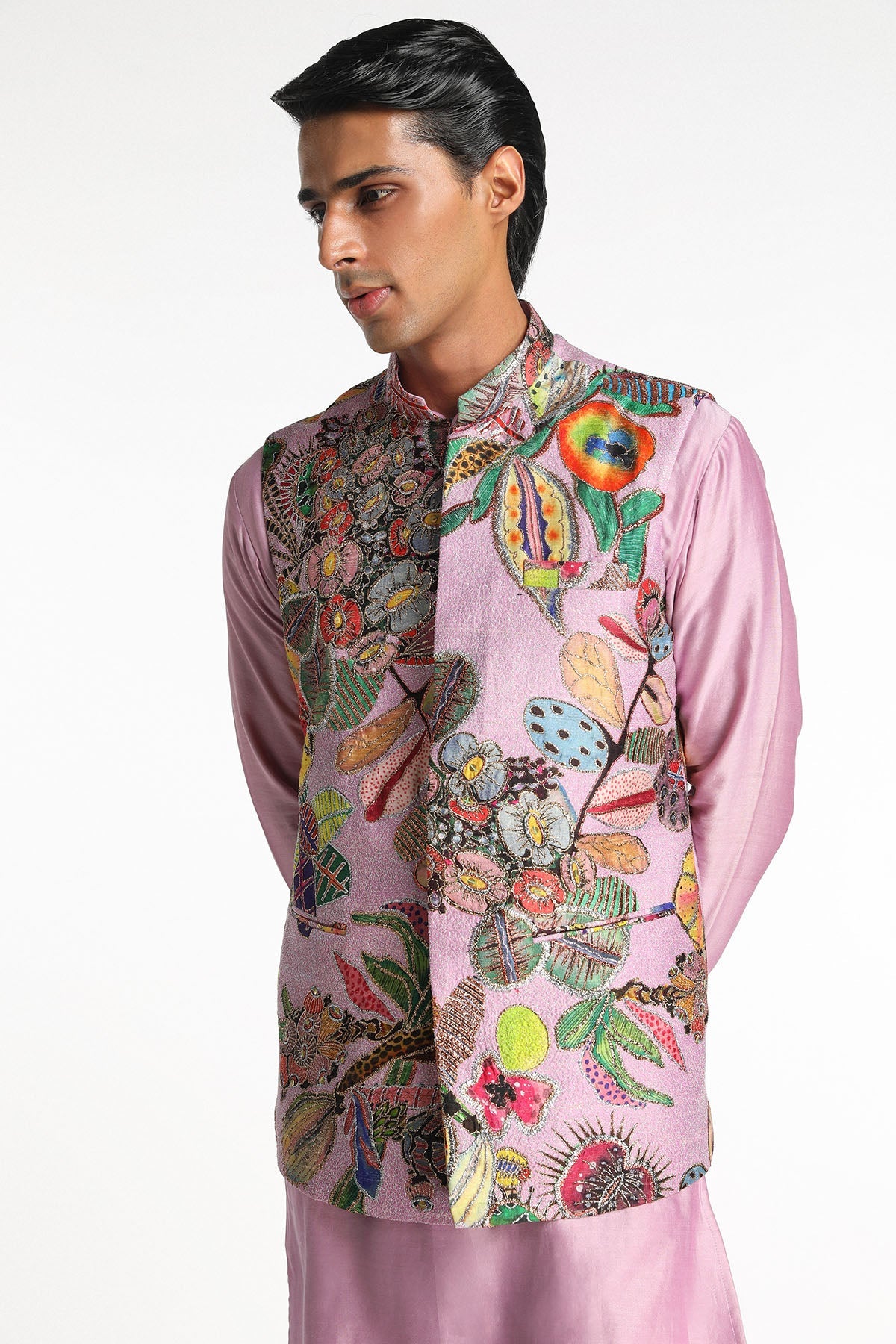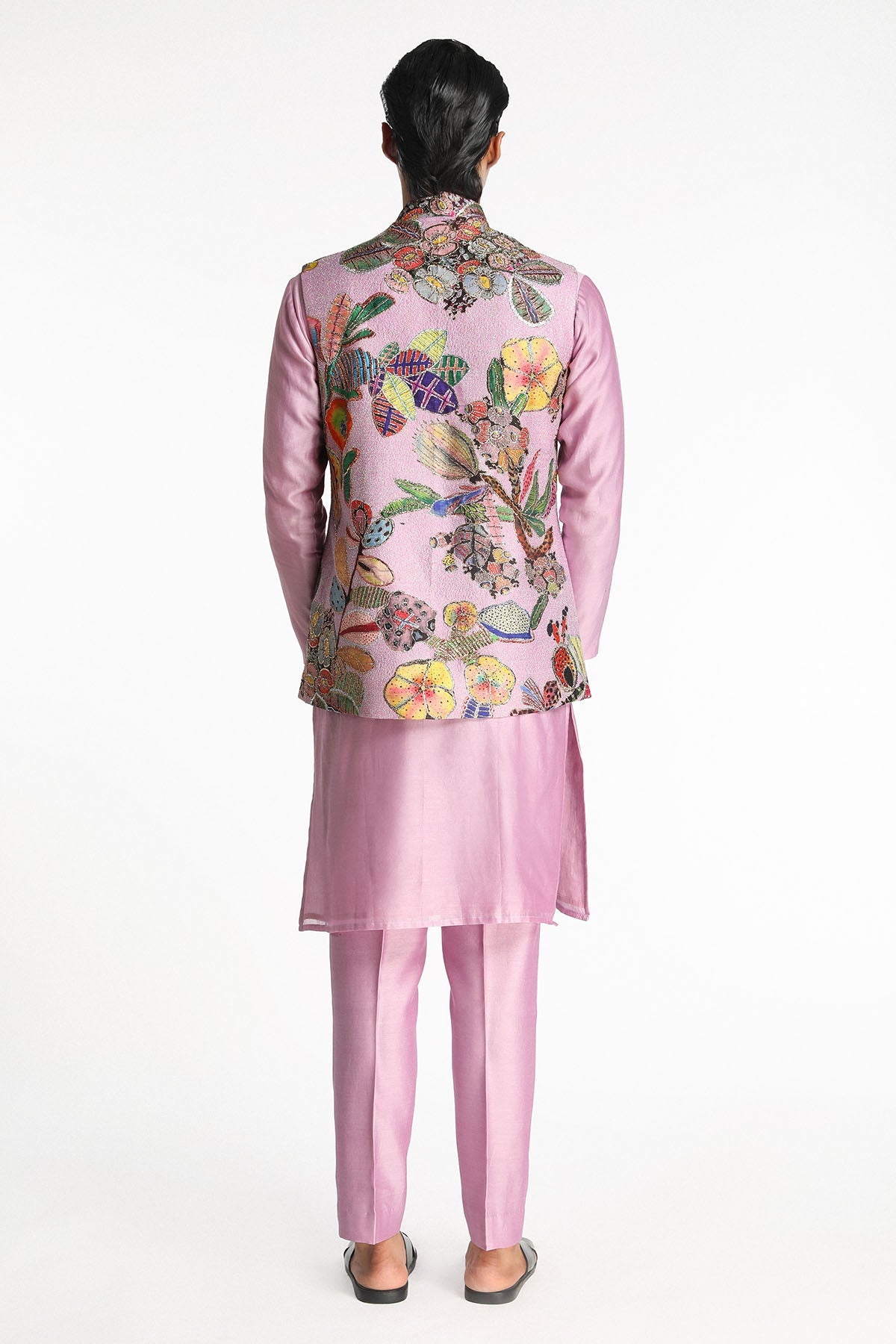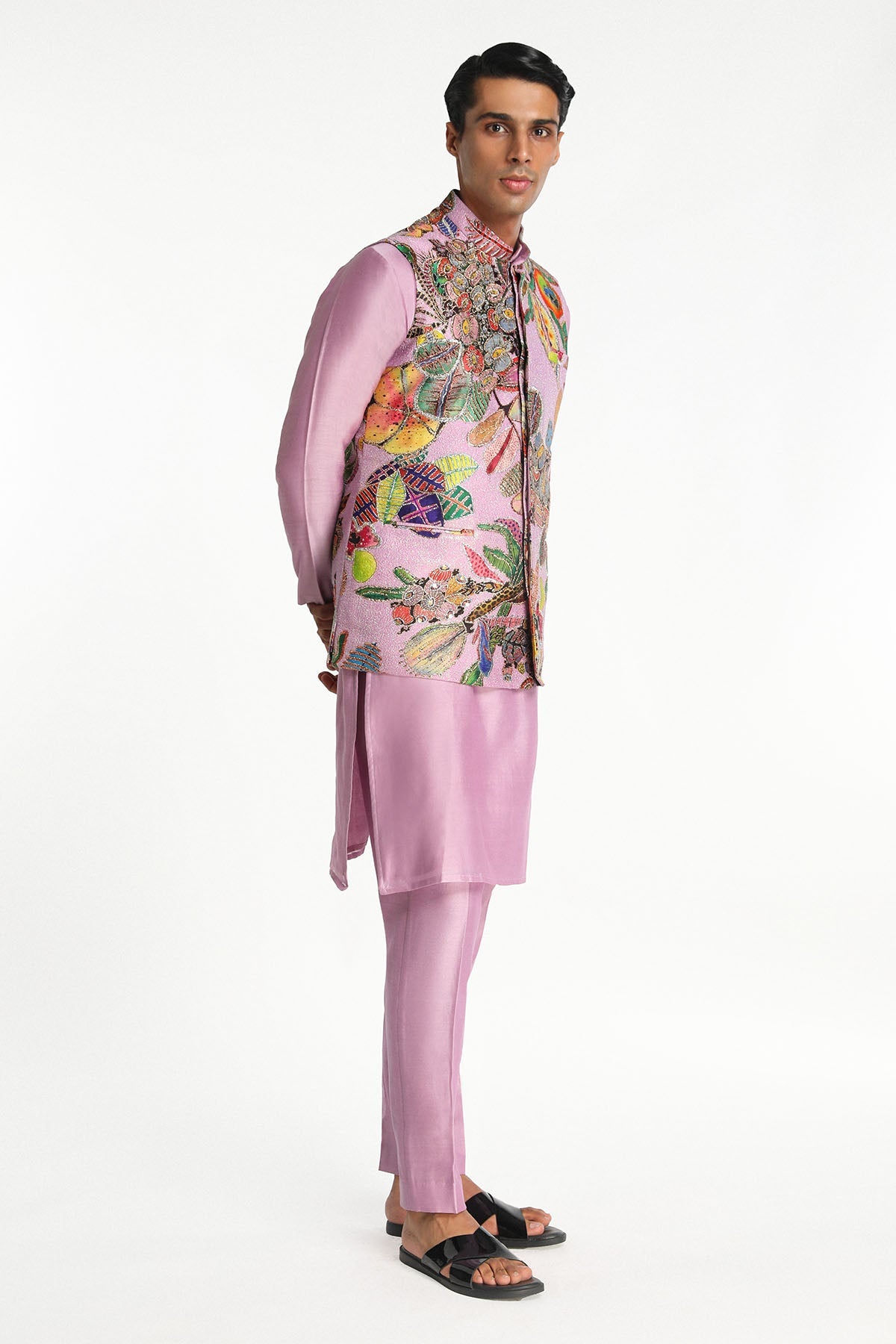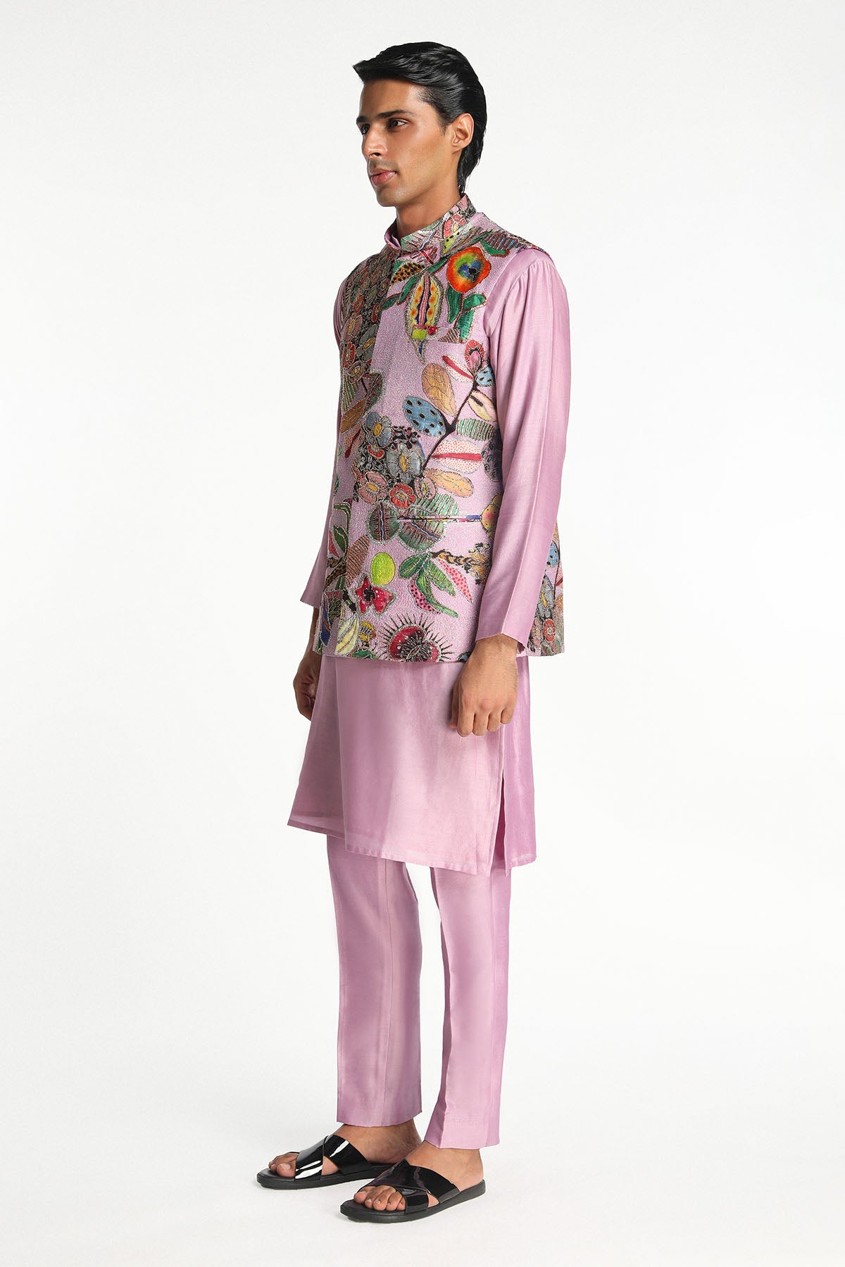 Kinfolk lilac printed embellished kora dupion bundi with habutai silk kurta & straight pant