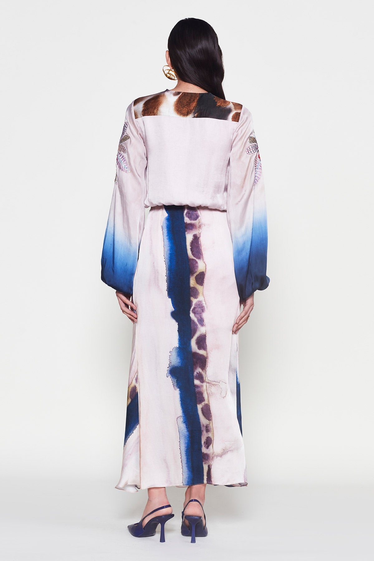 Rear silhouette of Kinfolk printed satin dress – full sleeve