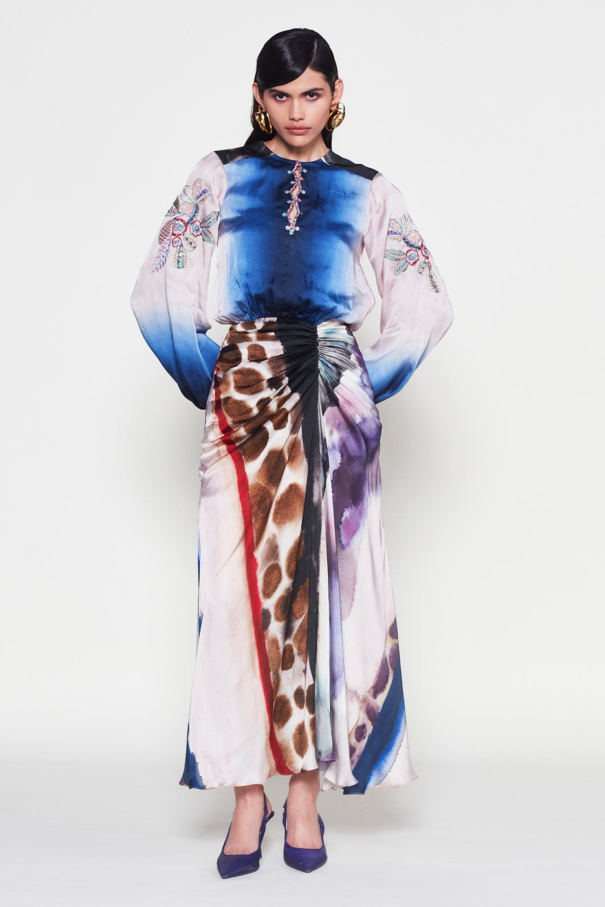 This piece by Aisha Rao is handcrafted using upcycled fabrics and artisan techniques. Variations in color, embroidery, print placement, print color, and texture are intentional and reflect the handmade nature of the garment. These differences are a mark of its uniqueness and craftsmanship. No two pieces are exactly alike.