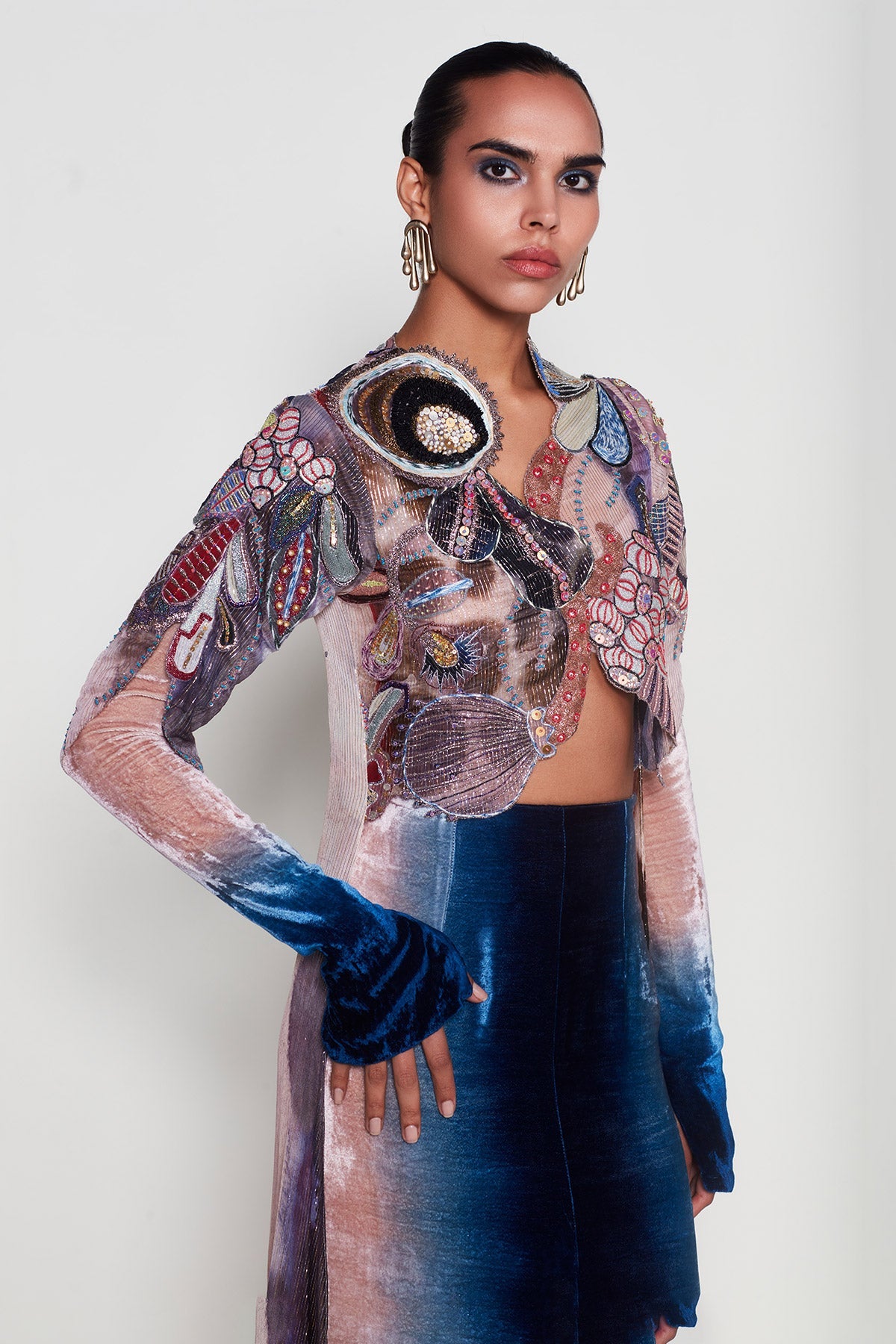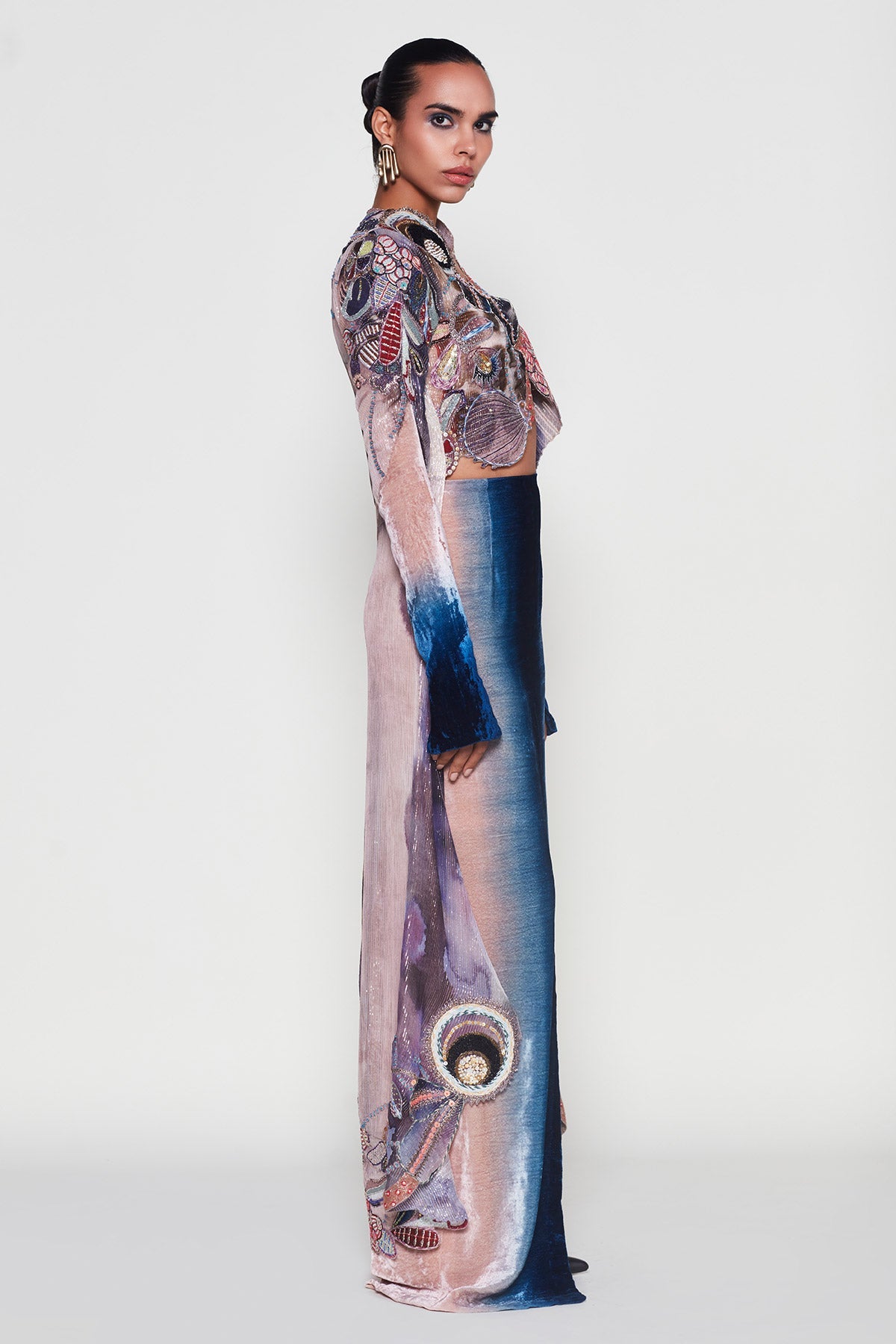 Kinfolk peach- blue printed applique embellished lurex jacket with velvet blouse and front slit skirt.