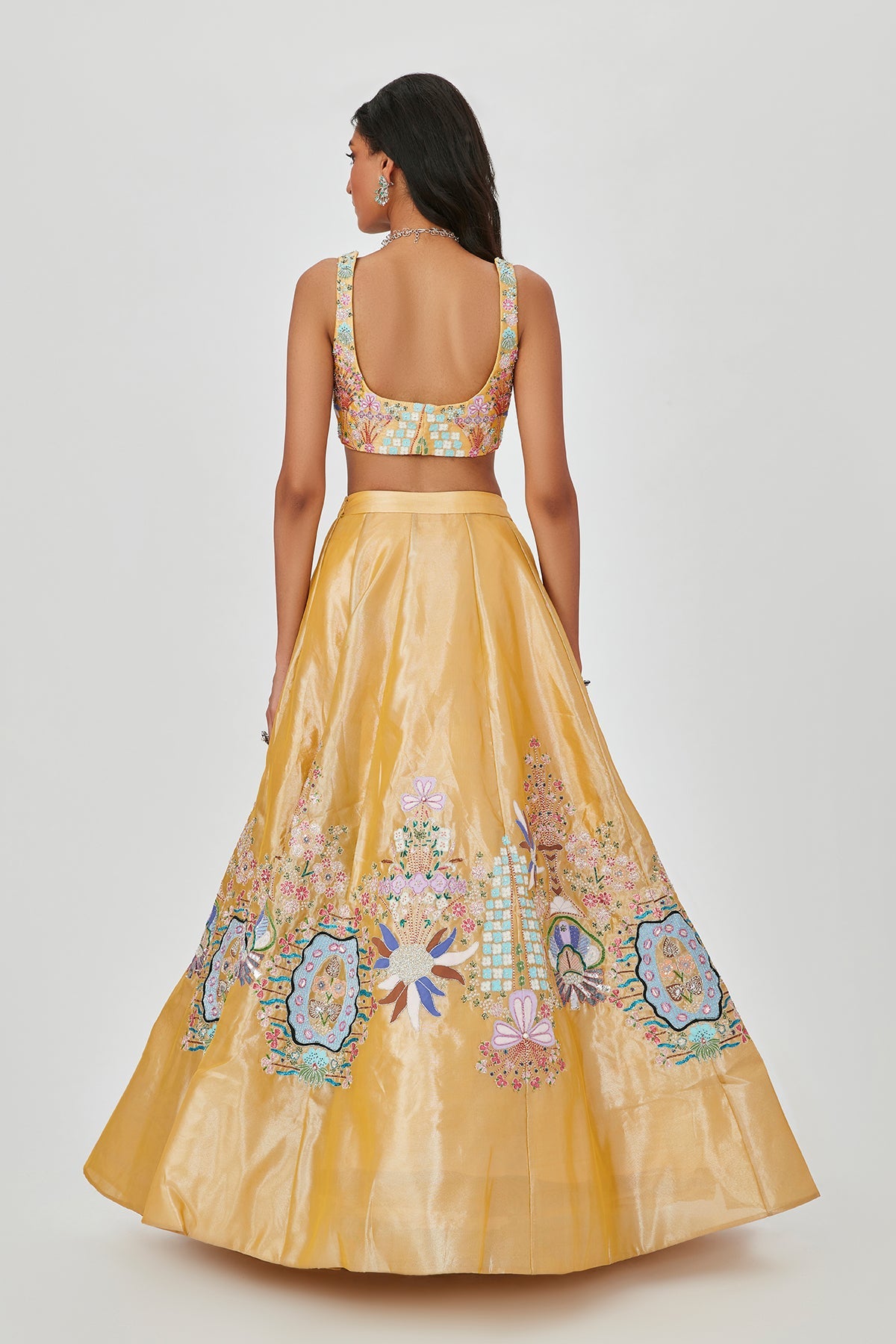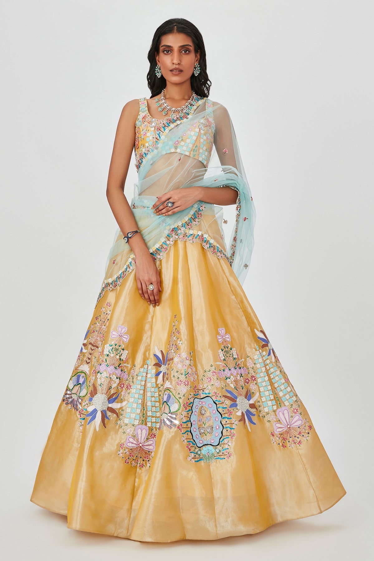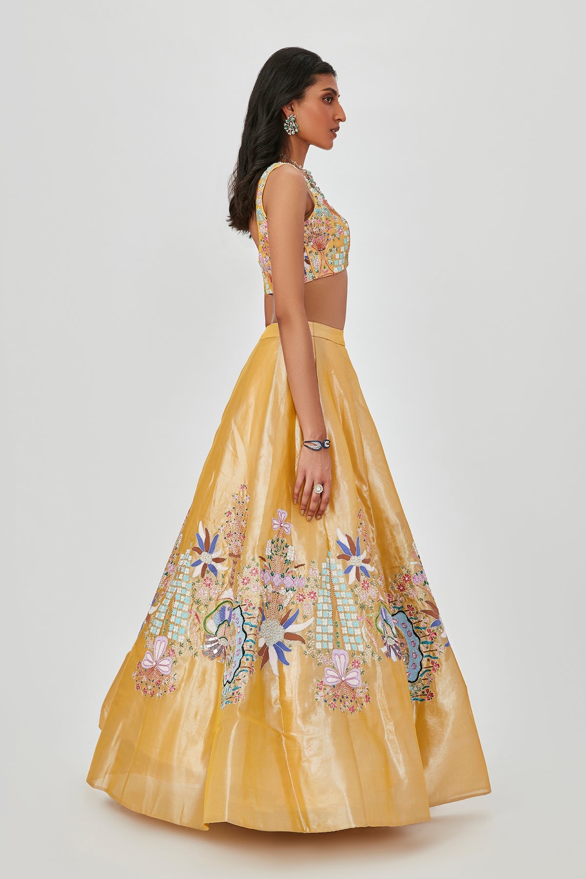 Yellow Tissue appliqued and embellished MK lehenga with sleeveless blouse and scallop dupatta.