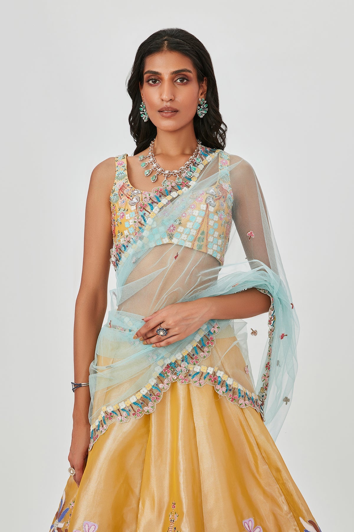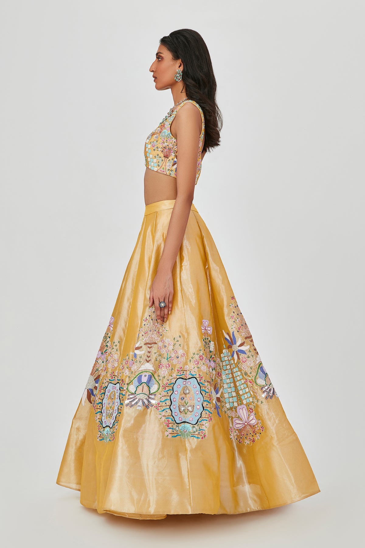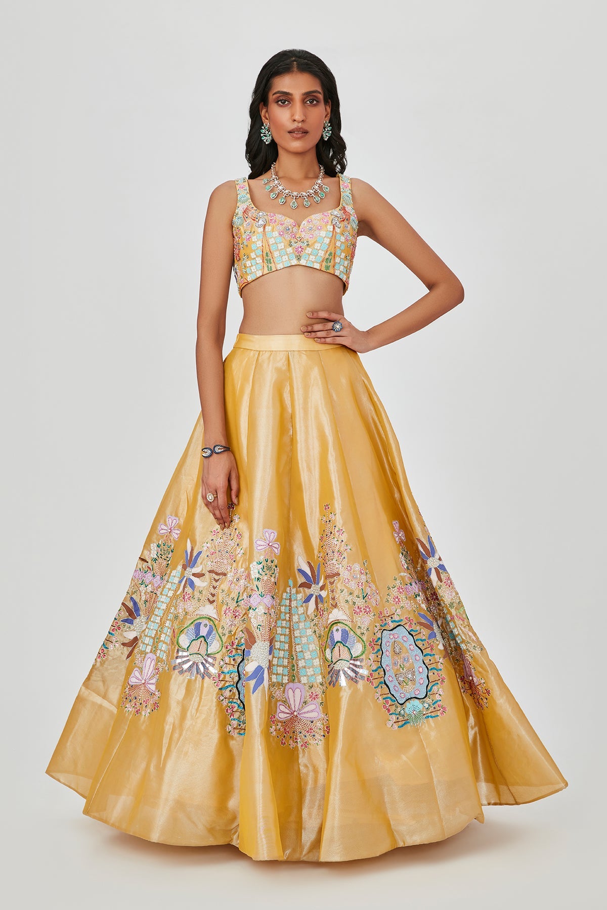 Yellow Tissue appliqued and embellished MK lehenga with sleeveless blouse and scallop dupatta.