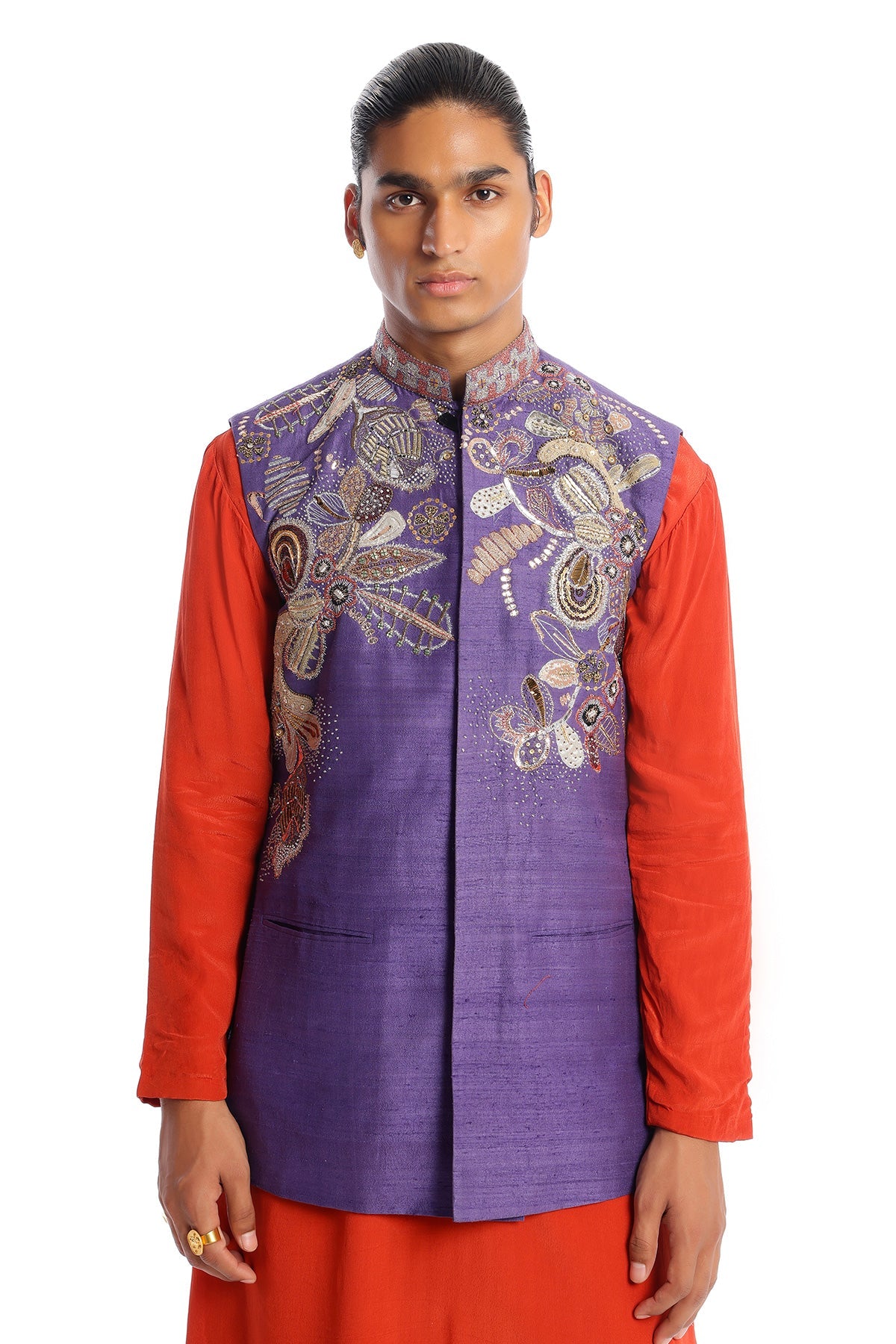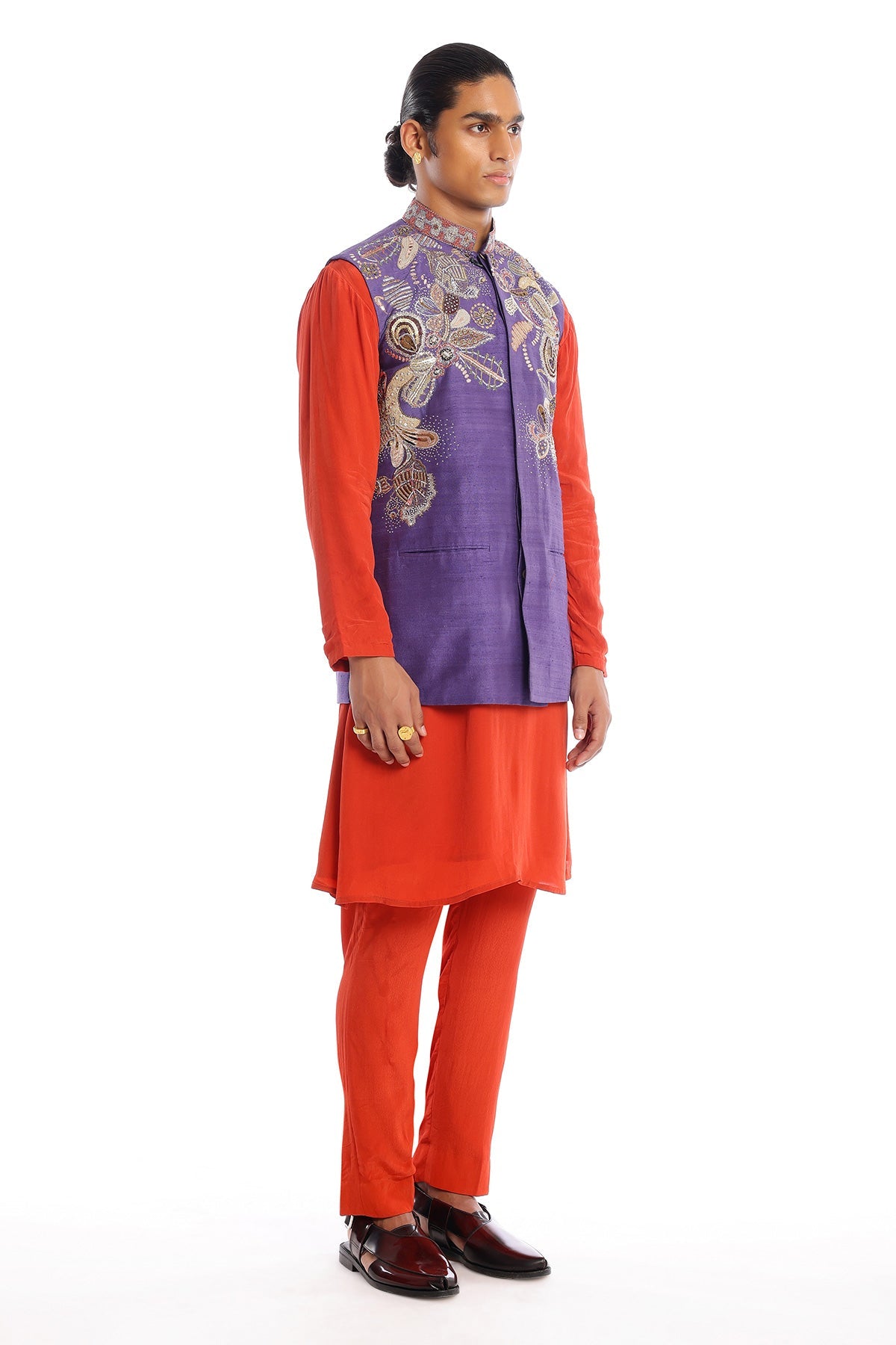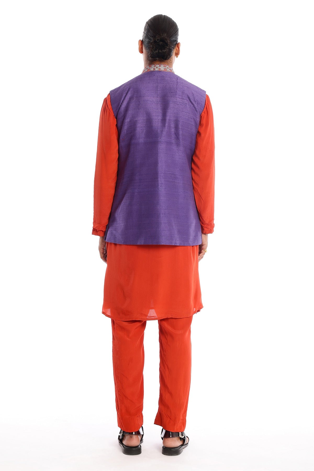 Kinfolk violet applique embellished raw silk bundi with red chanderi silk kurta & straight pant