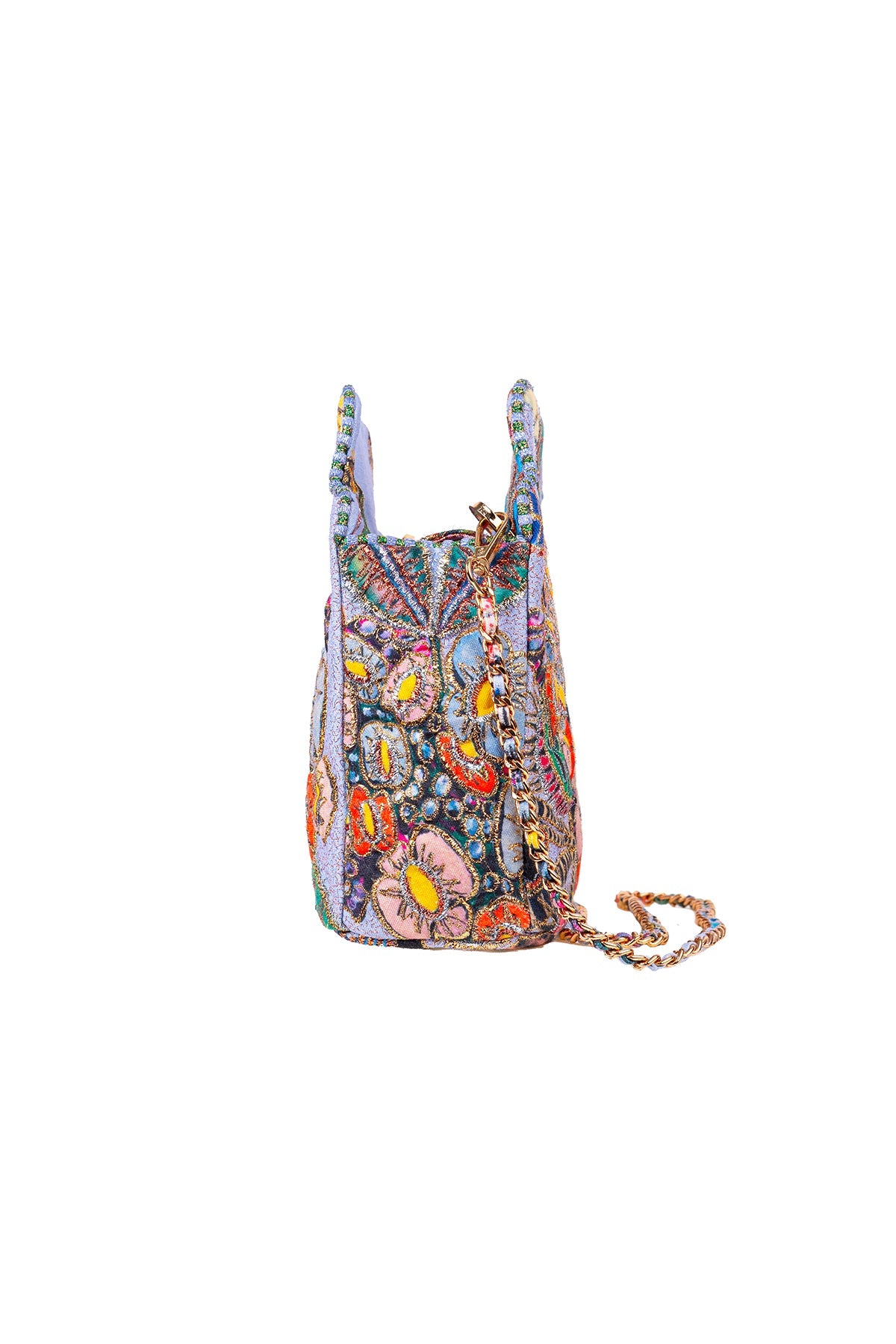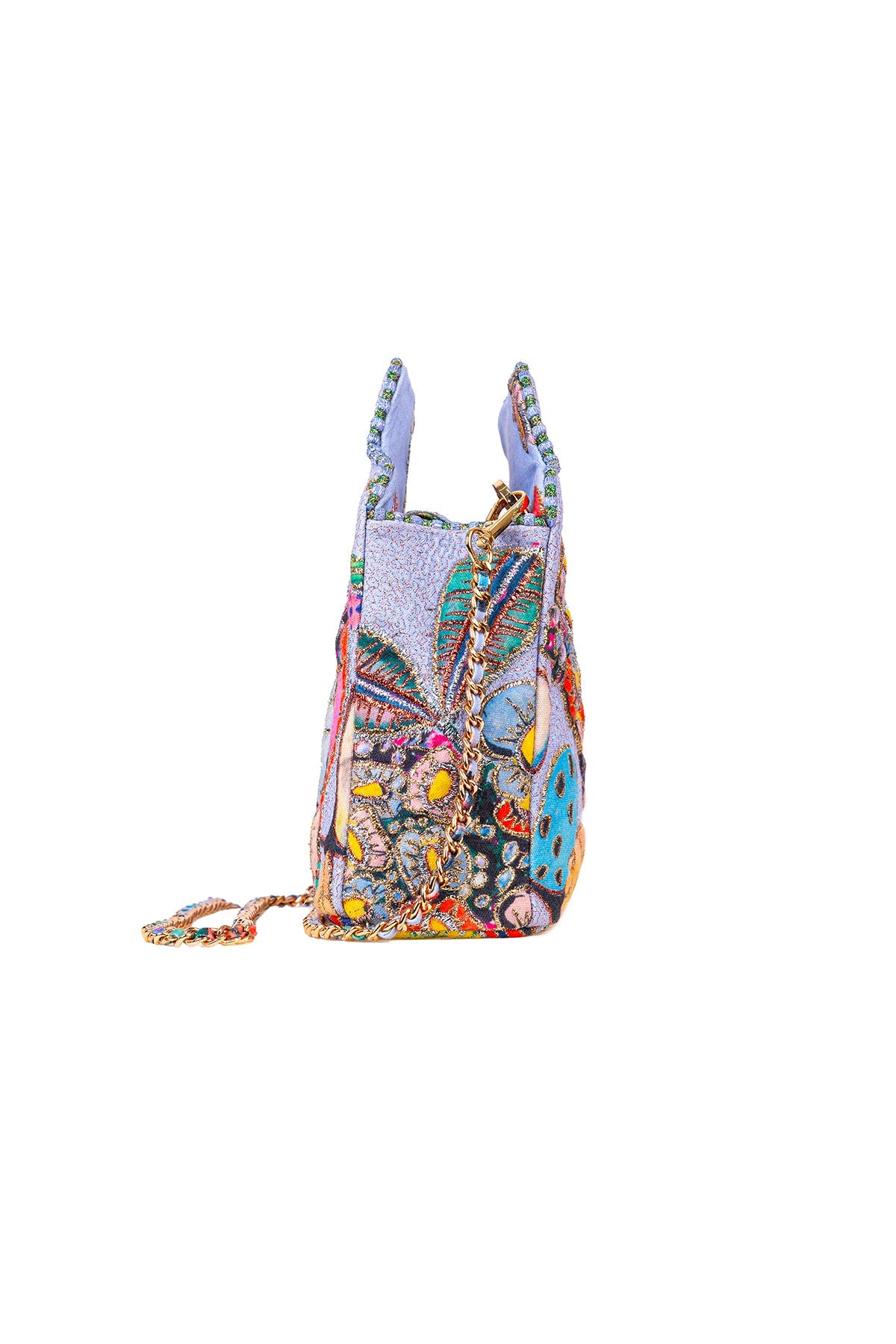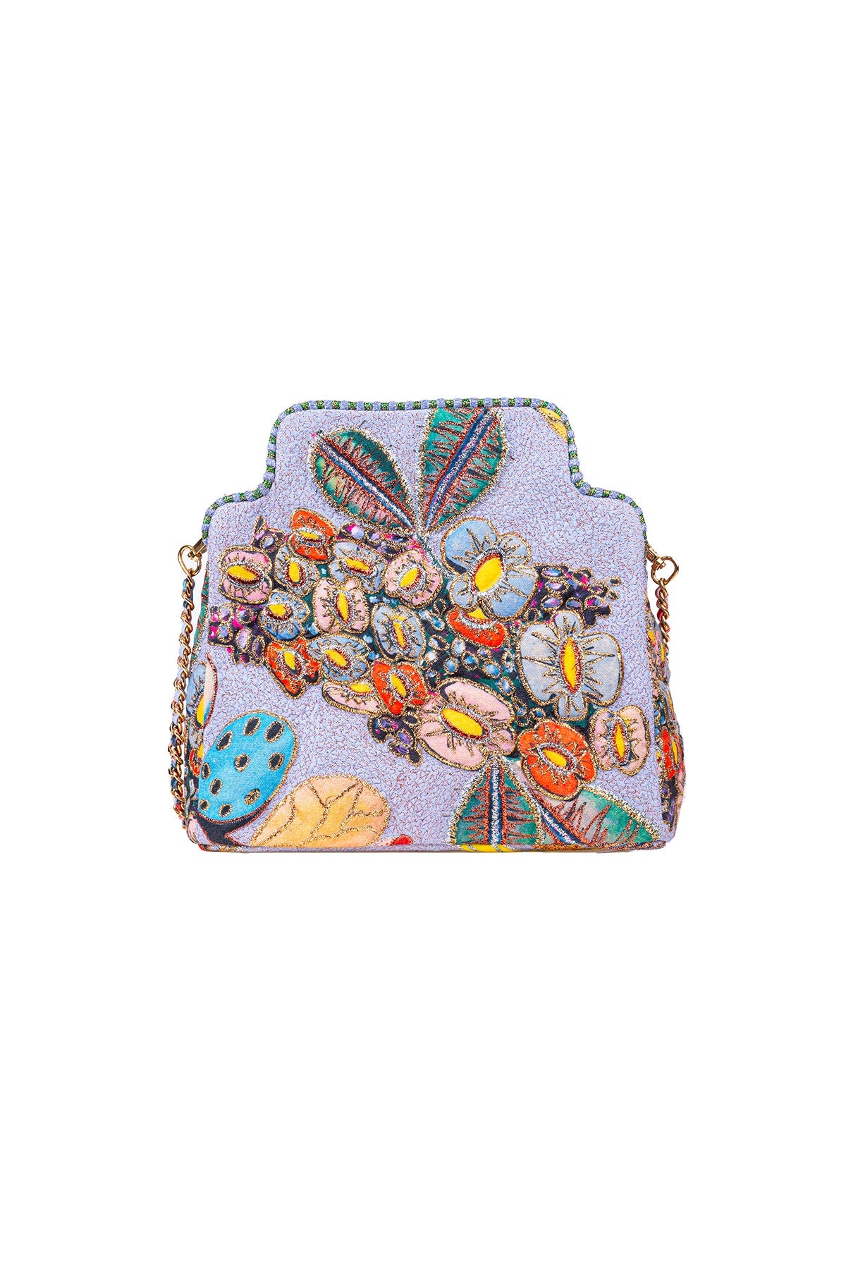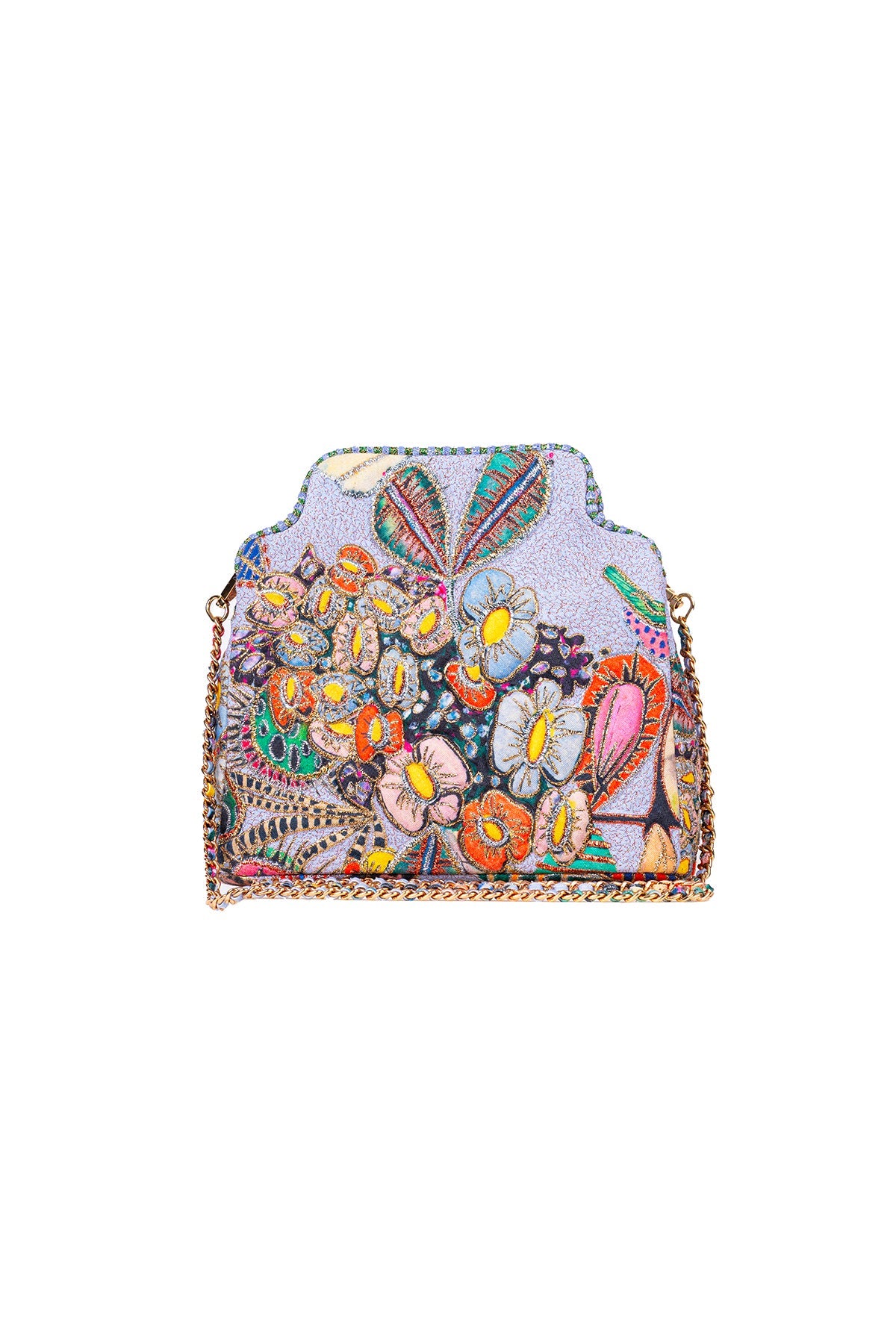 Kinfolk periwinkle printed embellished canvas frame bag with chain handle