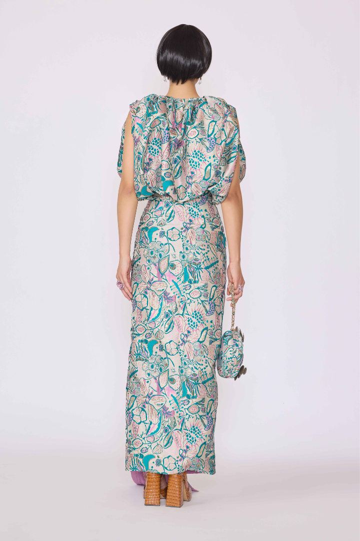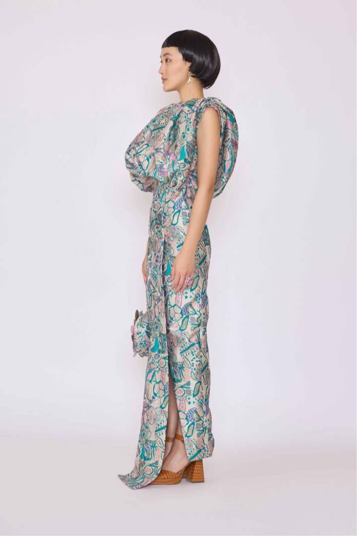Kinfolk pink- green jacquard gathered waist and neckline with twisted detail assymetric hem gown