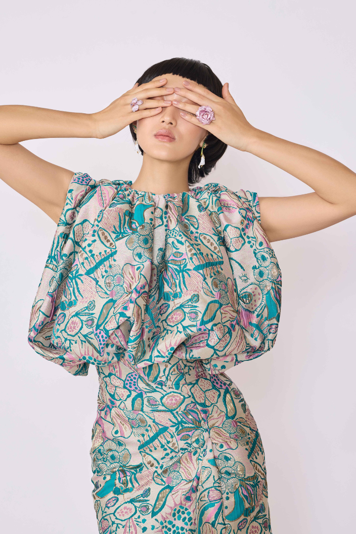 Woman wearing Kinfolk pink-green jacquard asymmetric gown