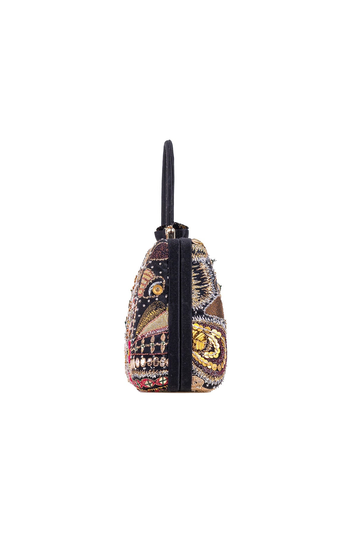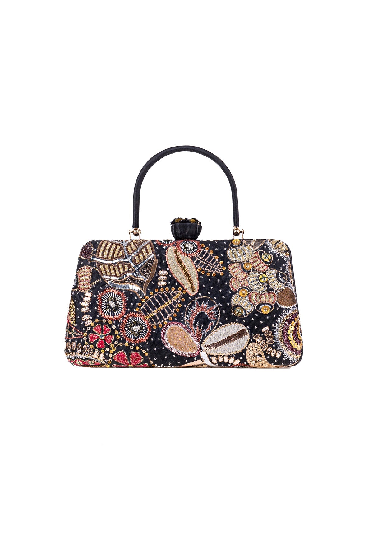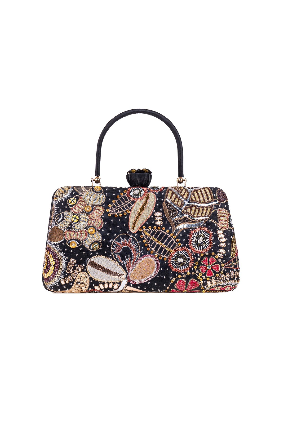 Kinfolk black applique embellished satin trapeze shape minaudiere with handle & flower detail