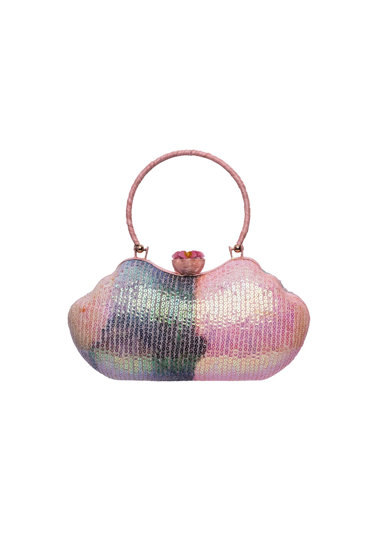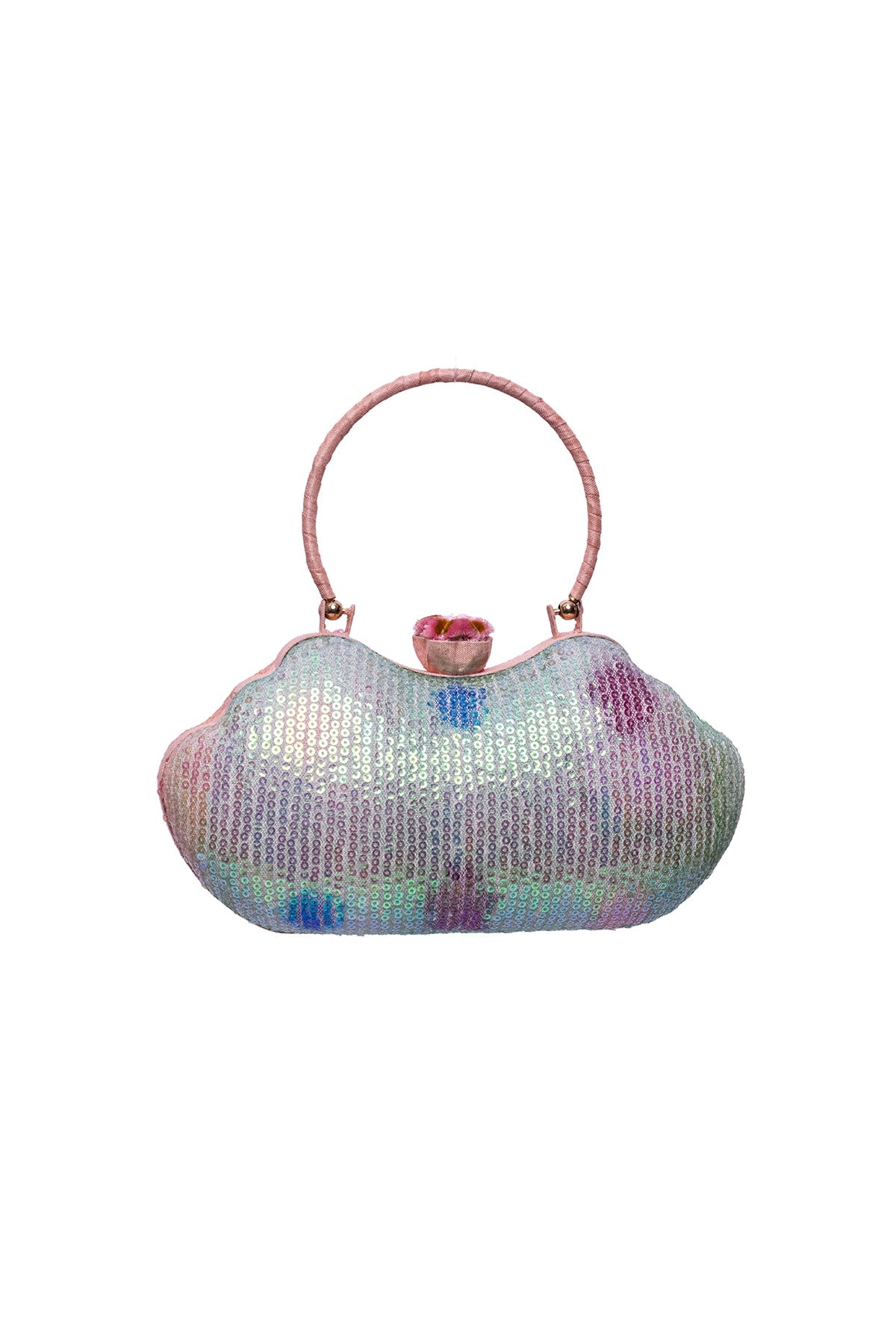 Kinfolk aurora printed sequin tulle lip shape minaudiere with handle & flower detail