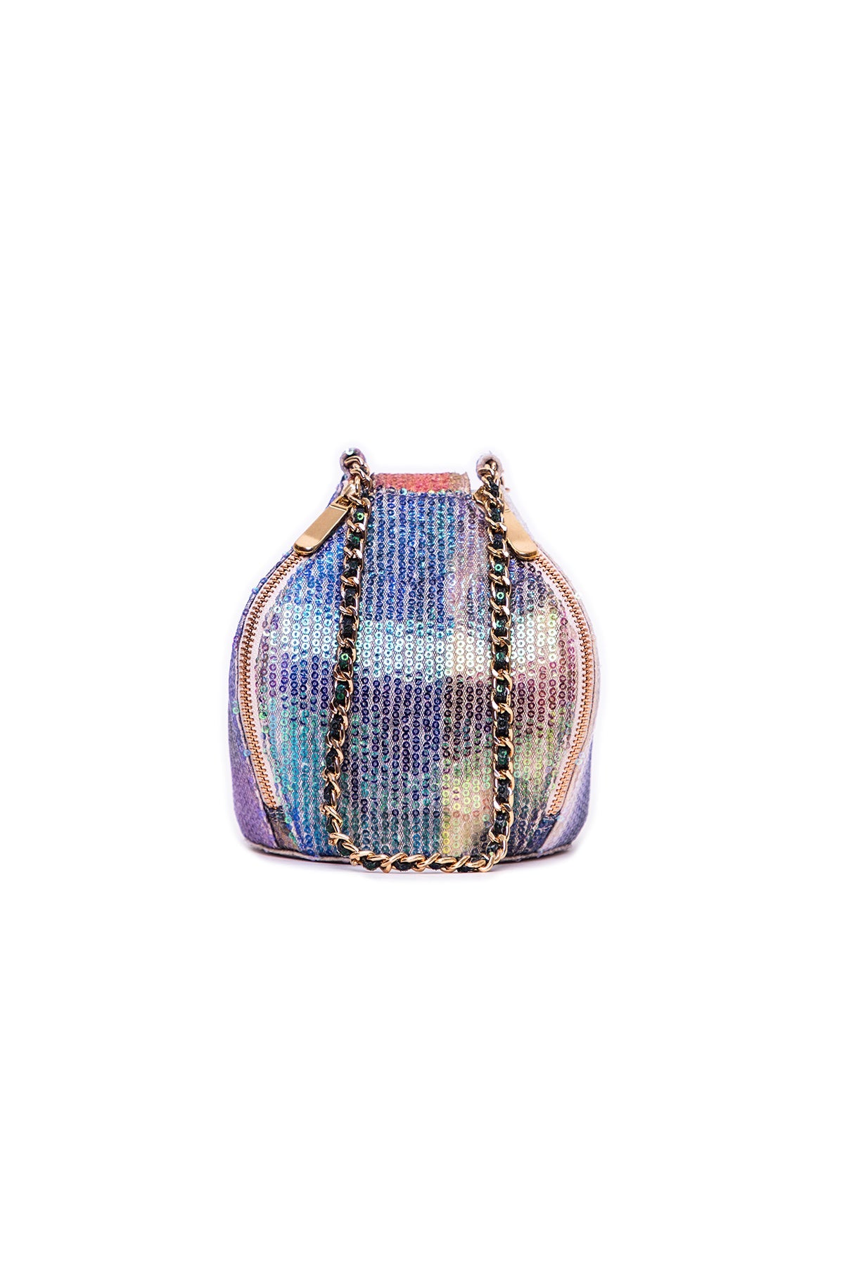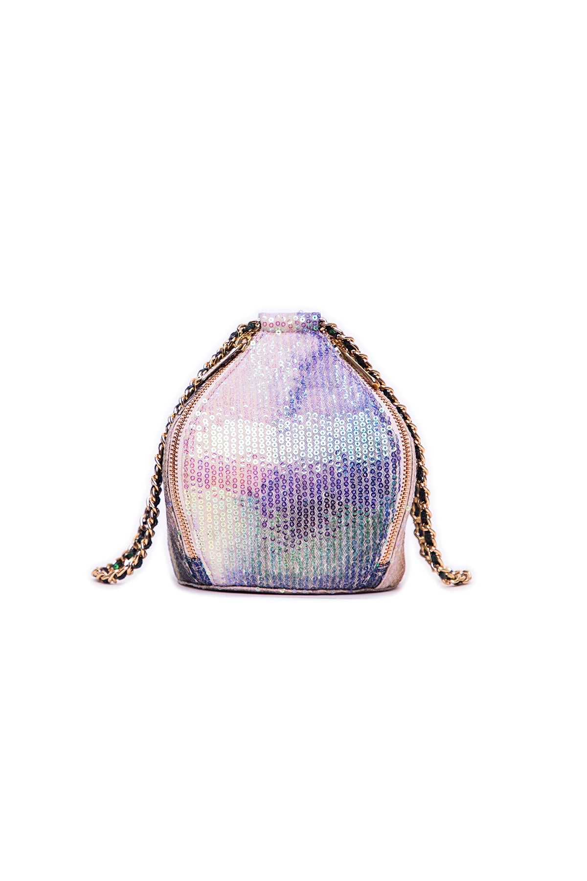 Kinfolk mist-printed embellished sequin tulle bucket bag with golden chain handle