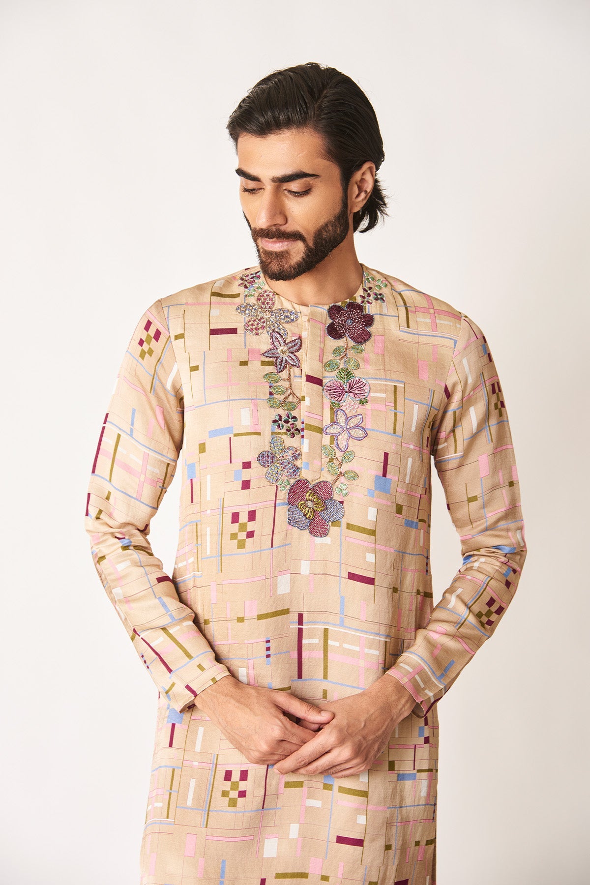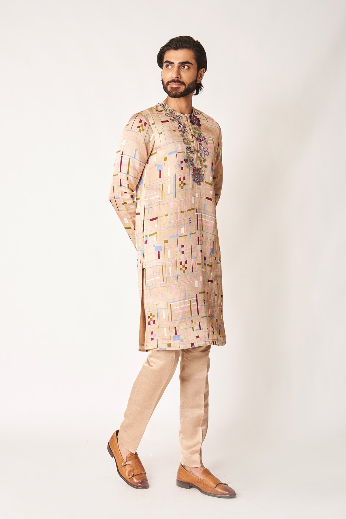 Man wearing mellow apricot printed kurta set