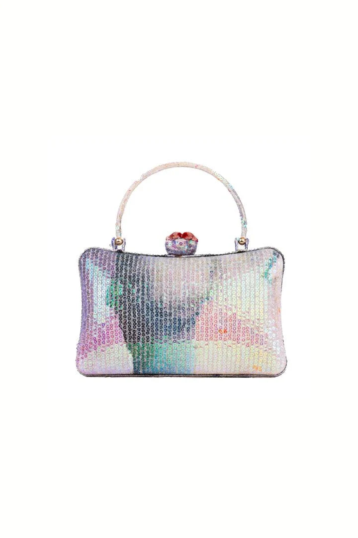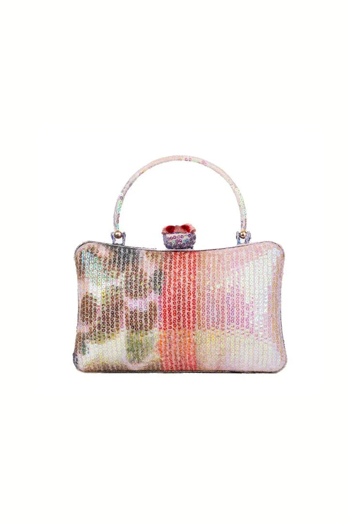 Kinfolk blotch brown sequin tulle slim box shape minaudiere with handle & flower detail