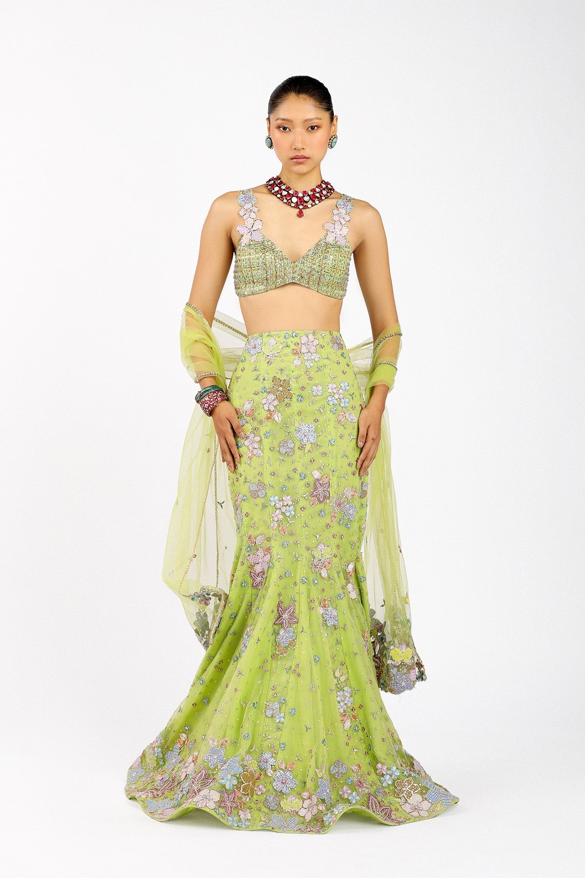 Matilda lime green applique embellished tulle mermaid lehenga, bustier & dupatta