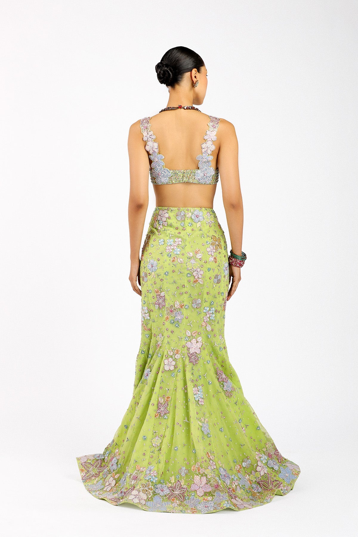 Lime green lehenga with applique back silhouette