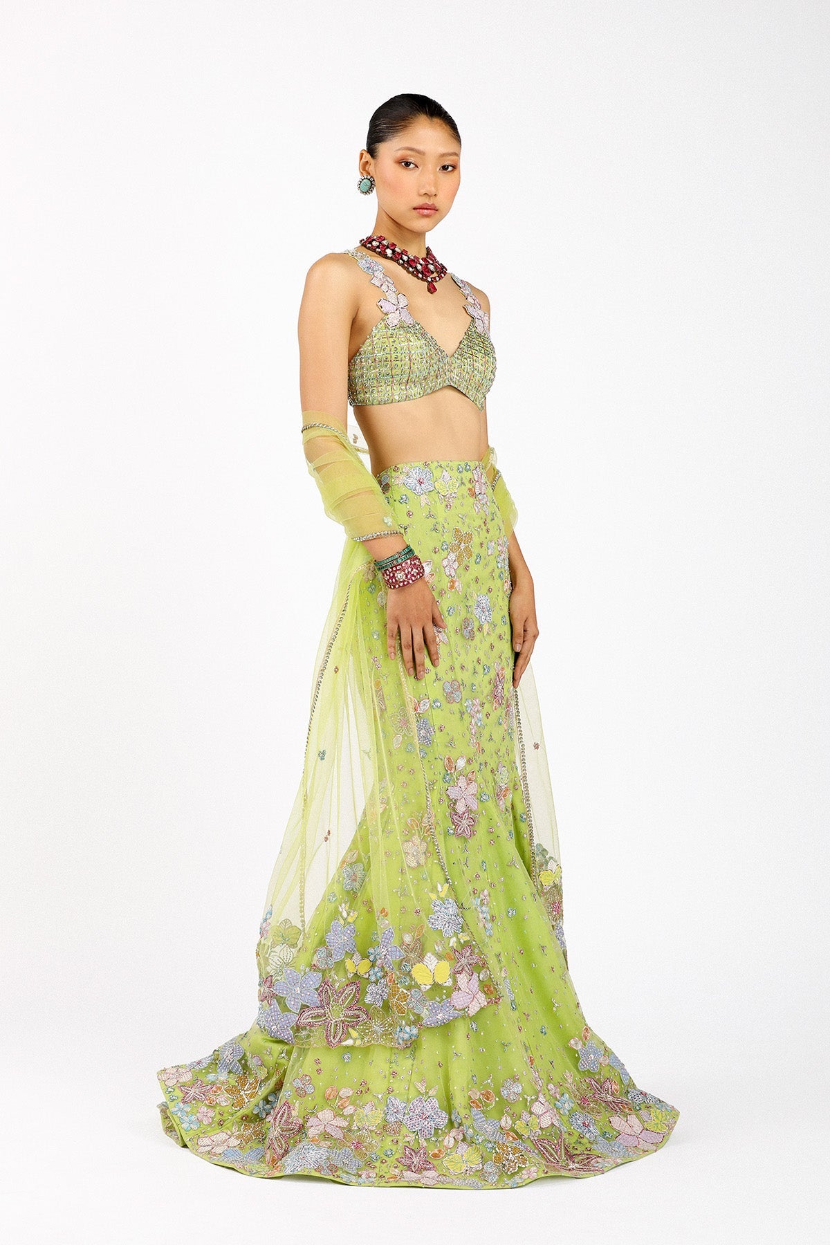 Side view of Matilda lime green tulle lehenga set
