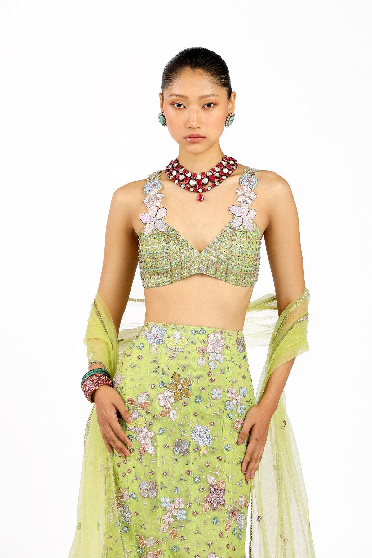 Lime green tulle applique detail on Matilda lehenga
