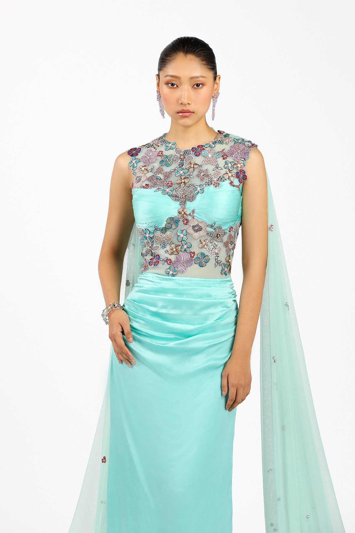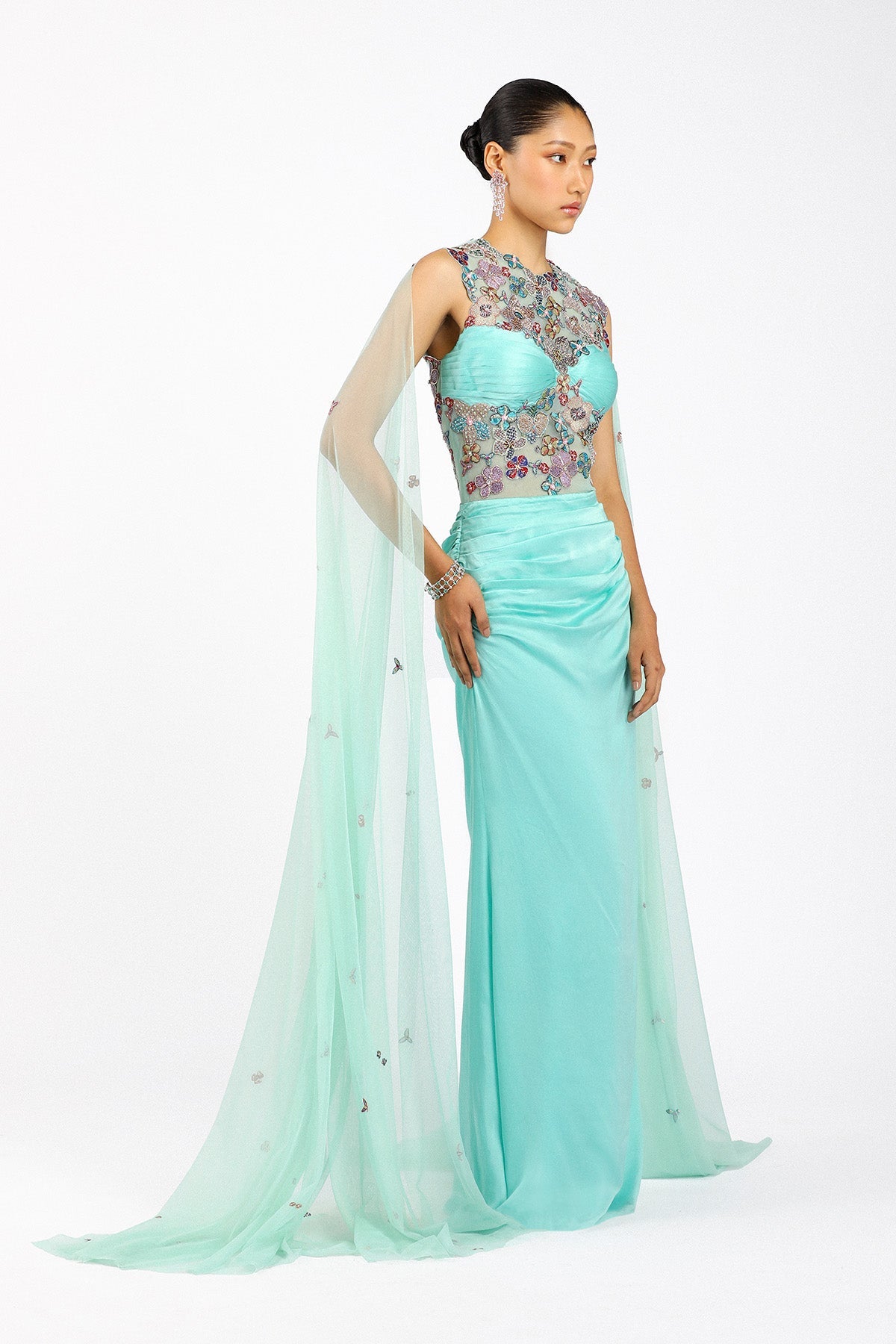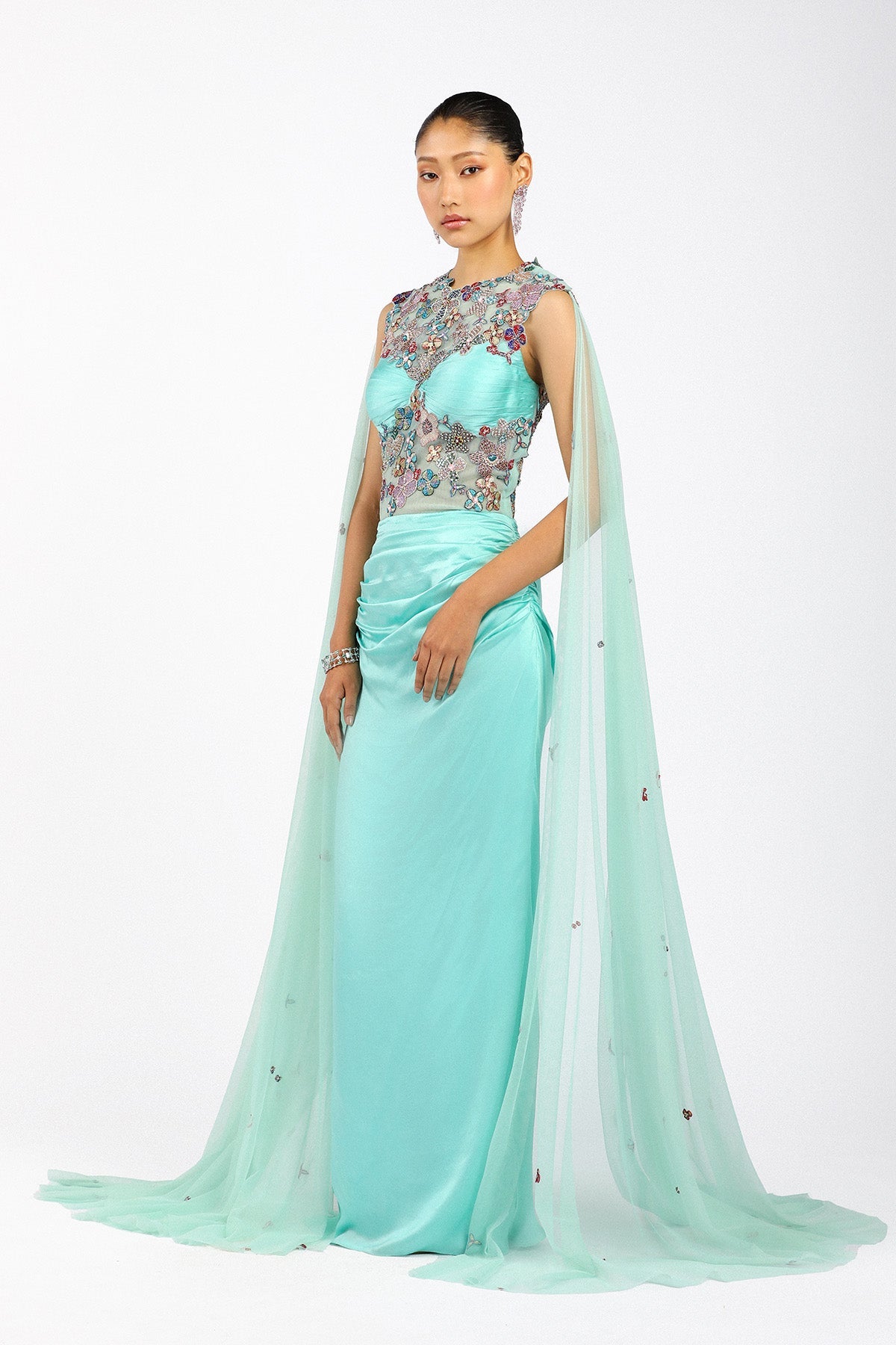 Matilda scuba blue satin gown side view with tulle cape