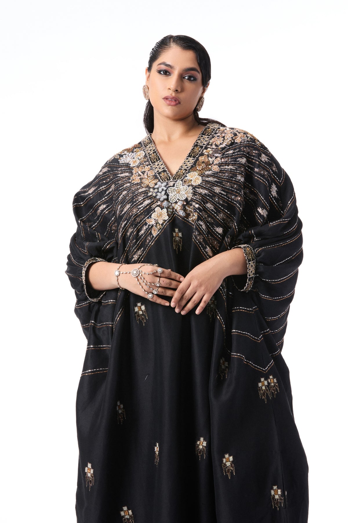 Wild at heart, black applique embellished dupion silk rays kaftan
