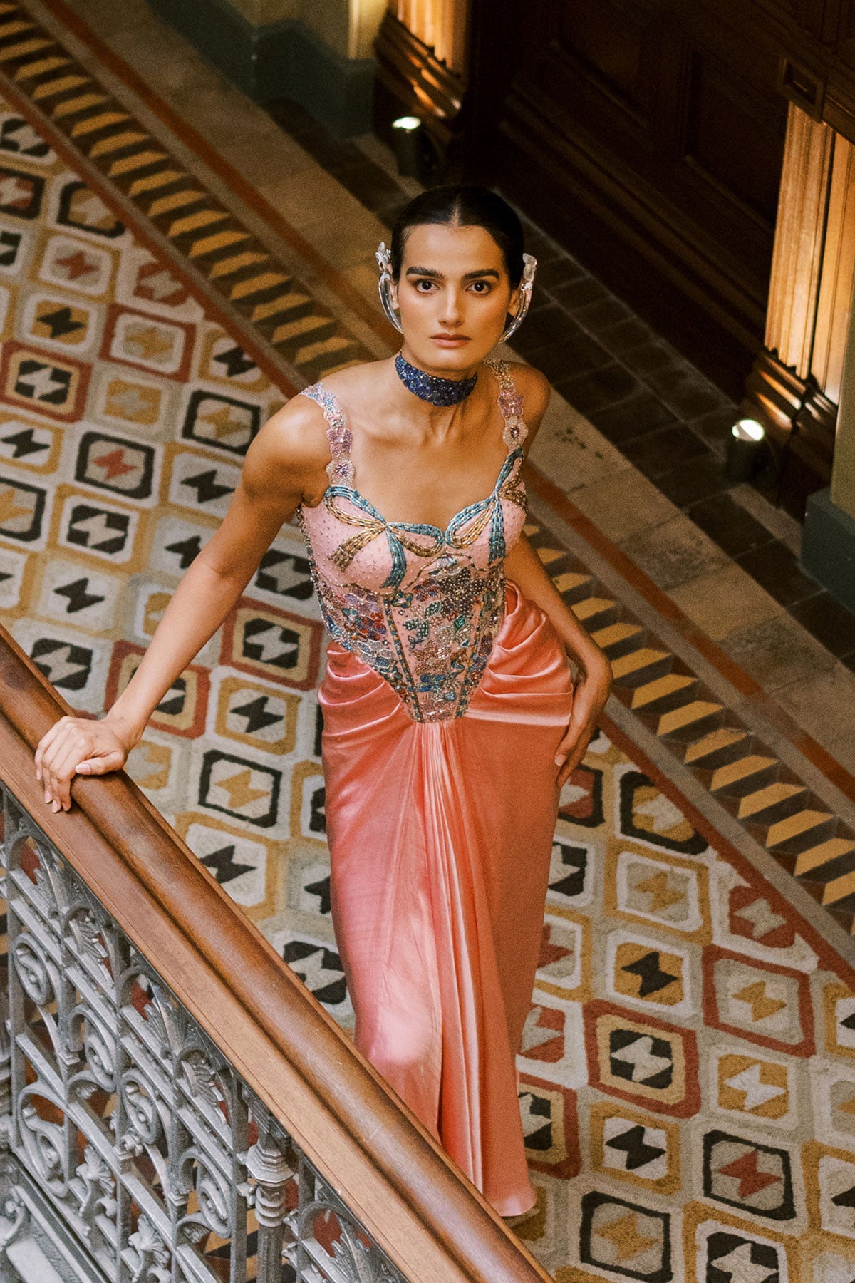 Matilda Cherry Blossom Applique Embellished Silky Satin Draped Pleated Skirted Gown