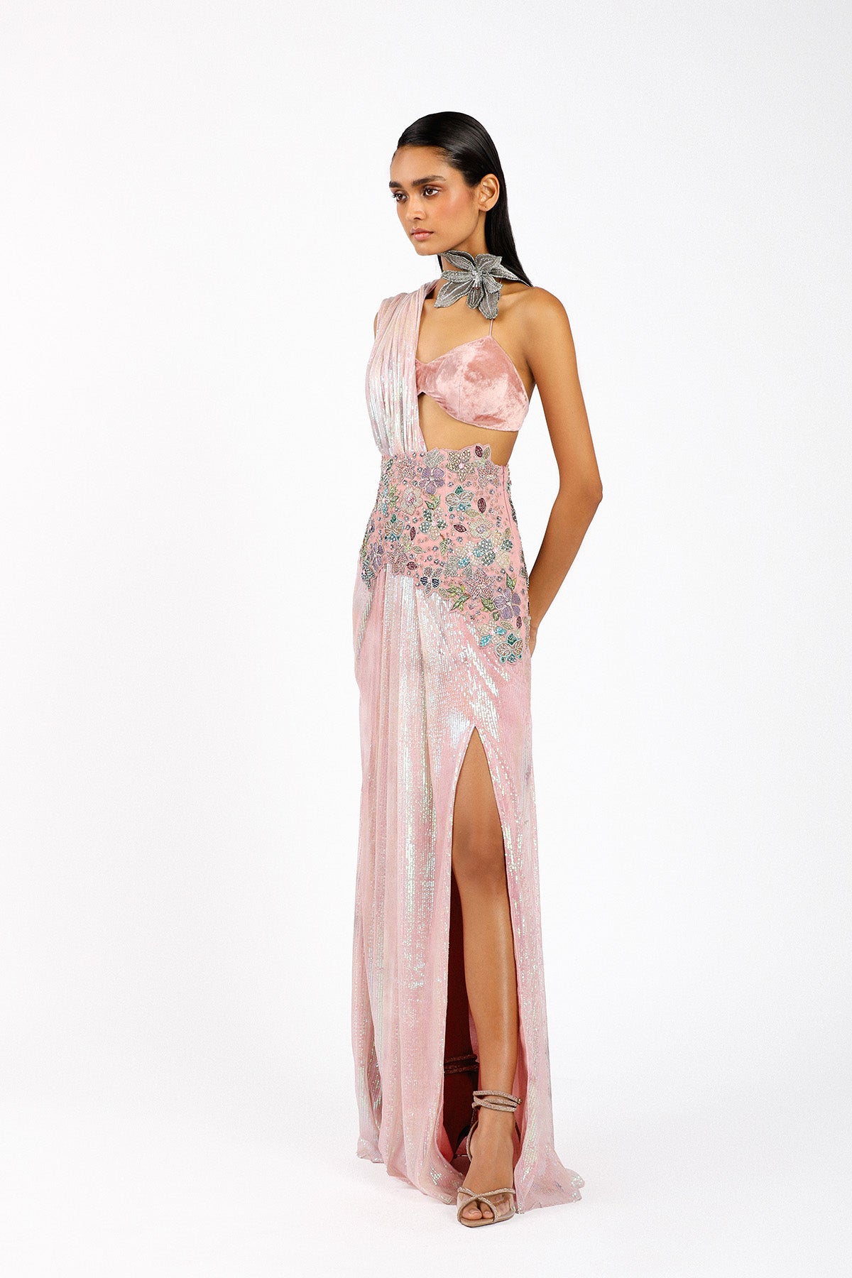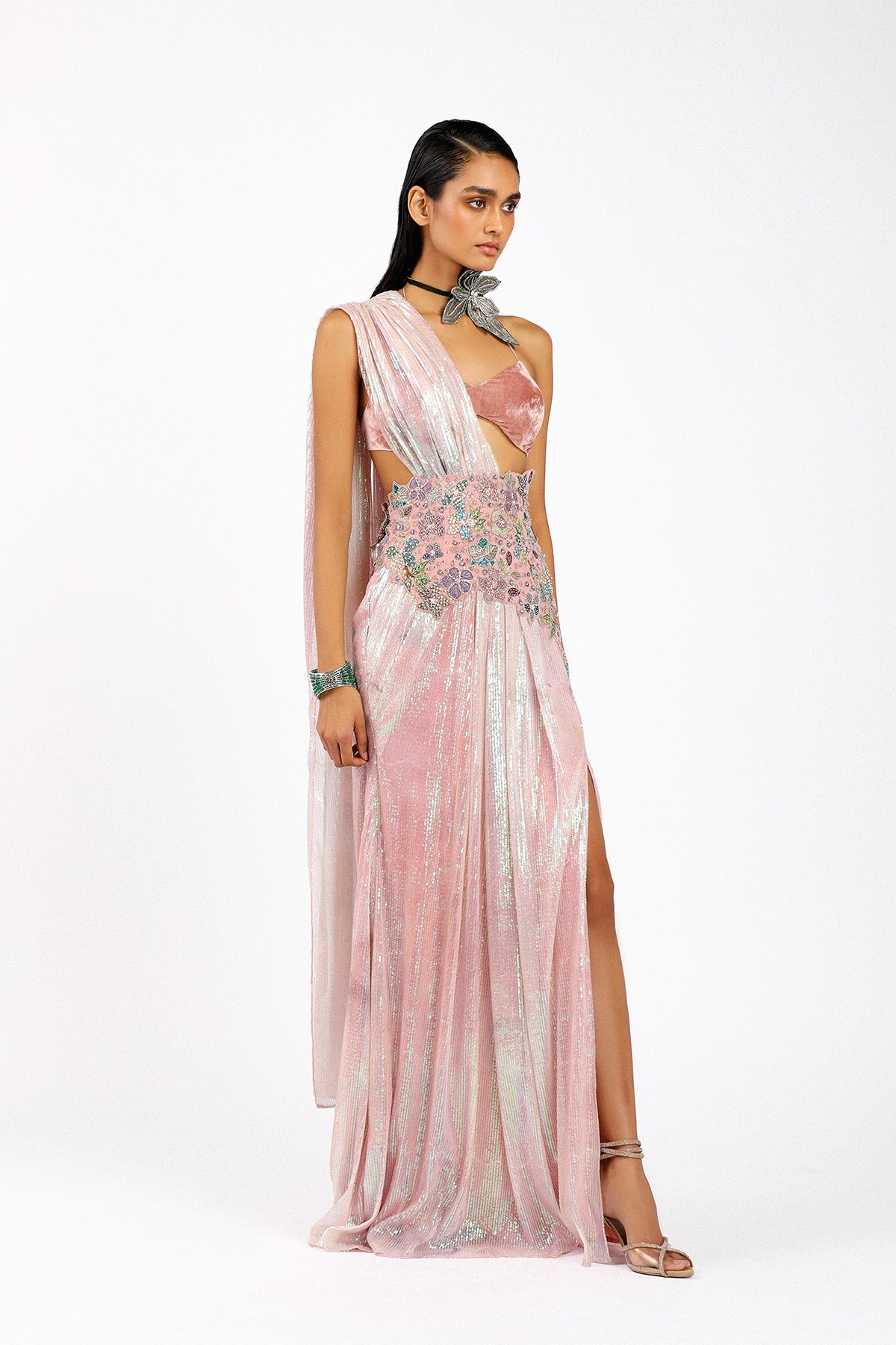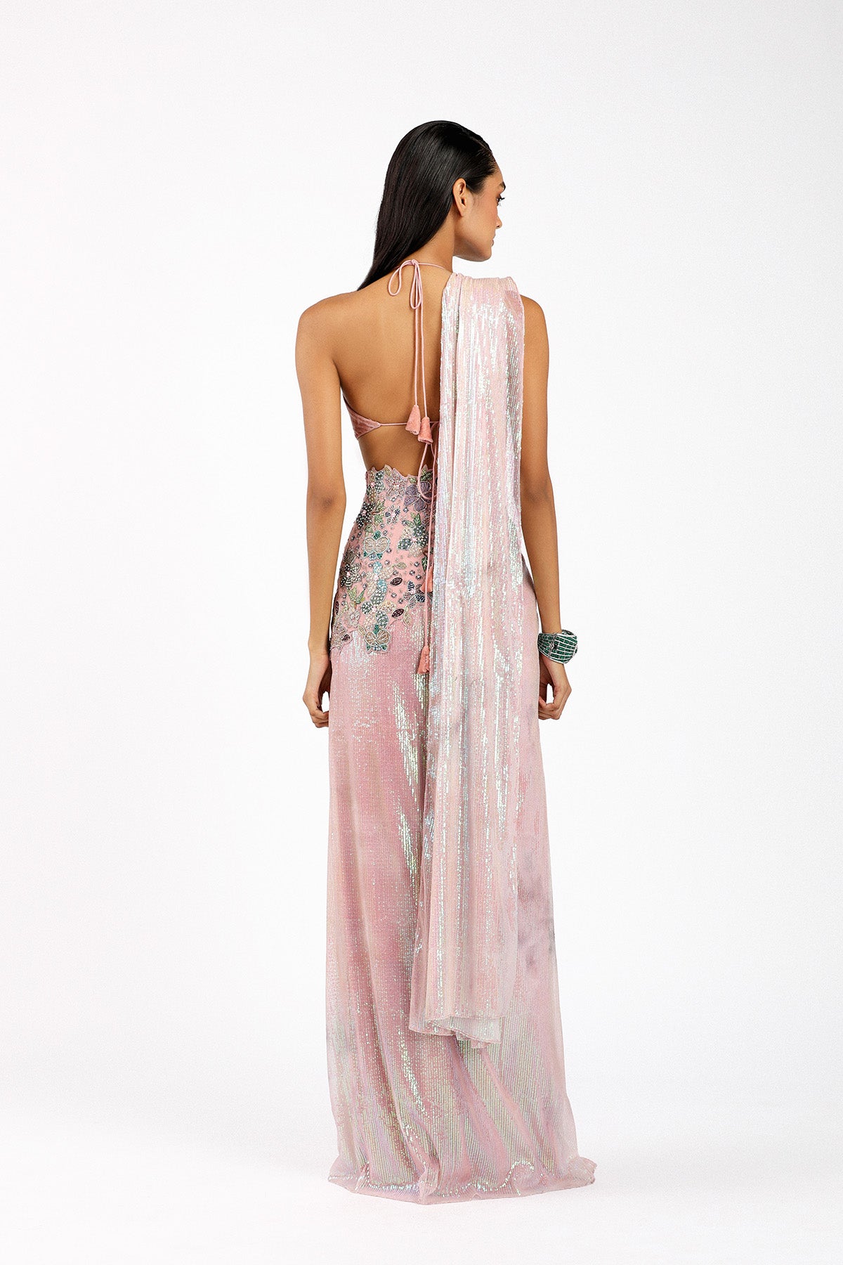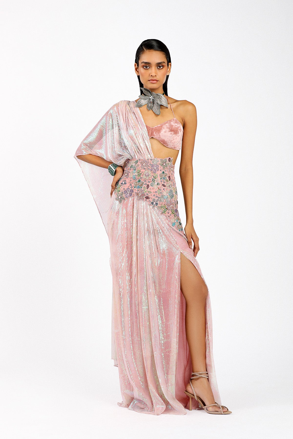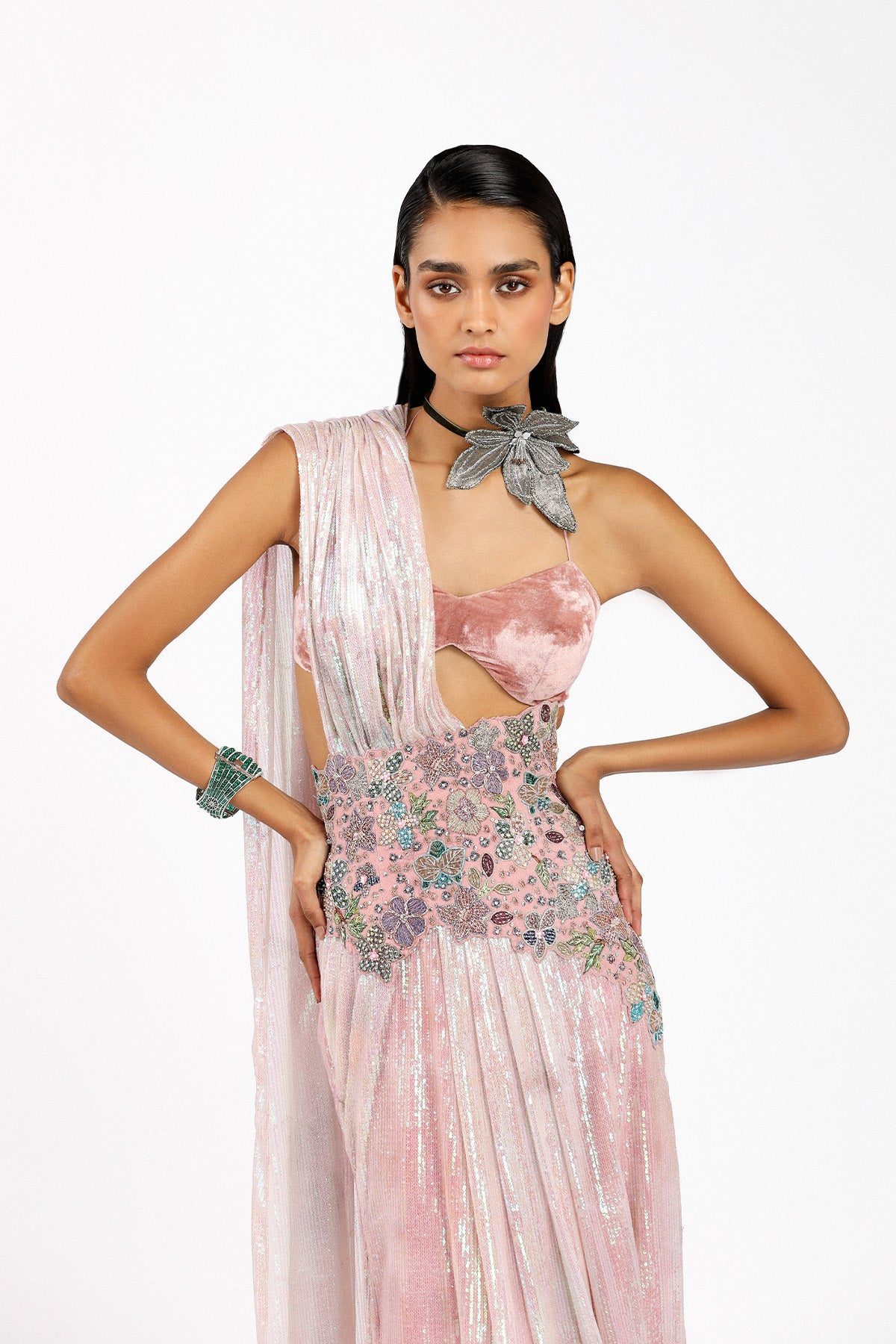 Matilda blush pink applique embellished corset with printed sequin tulle pre-drapped saree & velvet bralette