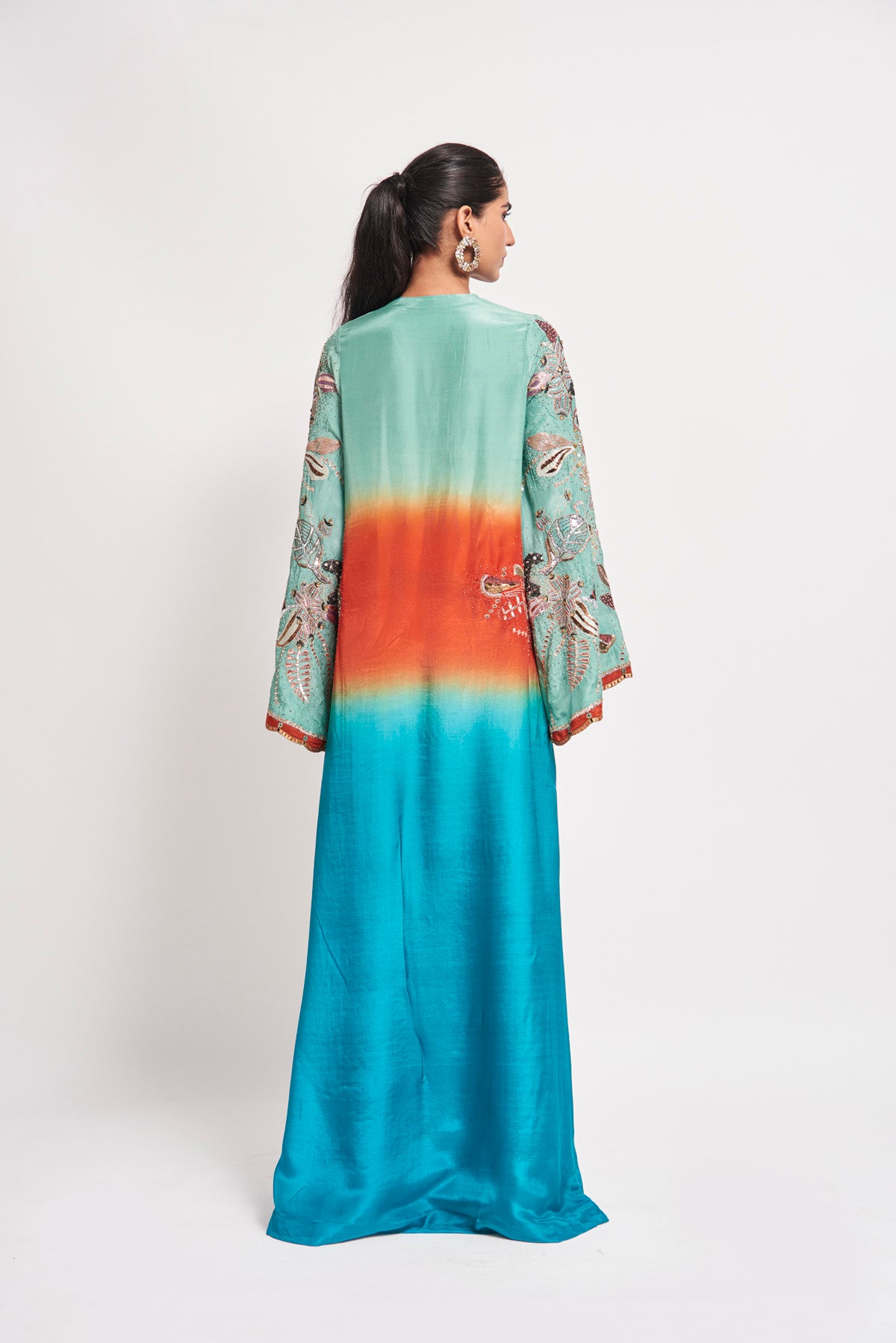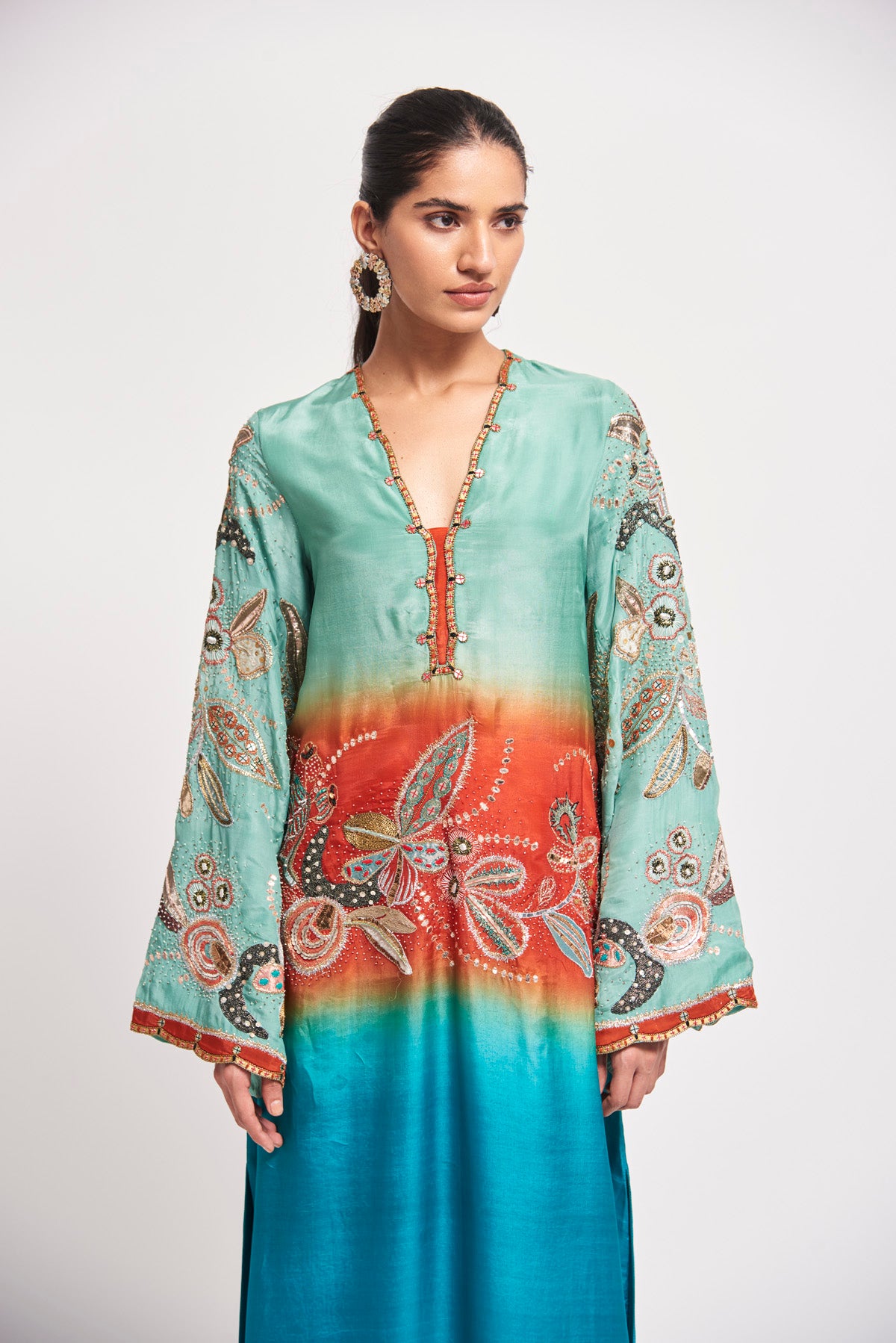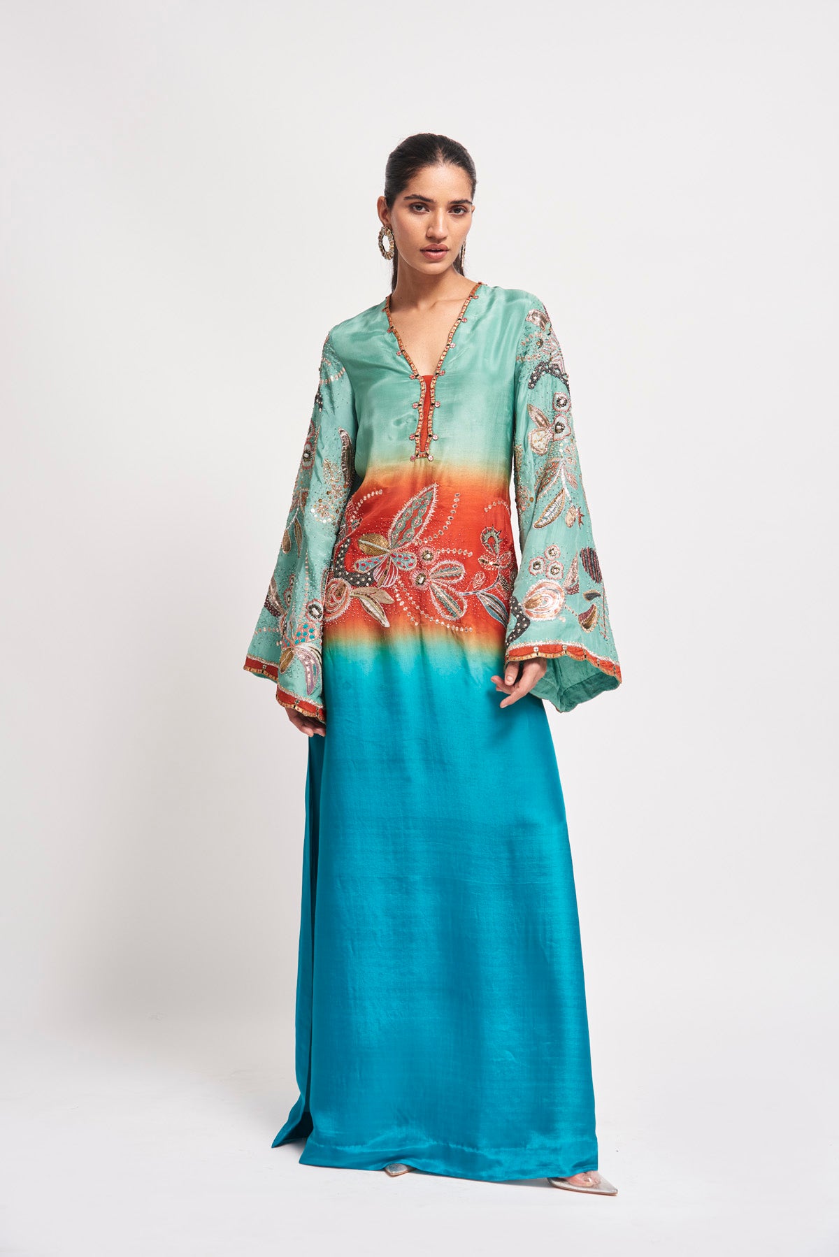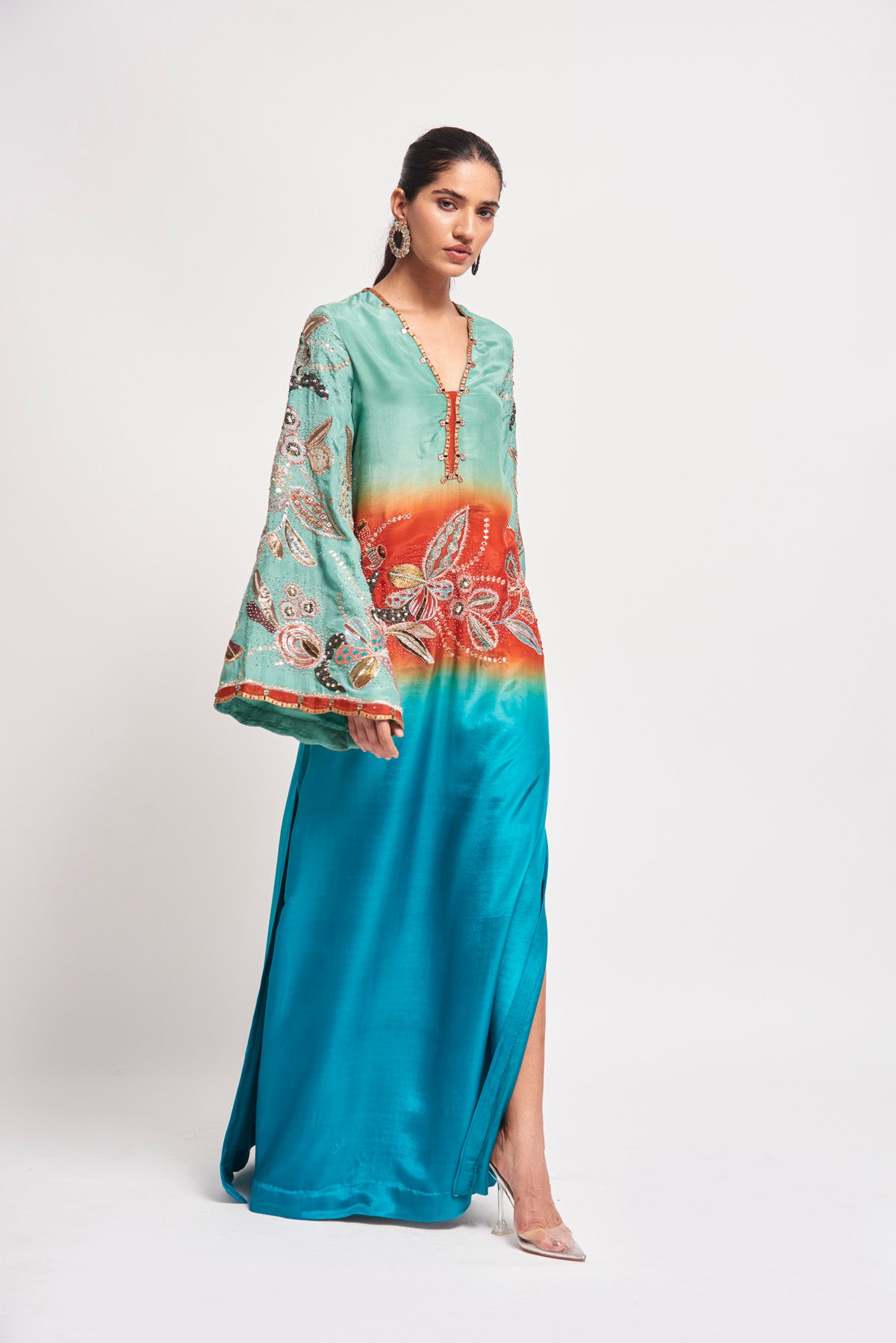 Kinfolk capri blue ombre applique embellished habutai silk 'v' neckline kaftan