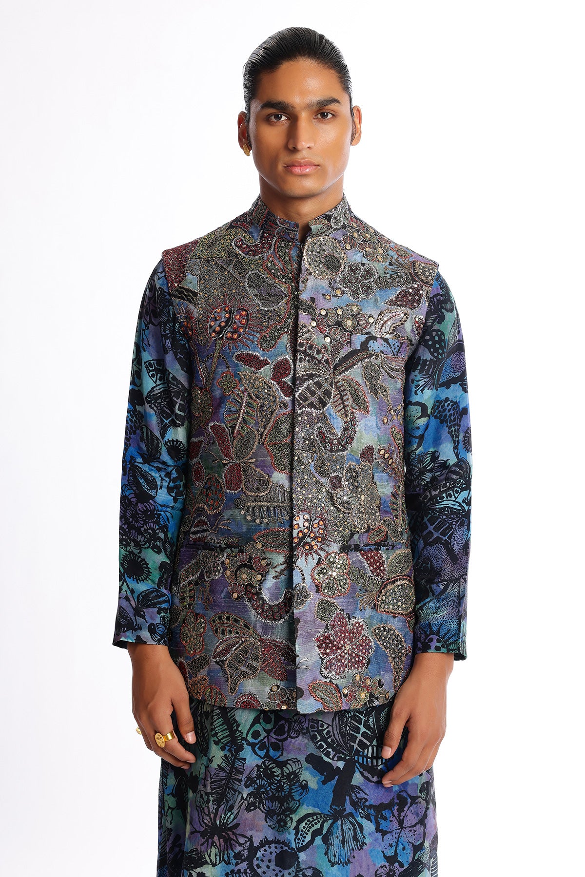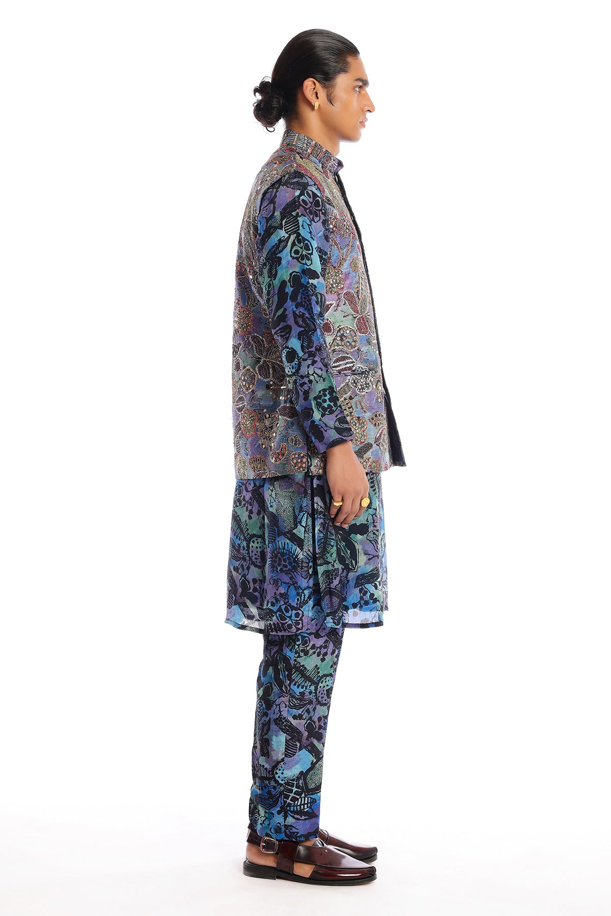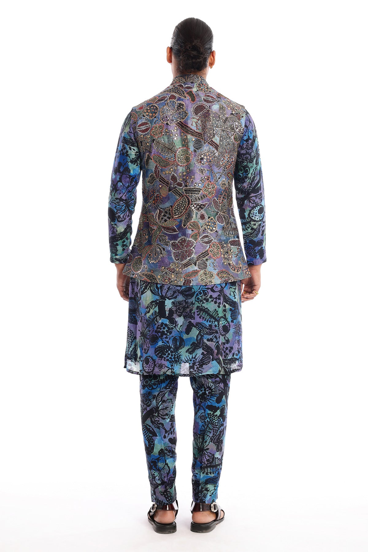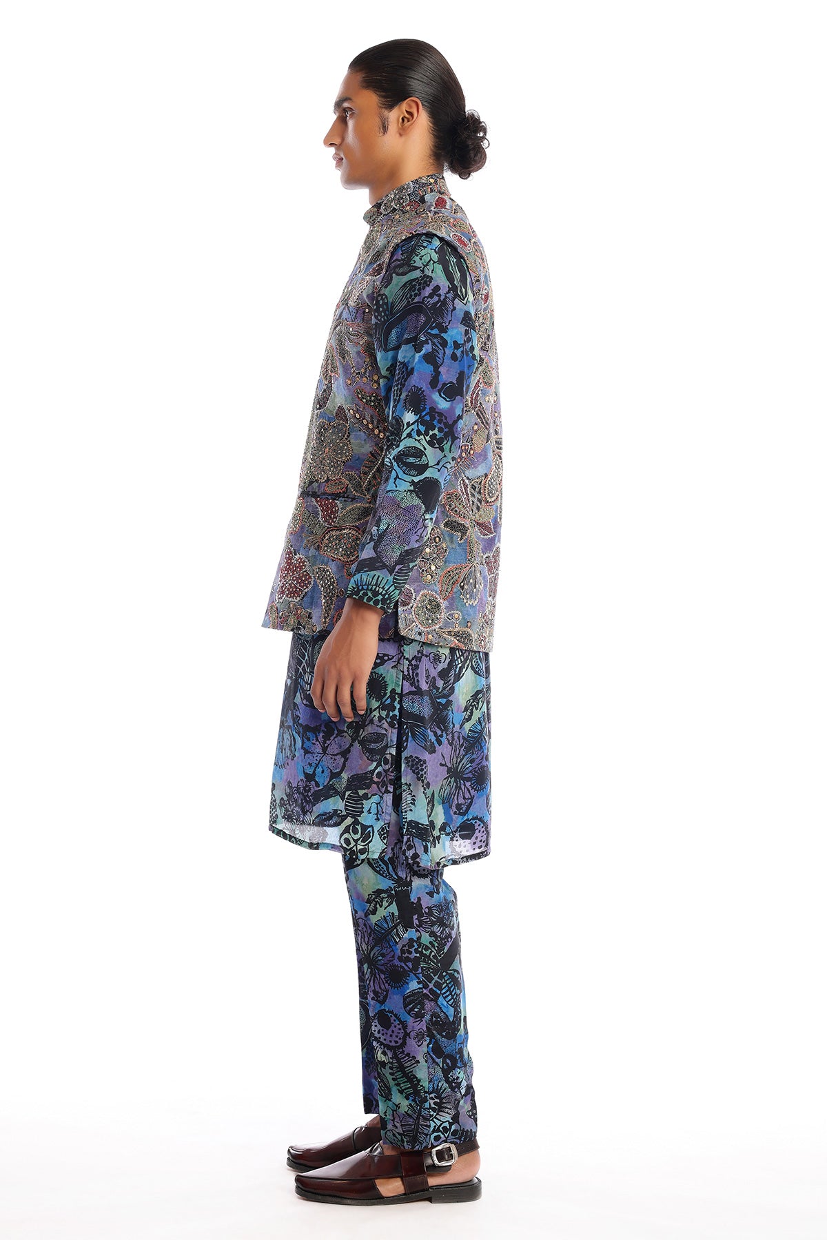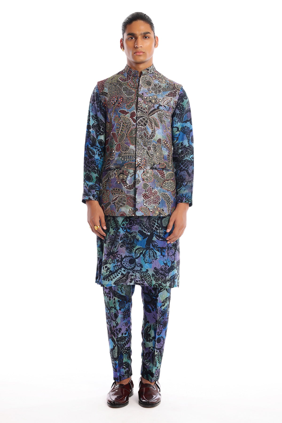 Kinfolk spectrum blue printed embellished kora dupion bundi with habotai silk kurta