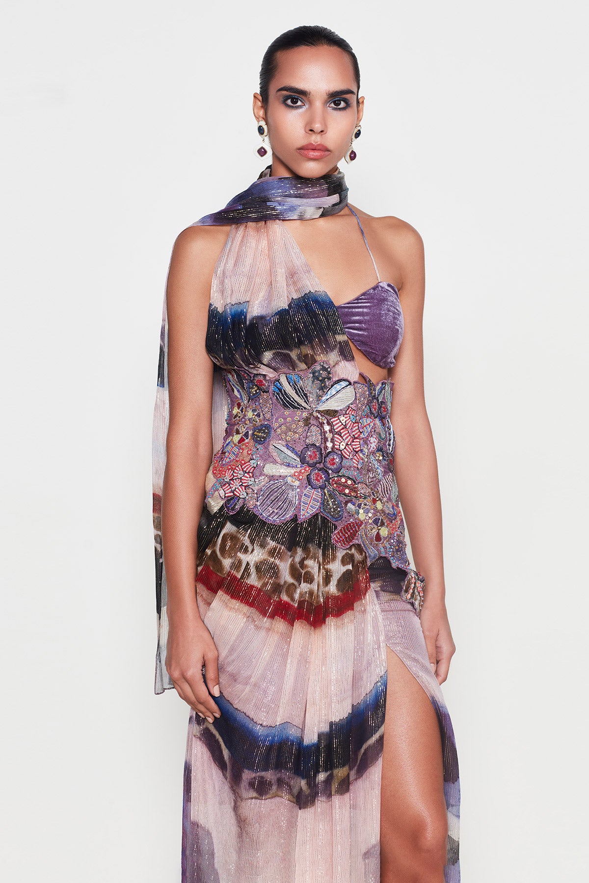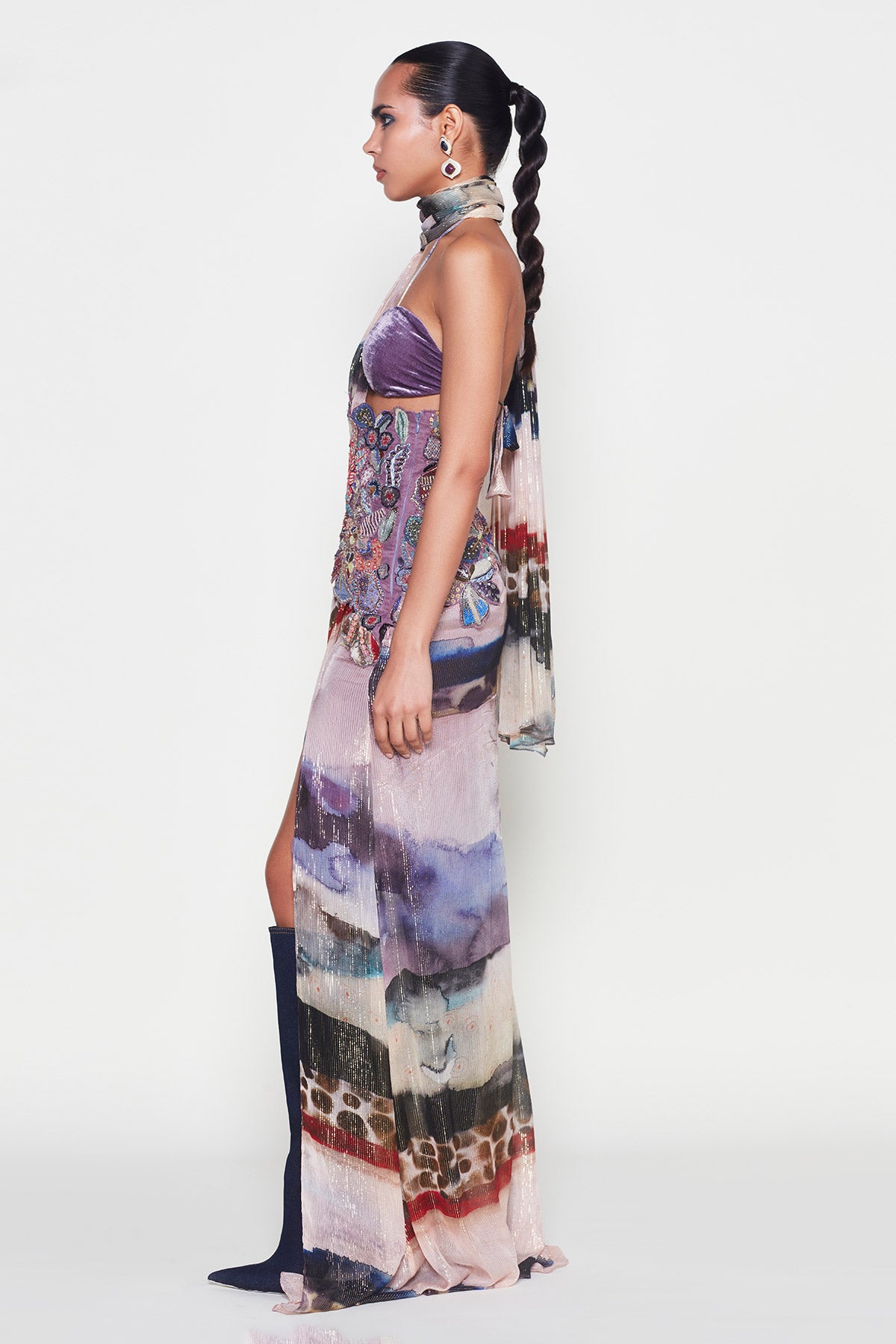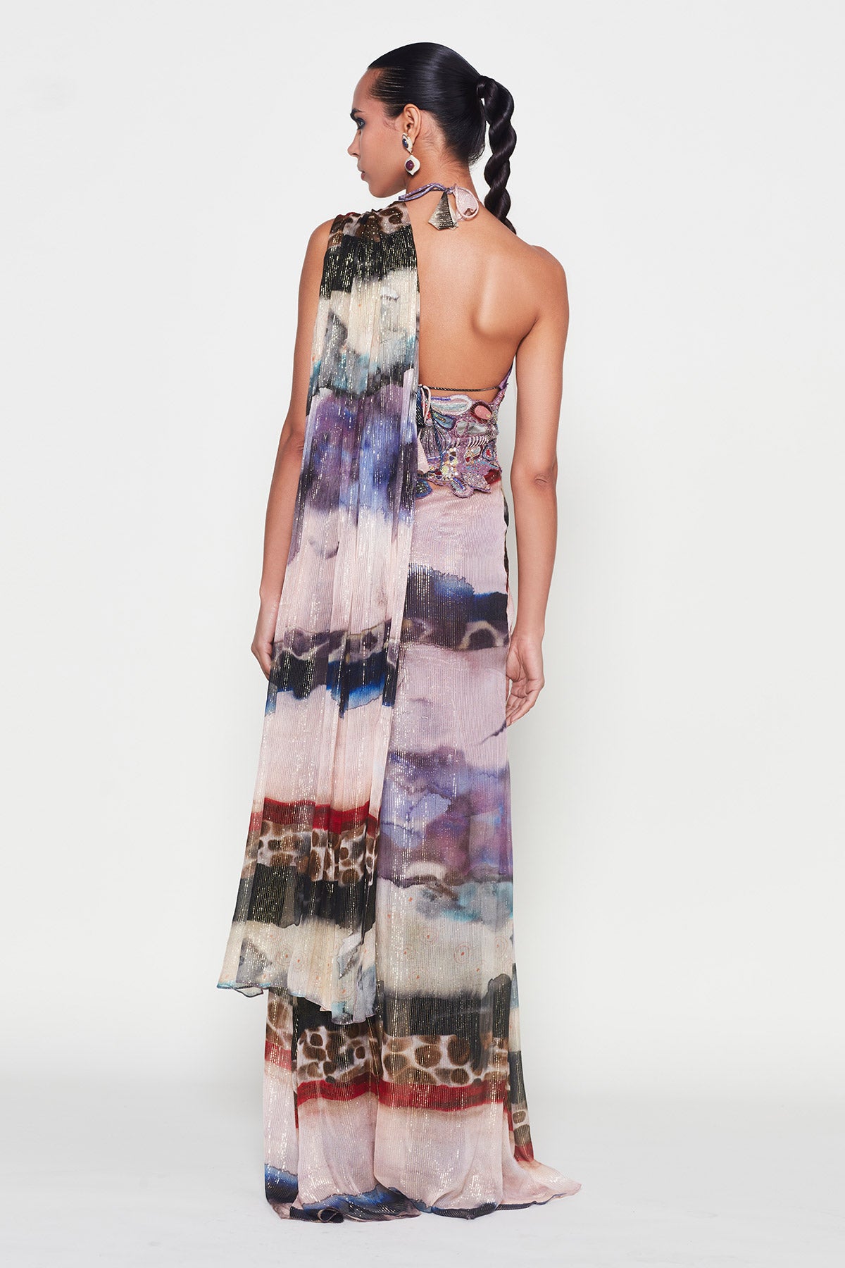 Kinfolk mist purple printed applique embellished corset with lurex pre-draped saree & velvet bralette
