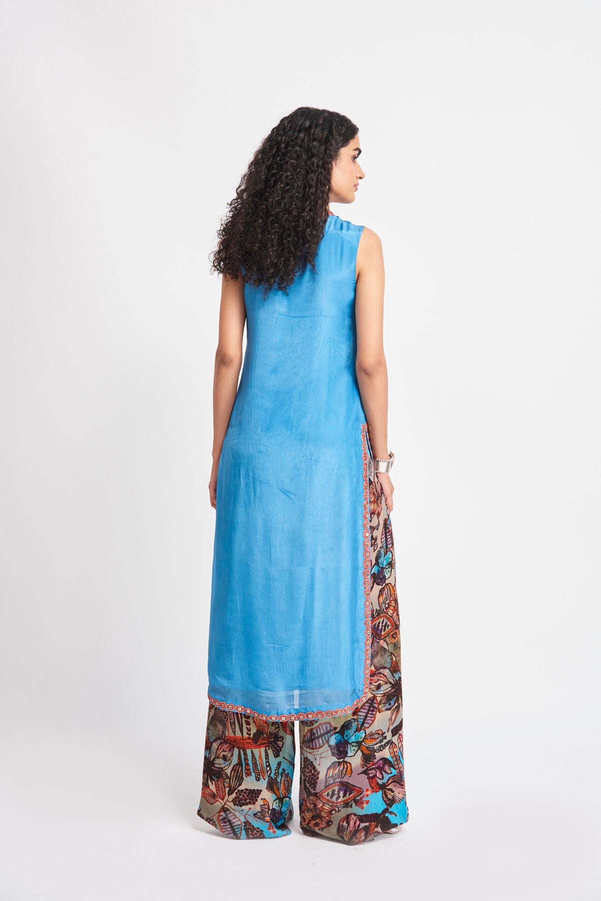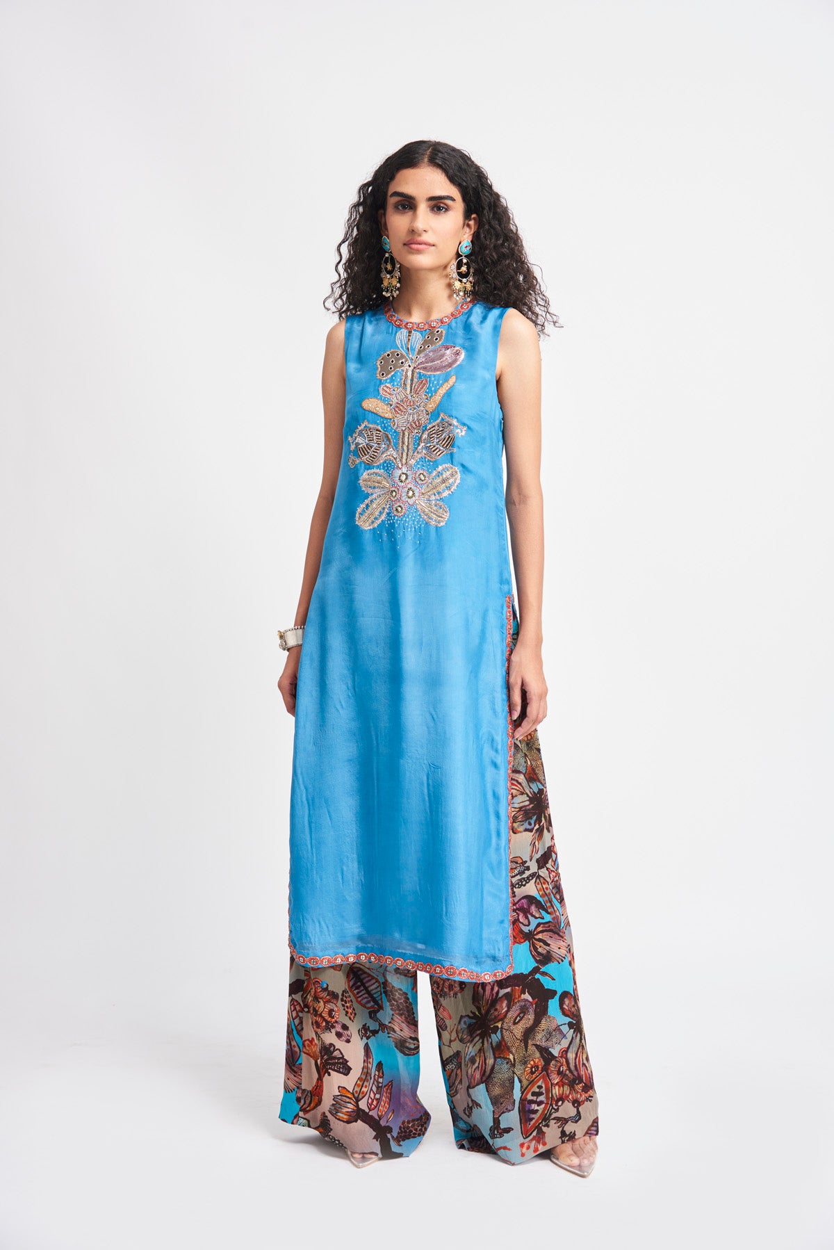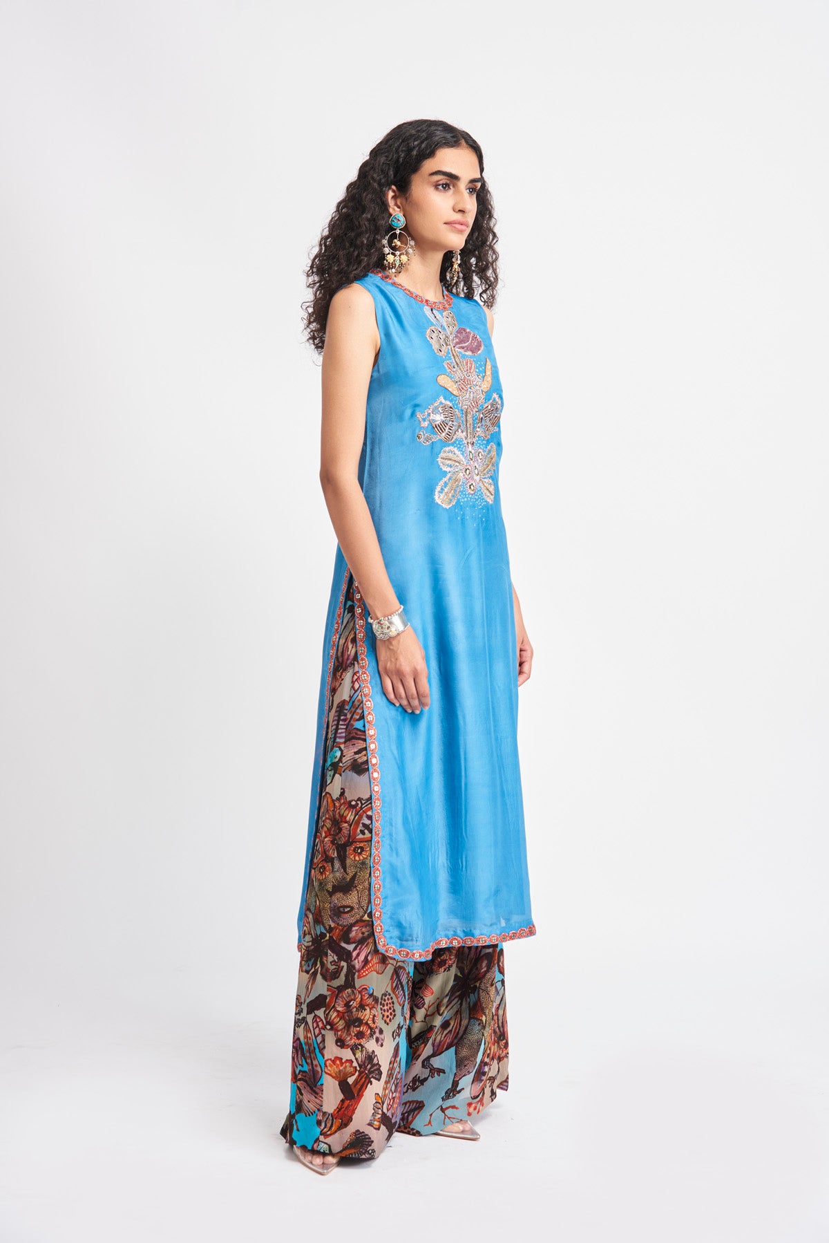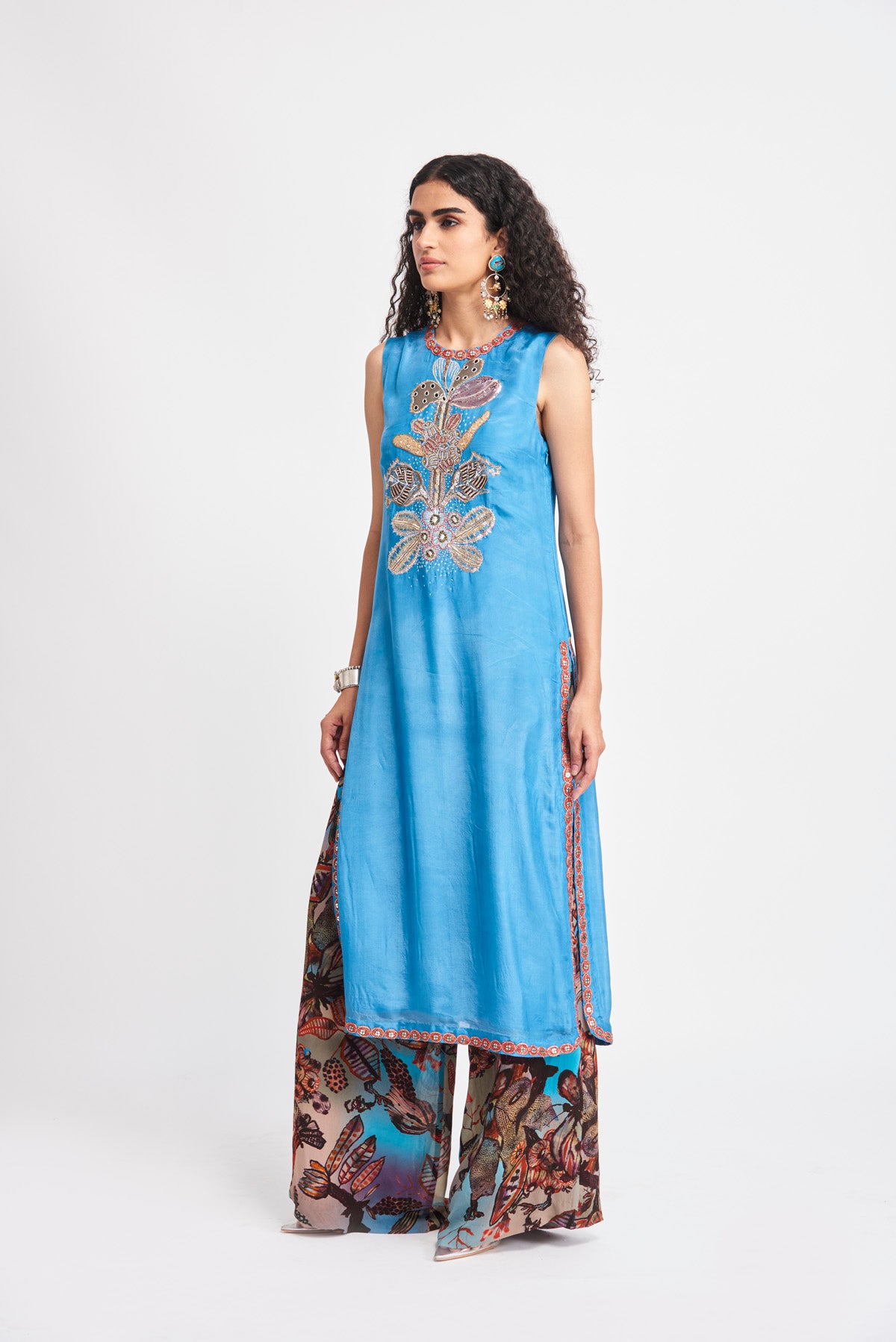 Kinfolk azure blue applique embellished habutai silk long kurta & printed wide leg pants
