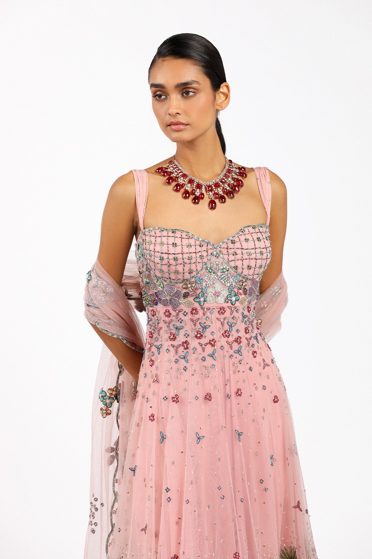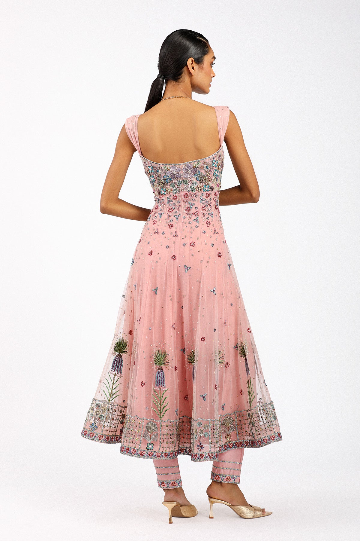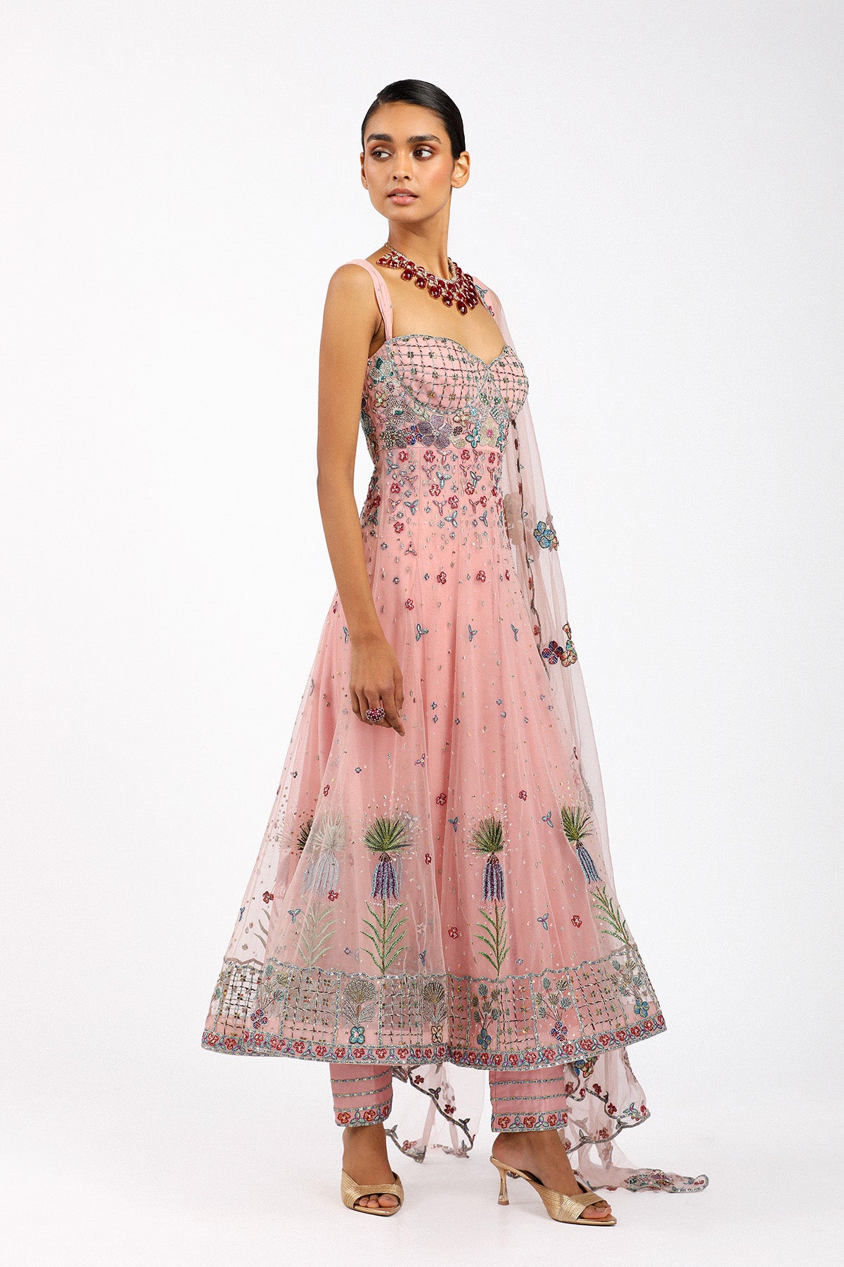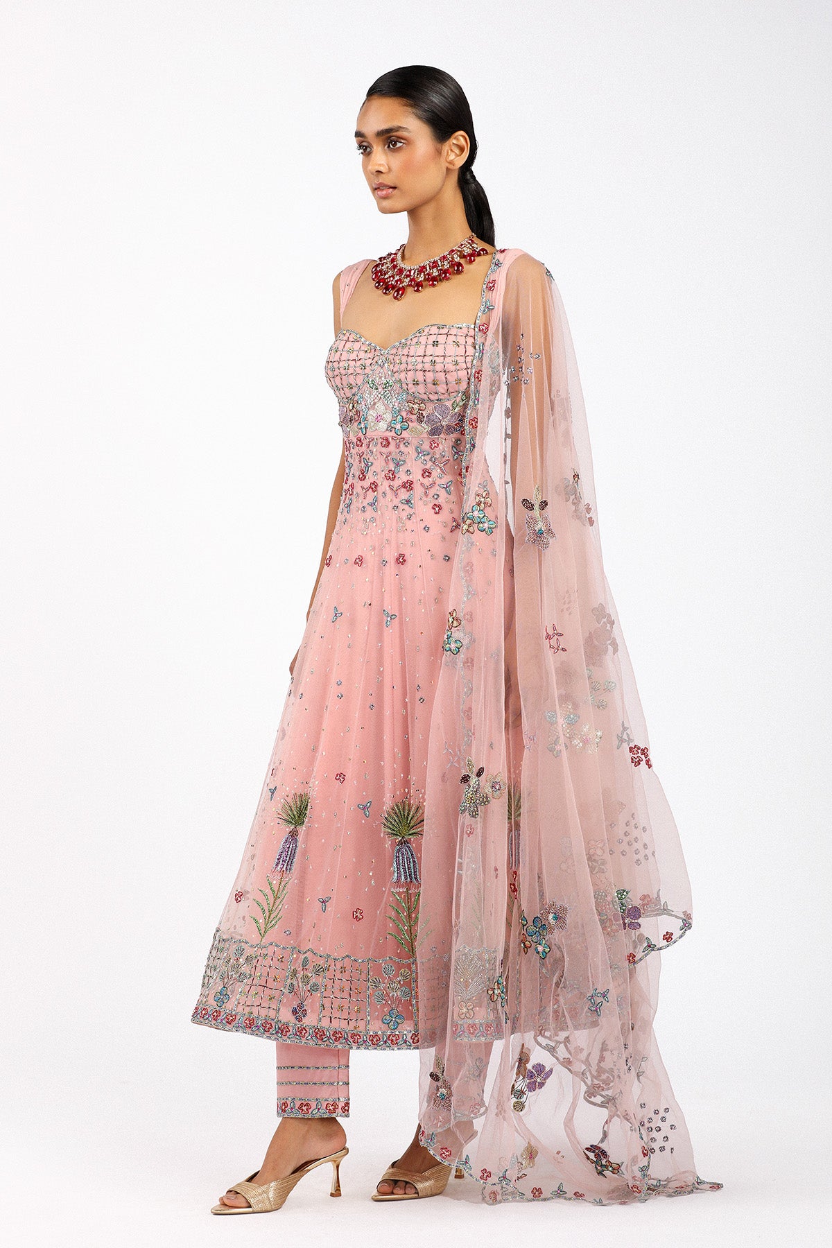 Matilda baby pink applique embellished tulle anarkali kurta with chanderi silk pants & tulle dupatta