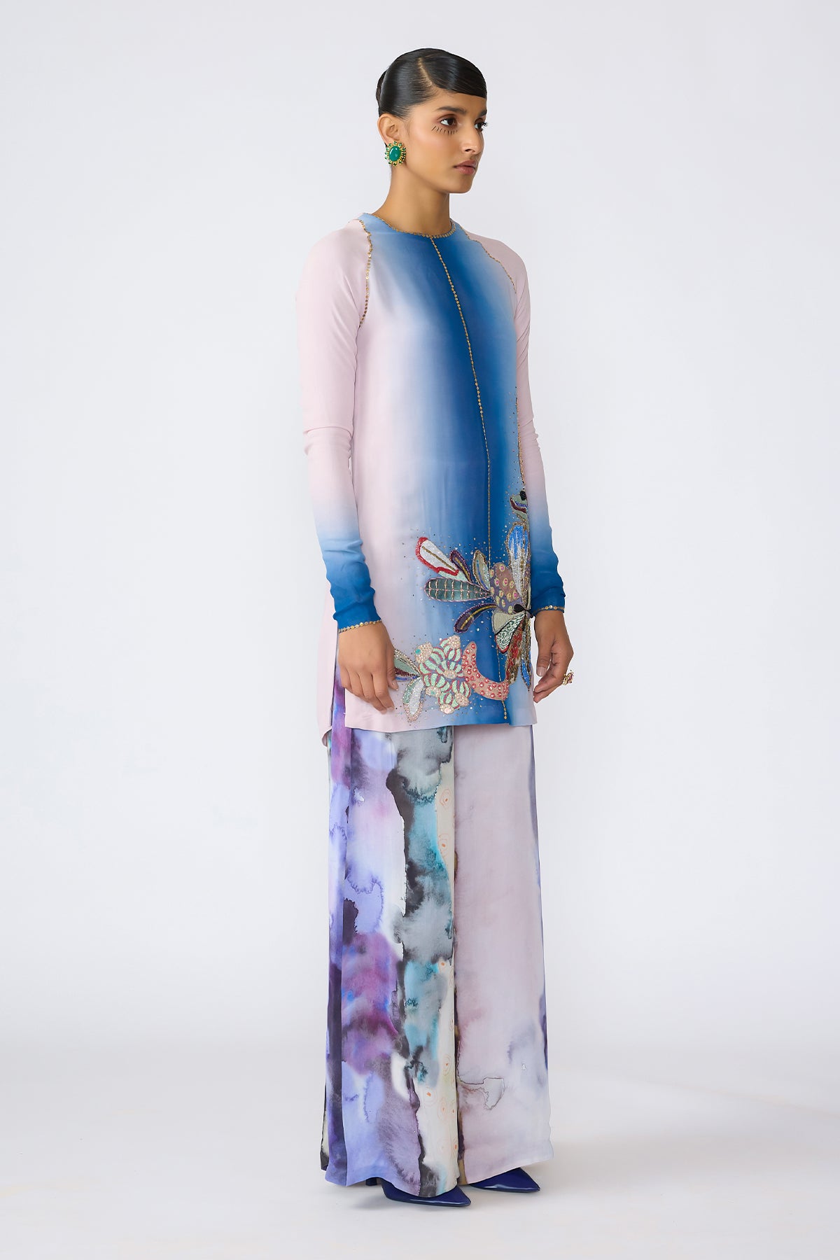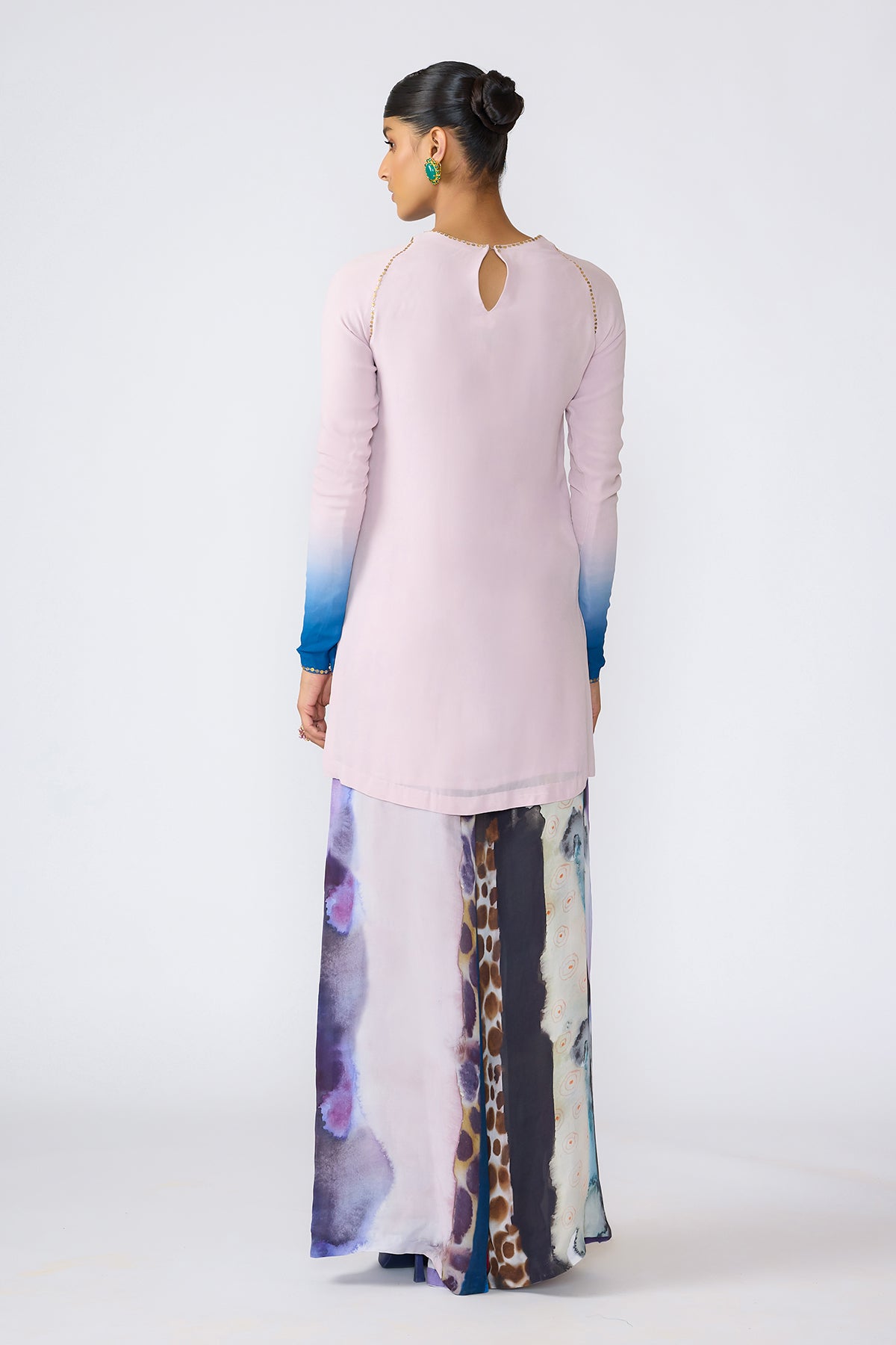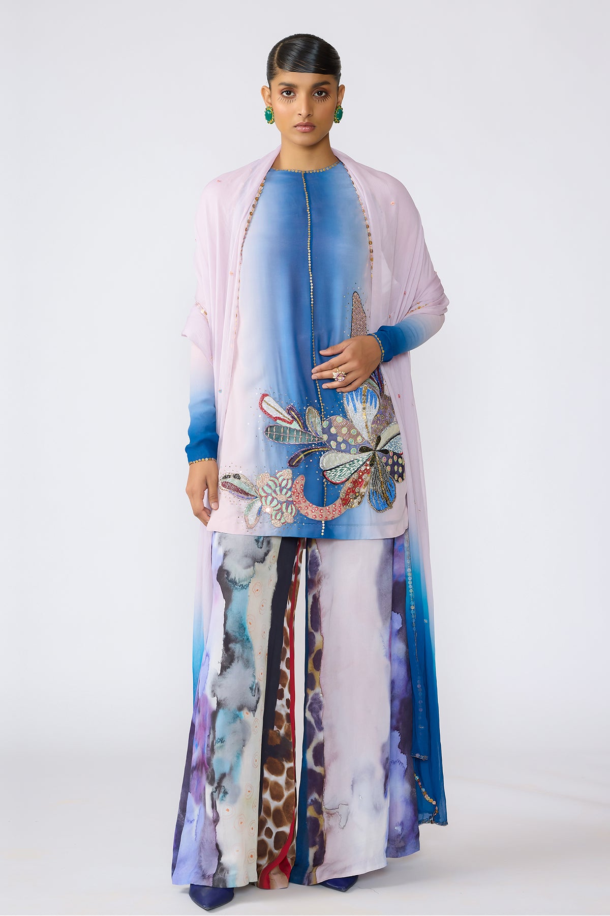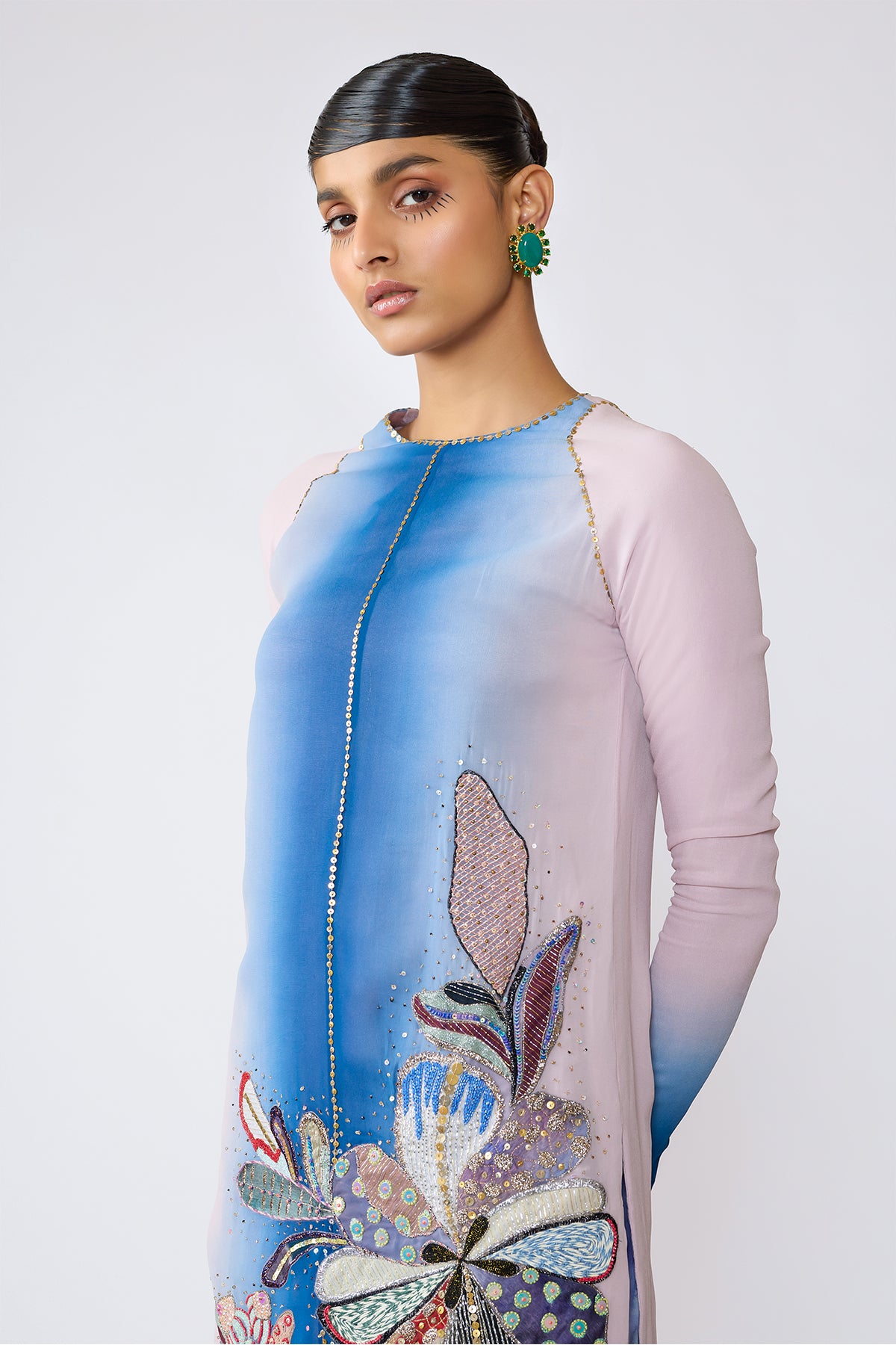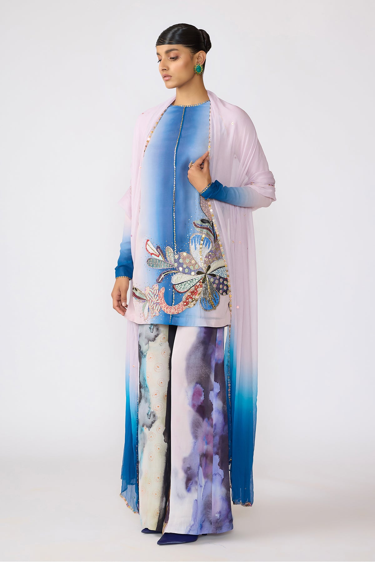 Kinfolk pink- blue ombre applique embellished double georgette short kurta with printed pants & chiffon dupatta.
