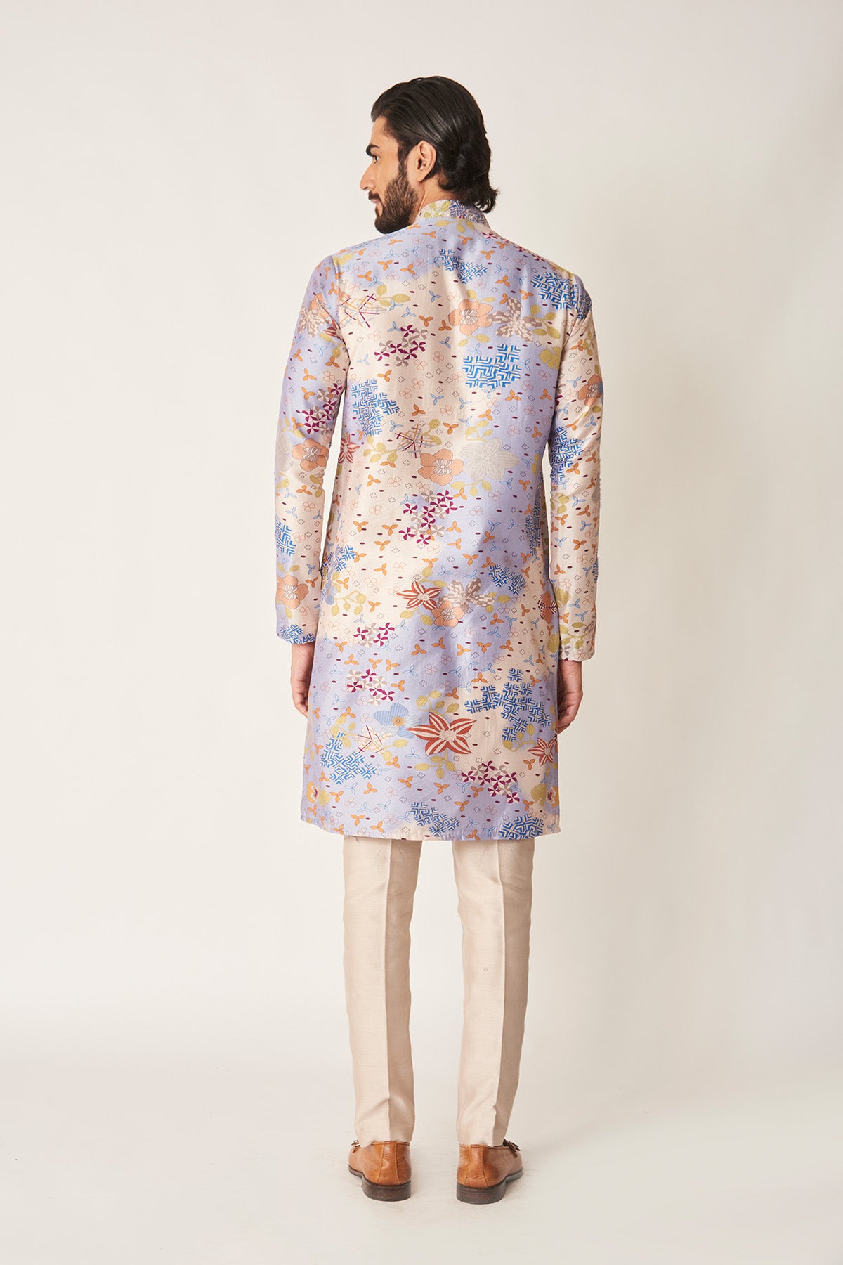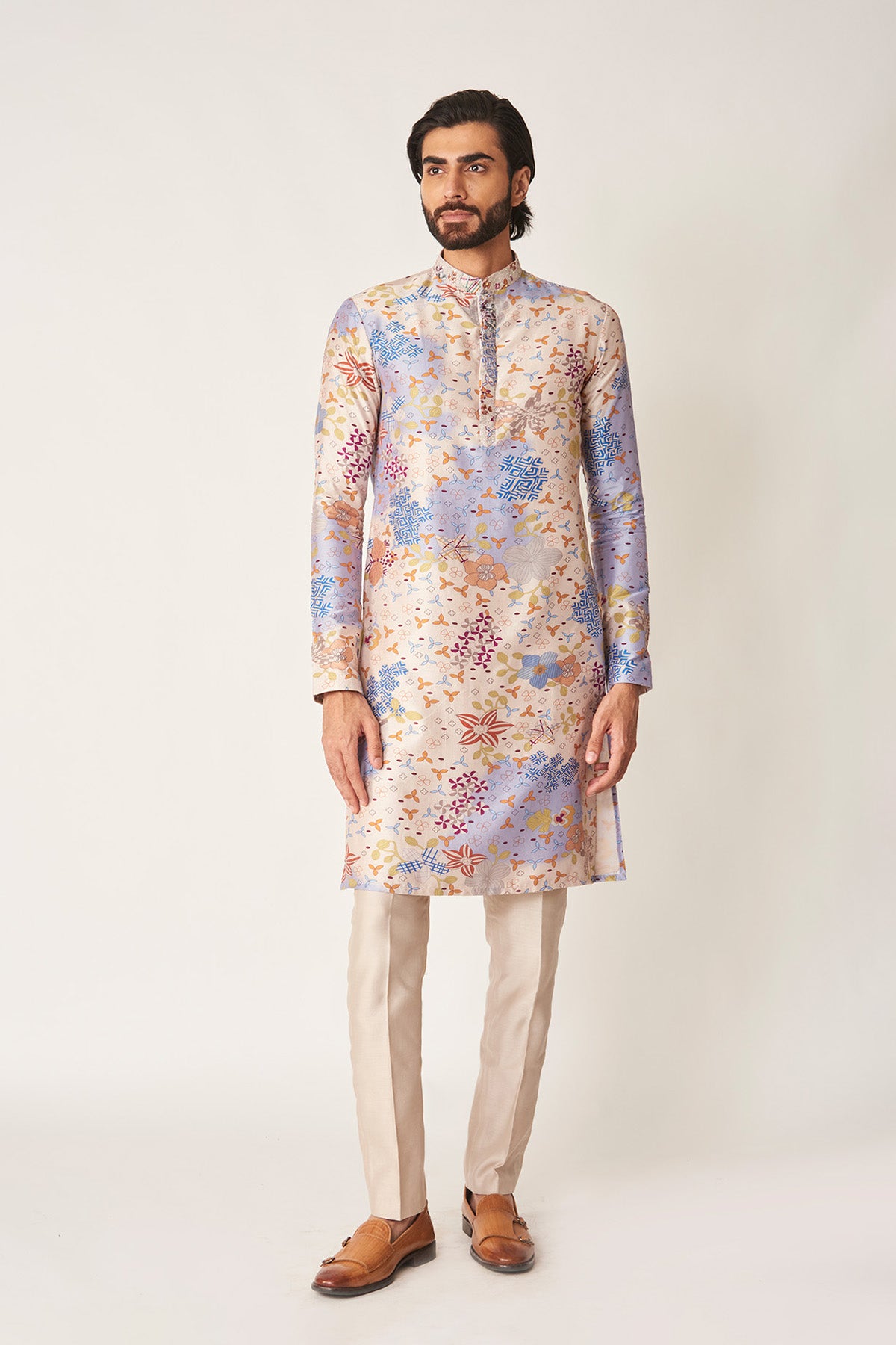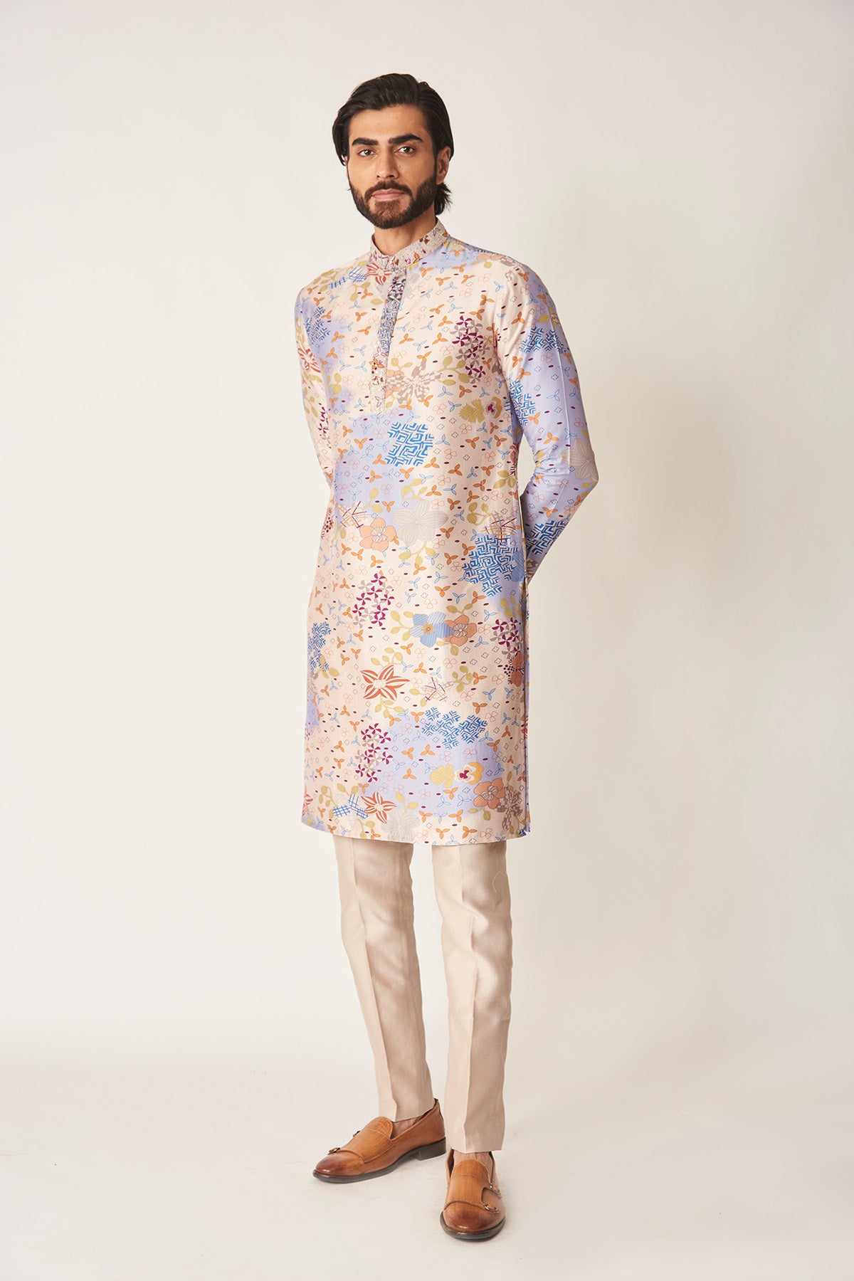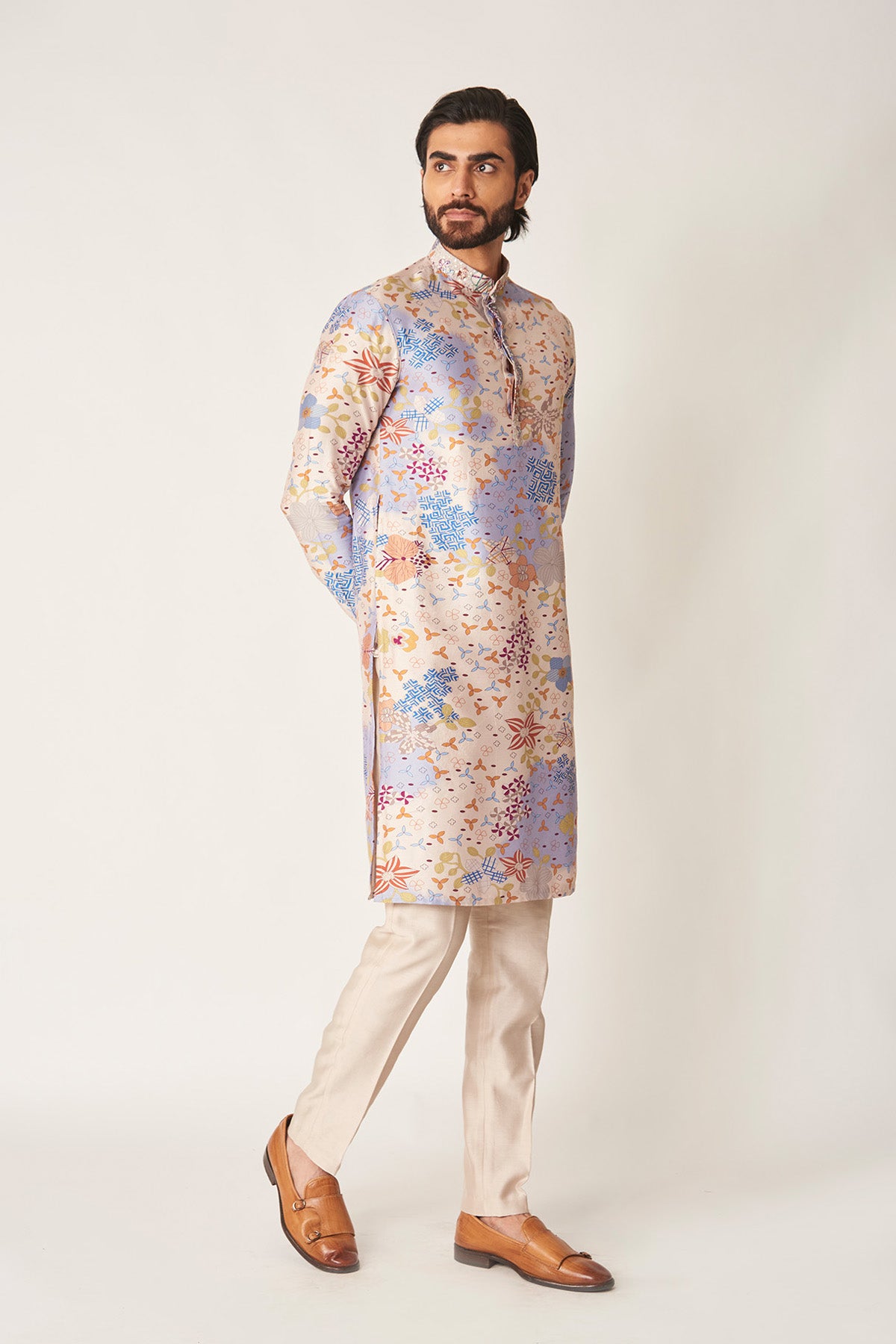 Matilda ivory- blue bell printed embellished chanderi silk straight kurta pants