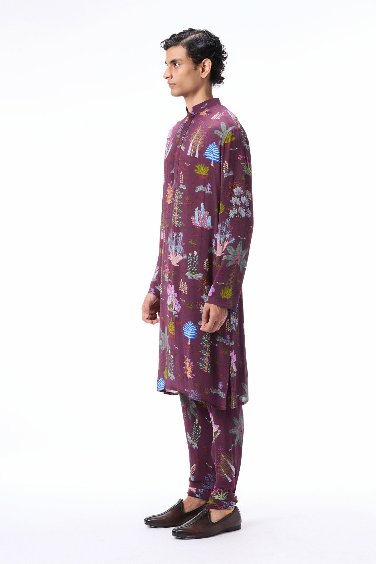 wild at heart Teakberry printed mulberry crepe kurta and pants.