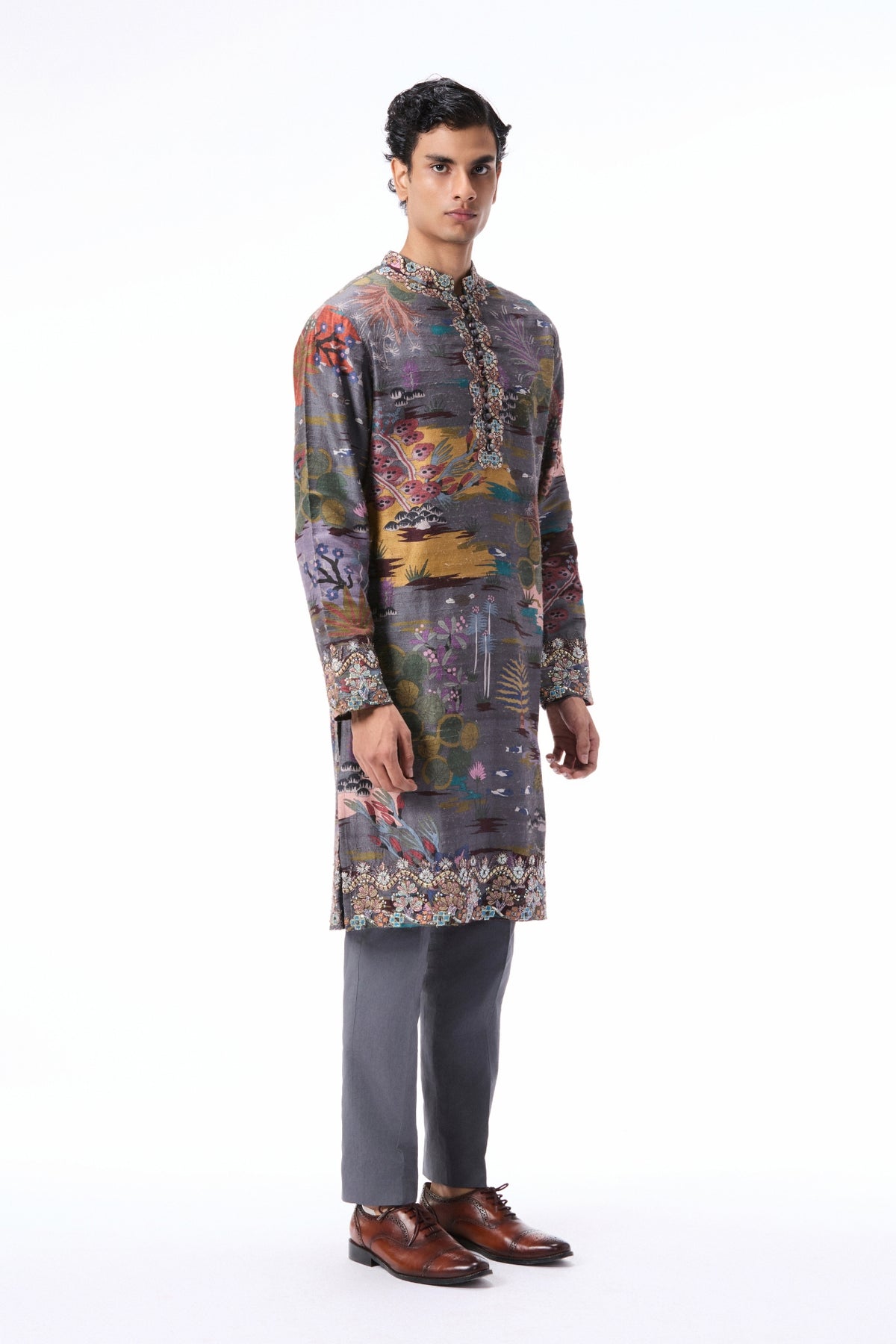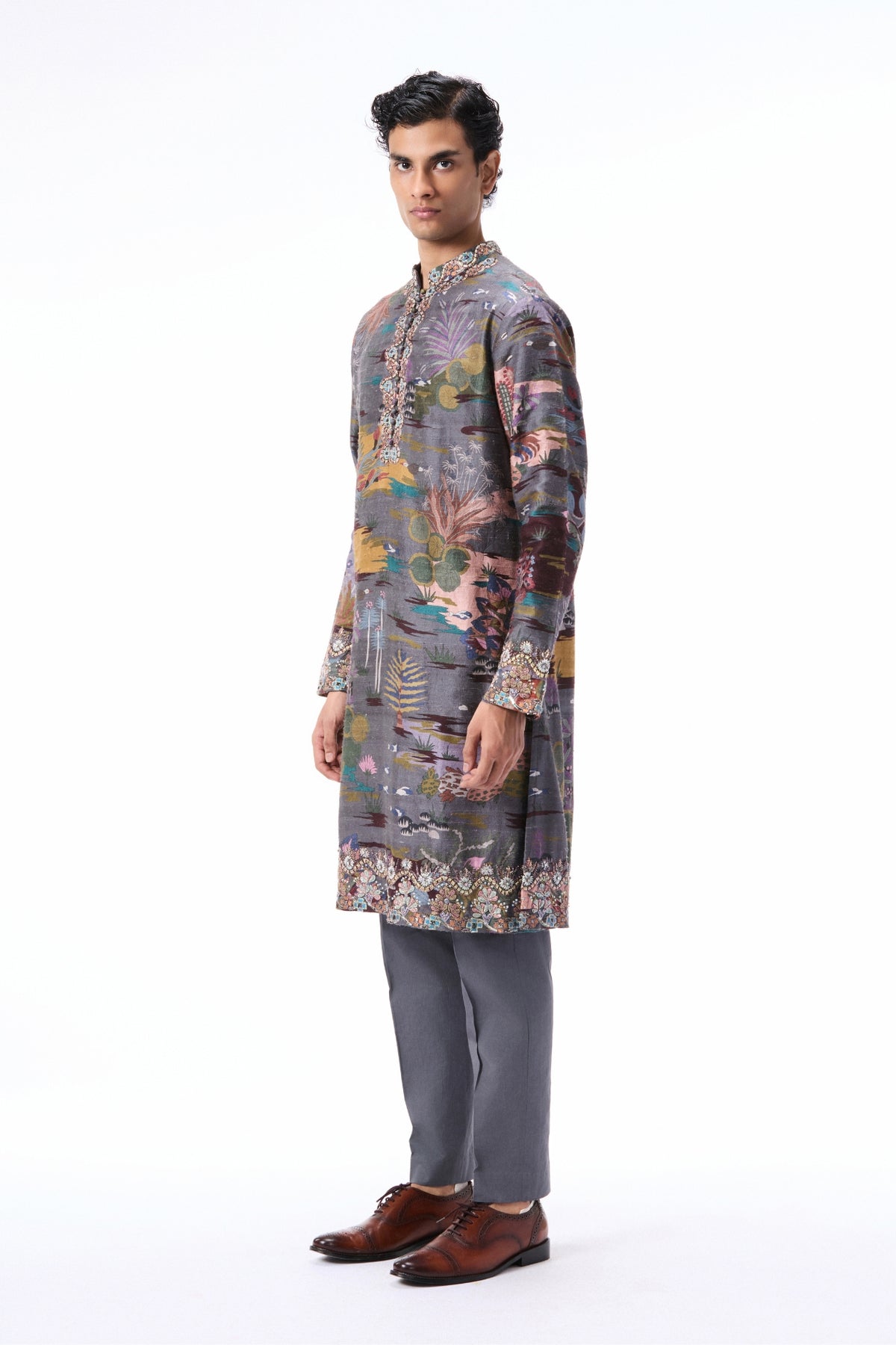 wild at heart gunmetal printed applique embellished Raw silk kurta with twill poplin pants.