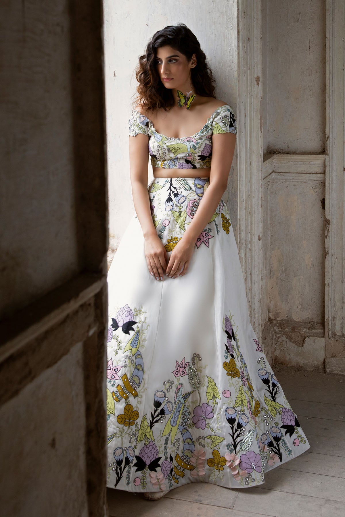 Razzmatazz white applique embellished raw silk LK lehenga with blouse & tulle dupatta