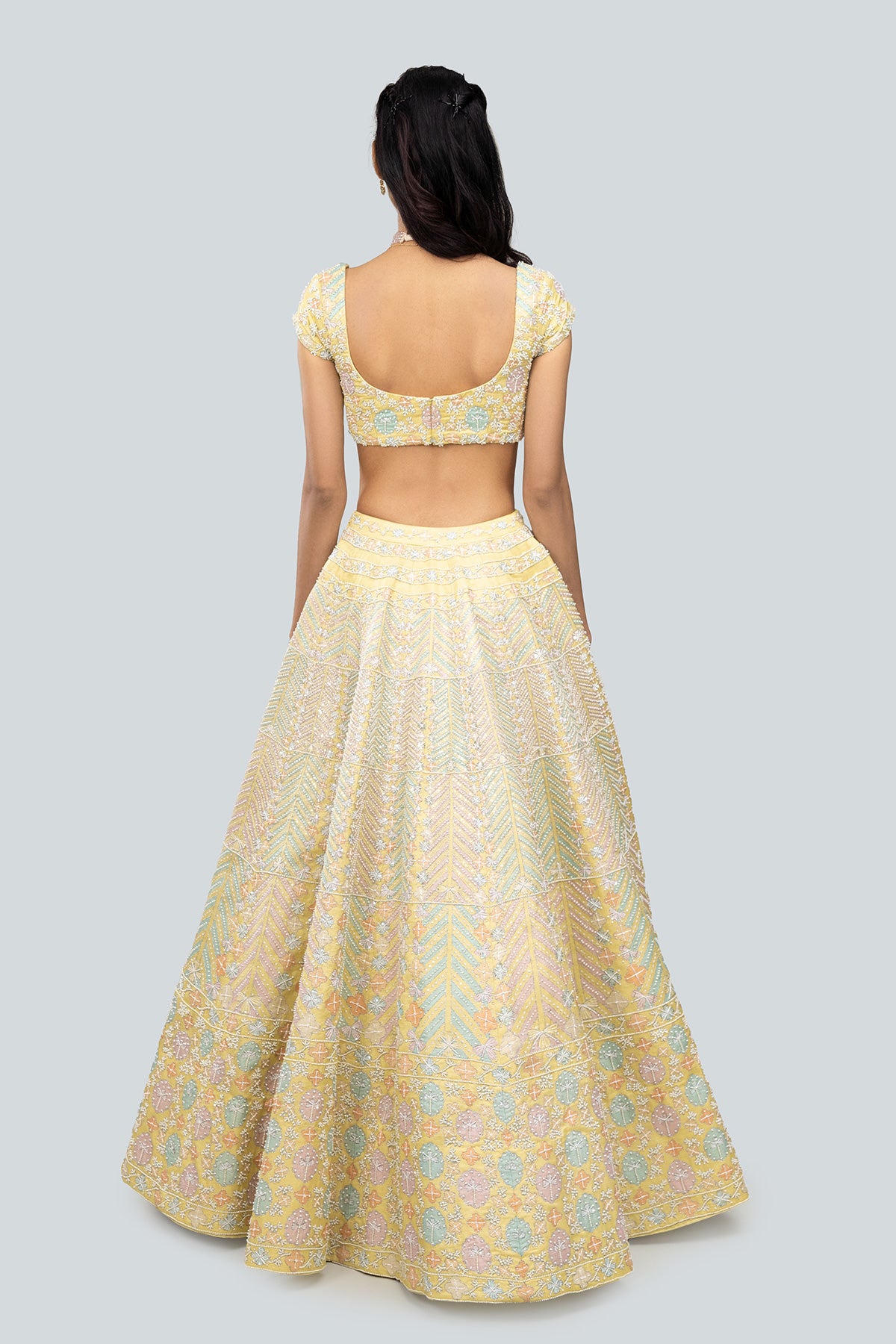 Back view of Maize georgette pearl lehenga, blouse, and dupatta set.