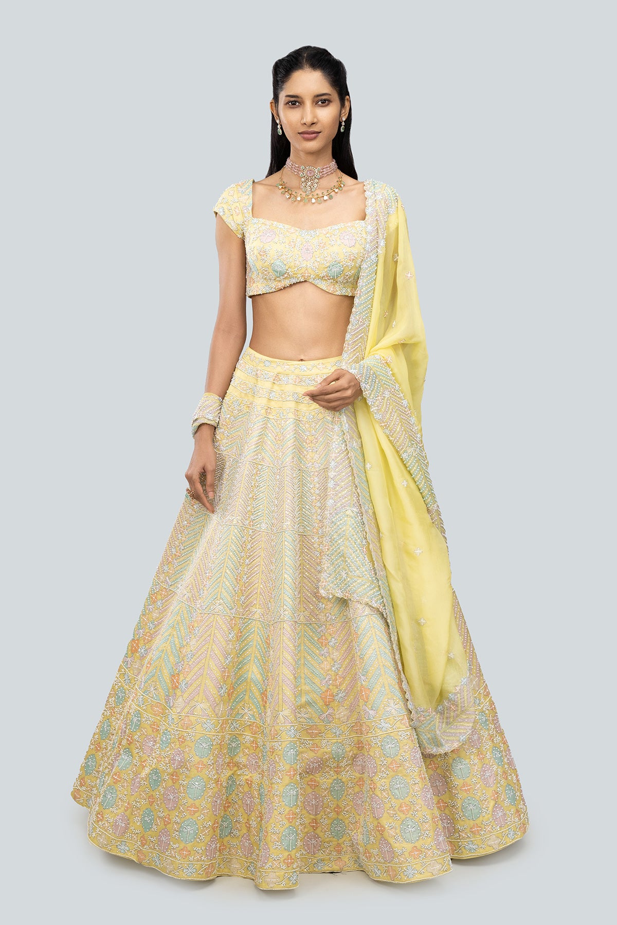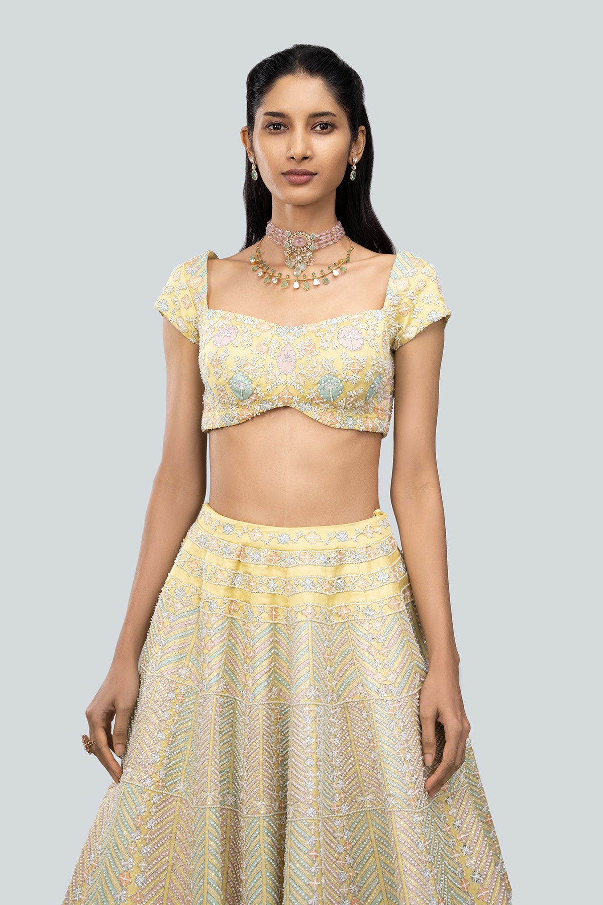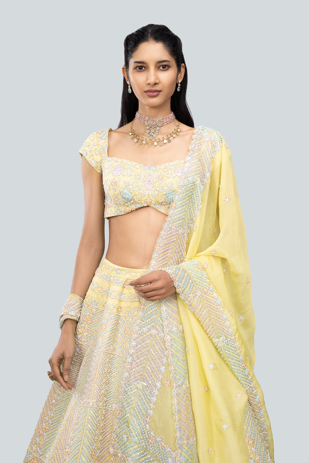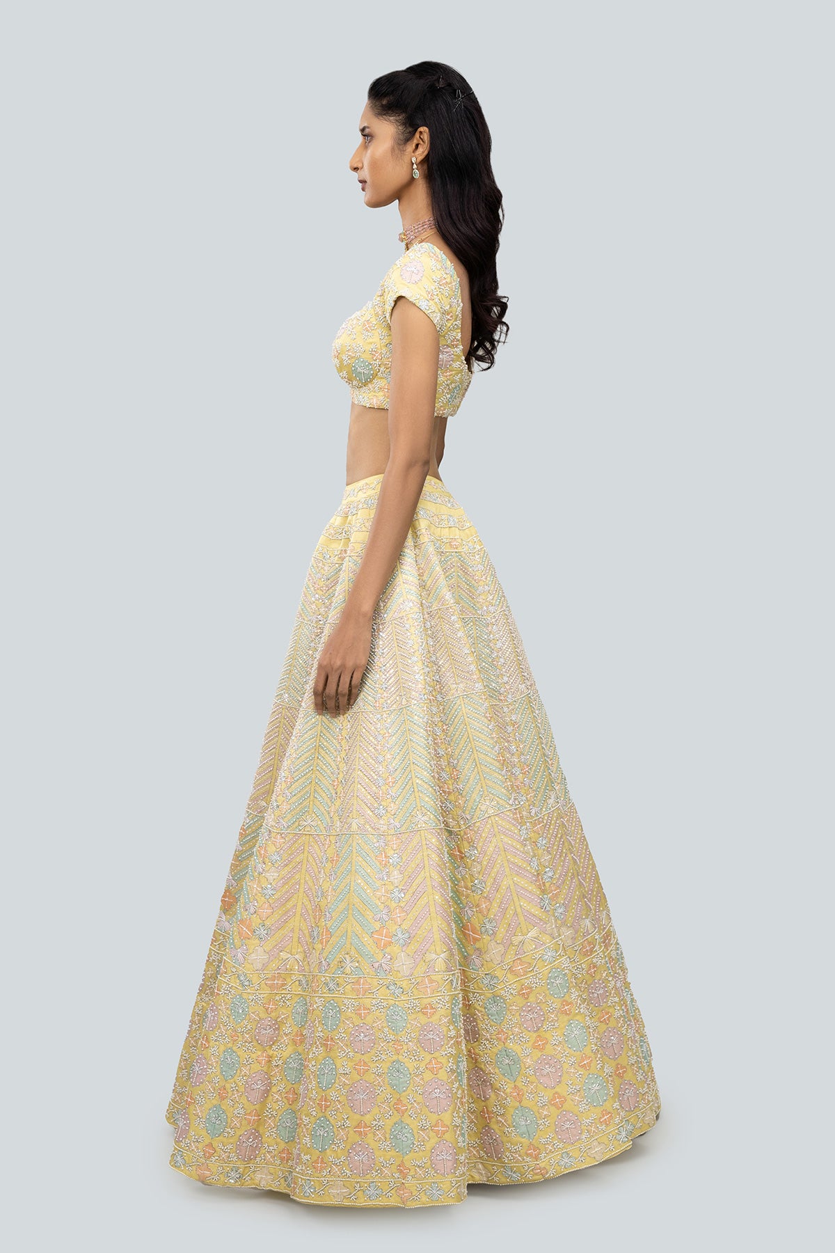 Left profile of Maize embellished lehenga, blouse, and dupatta