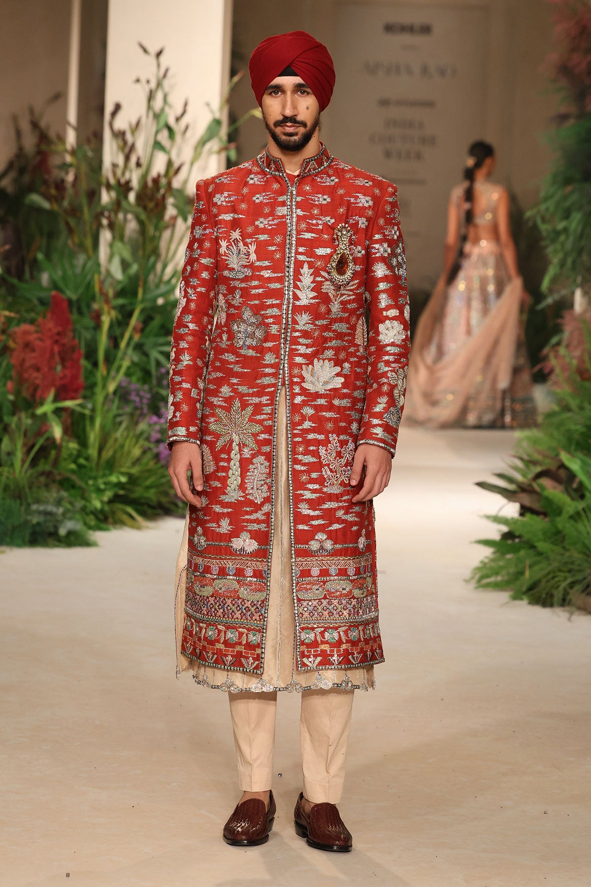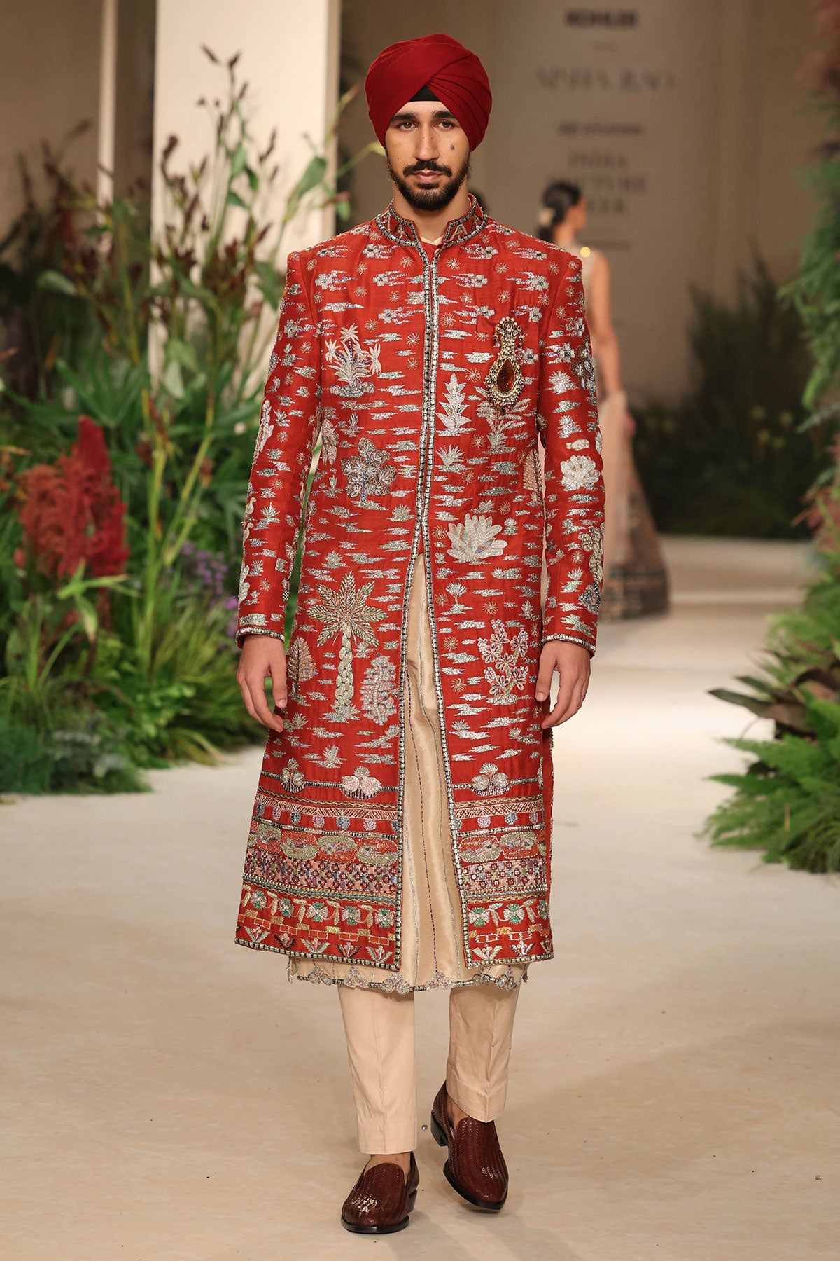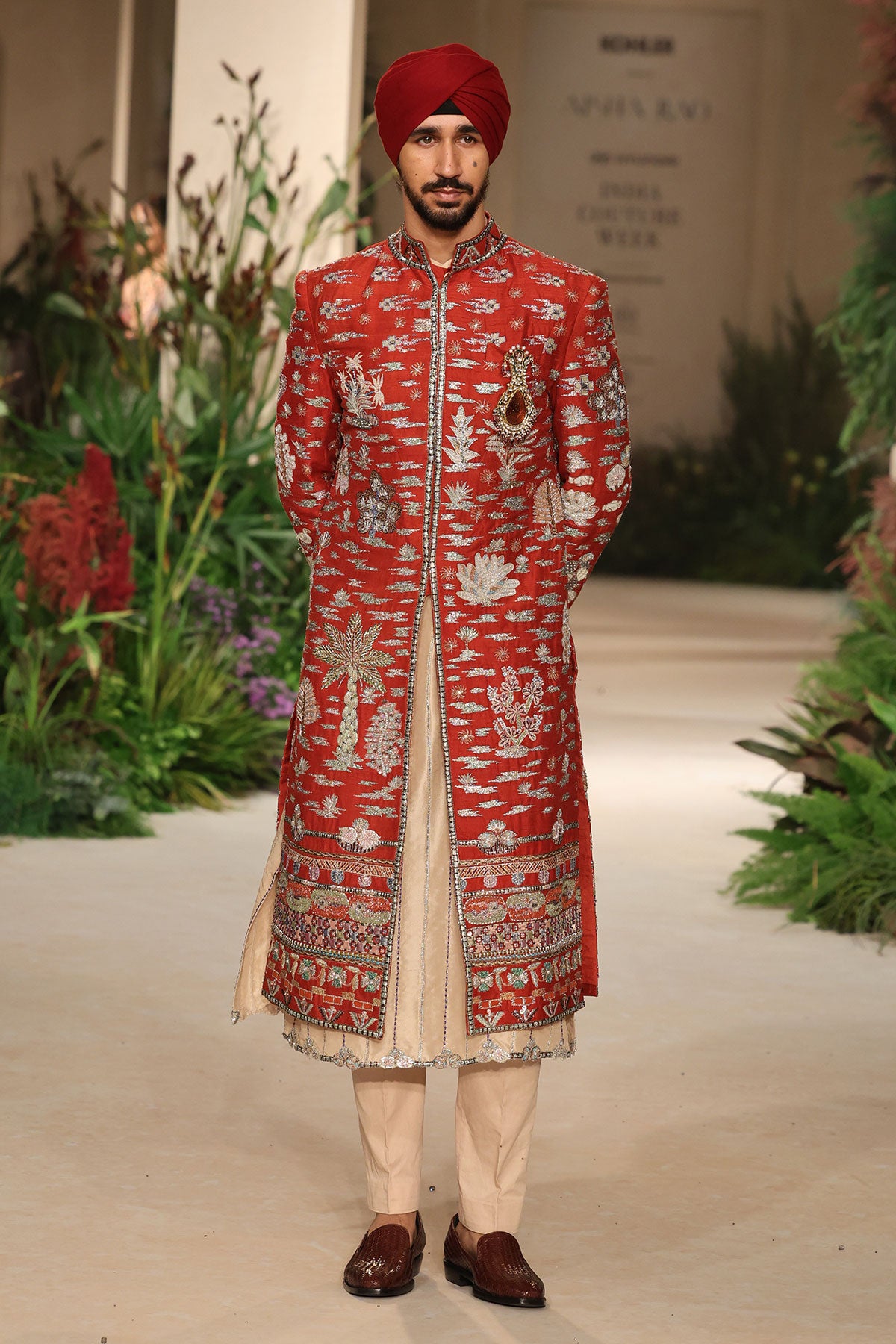 Wild At Heart rust applique embellished raw silk long sherwani set shown in a full couture view