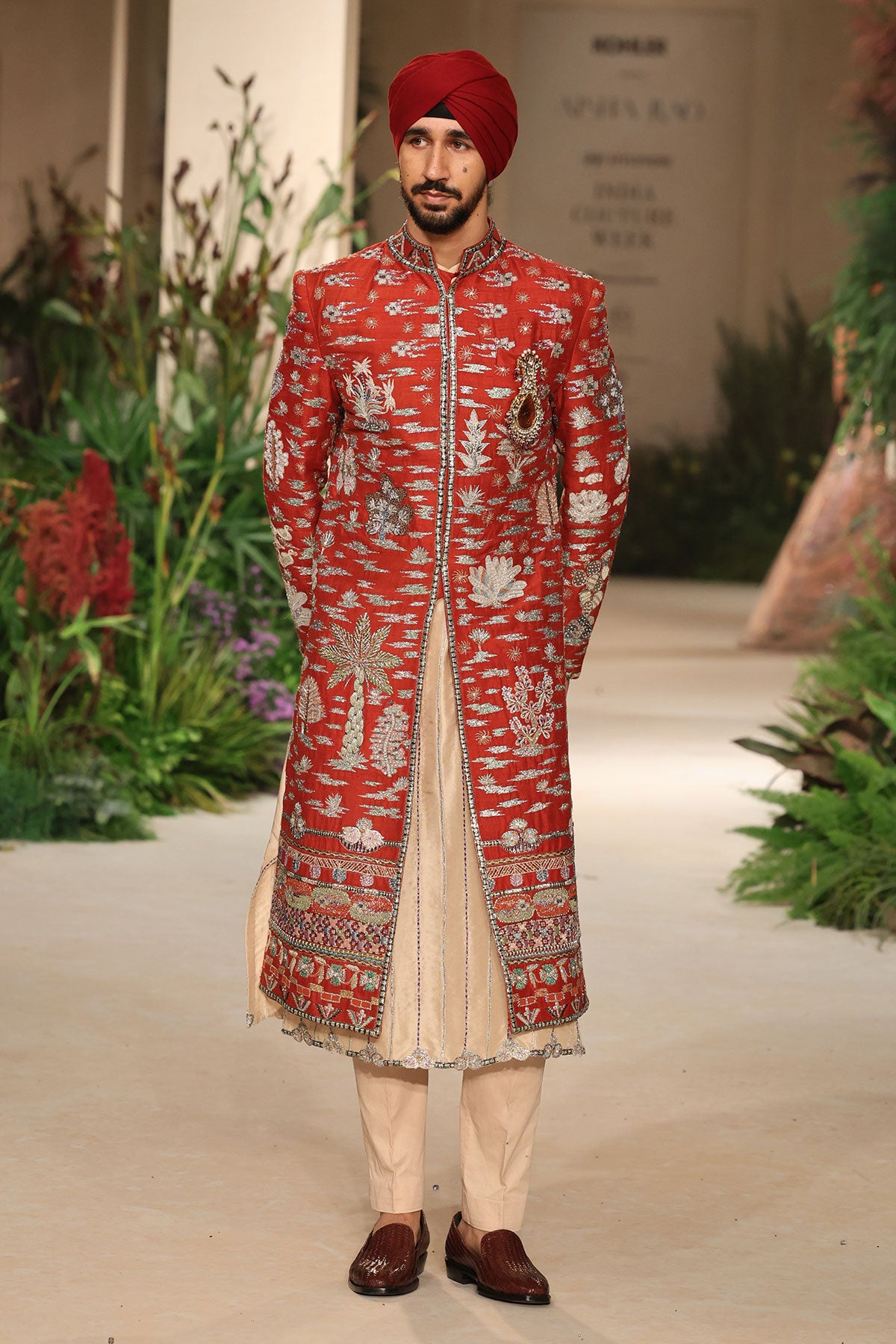Front view of the Wild At Heart rust raw silk long sherwani highlighting applique motifs and refined structure