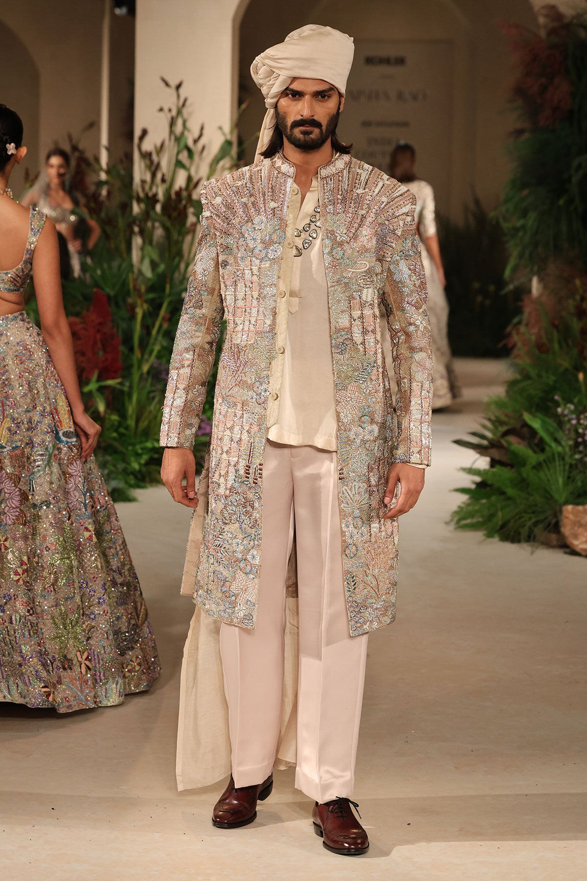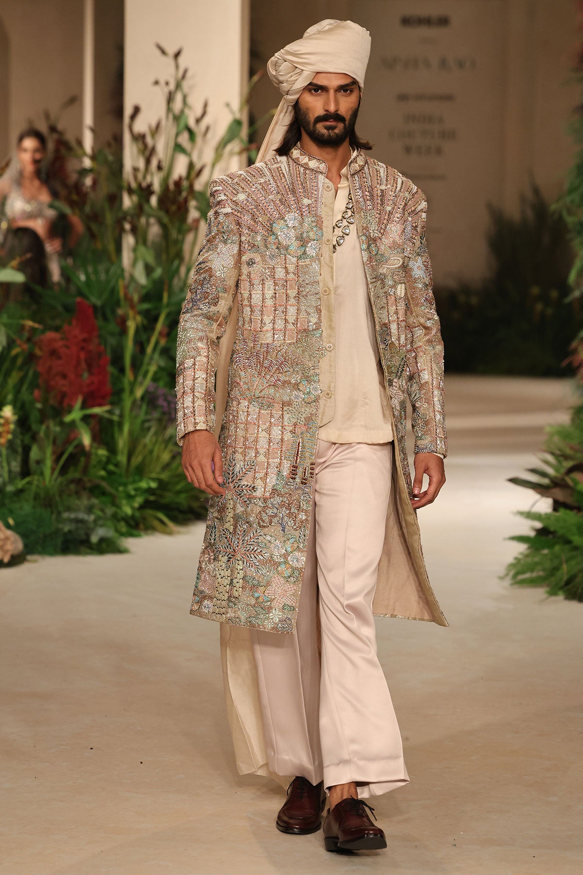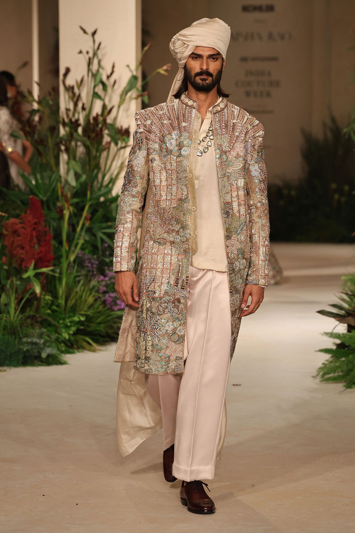 Couture-style look featuring the Wild At Heart light gold tissue sherwani set.